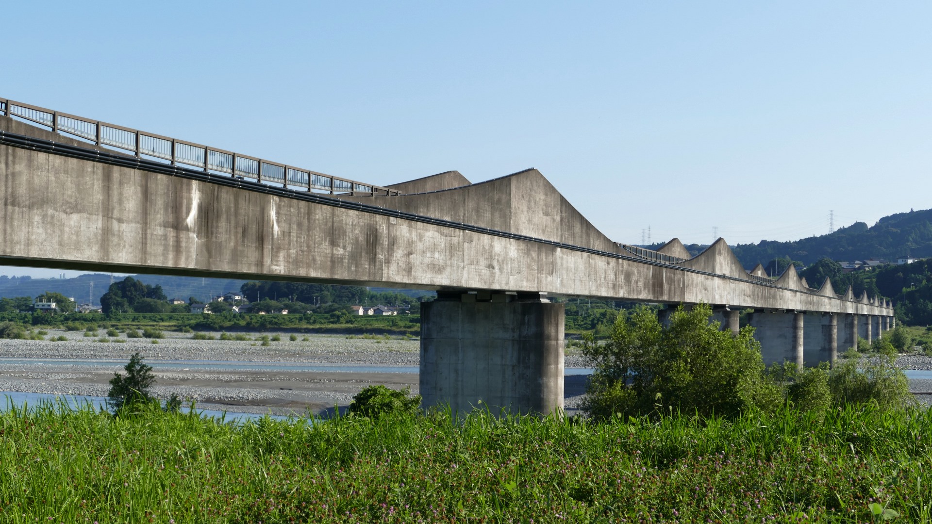 三角ローゼ橋 奥には宇井大橋や清水吊橋が望める。 1997(平成9)年 橋長94m | 鋼単純下路式ニールセンローゼ橋 1996(平成8)年 橋長198m |