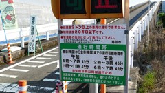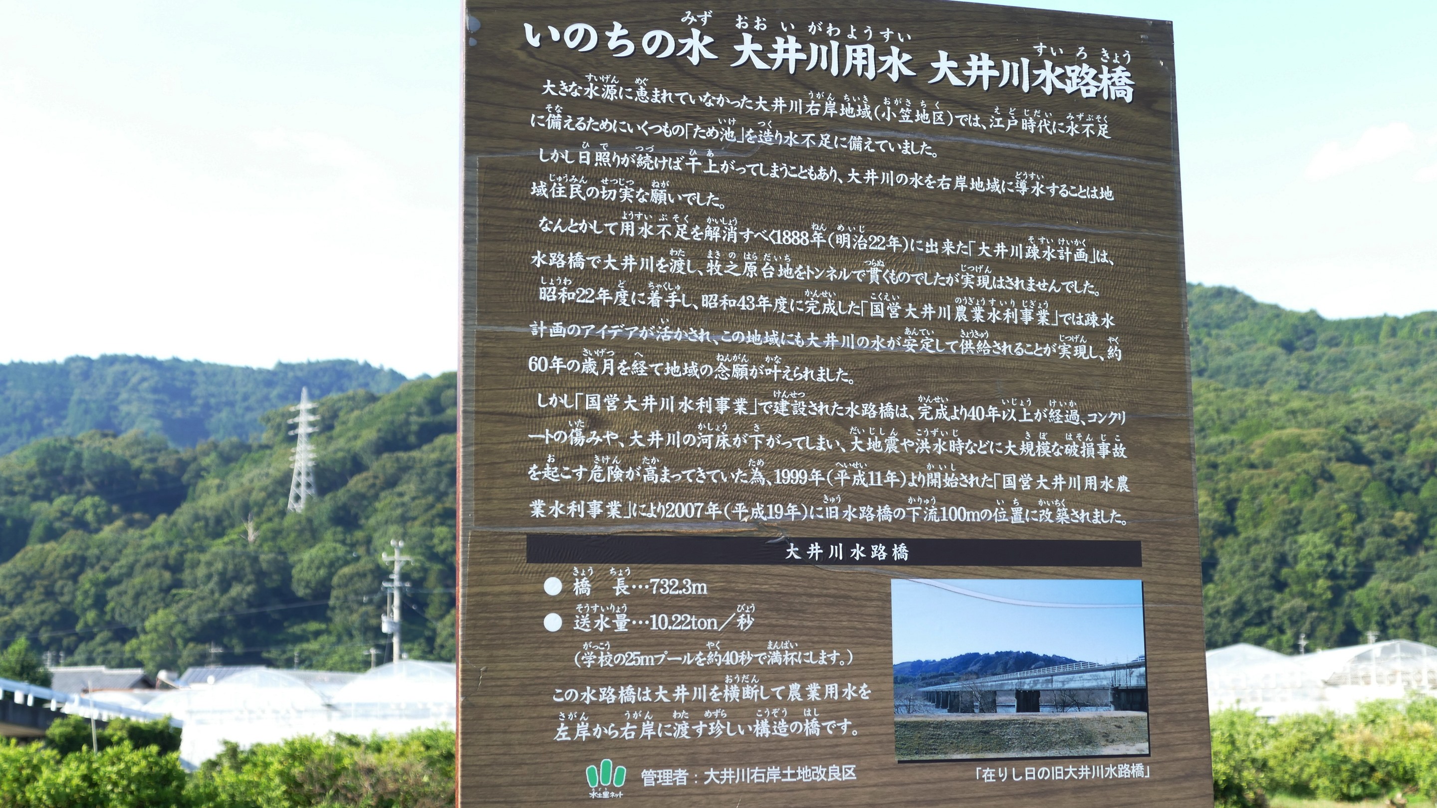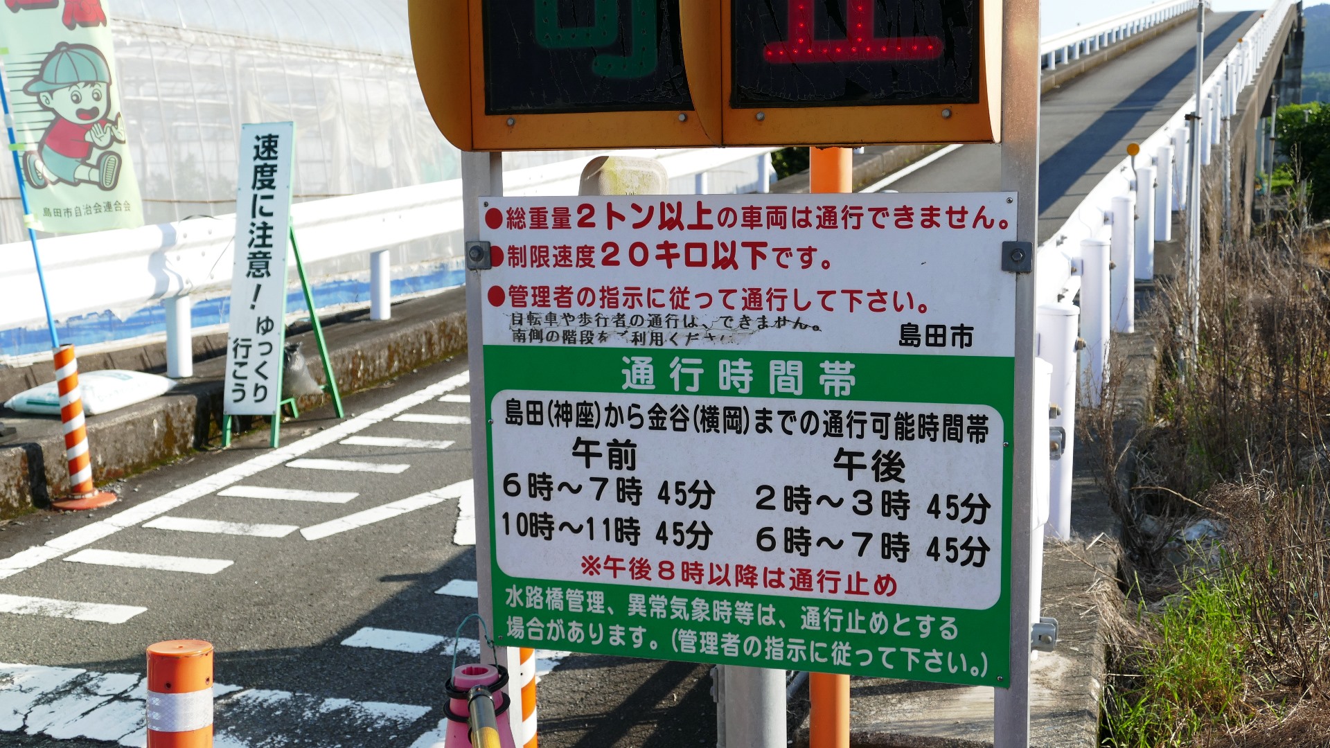 | 農業用水を大井川左岸から右岸に渡す水路橋に人や車も通行可能となった橋。橋幅が狭く歩行者帯もあることにより車両一方通行であるが、時間帯により薦める方向が変わるレアな橋。誤侵入を防ぐため監視員が置かれている。20時〜翌朝6時までは歩行者とも通行不可 案内板 2024.7 | |||||||