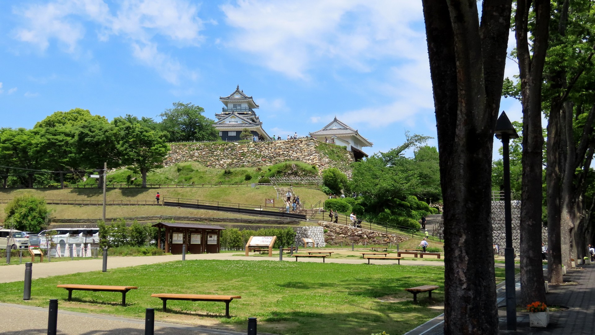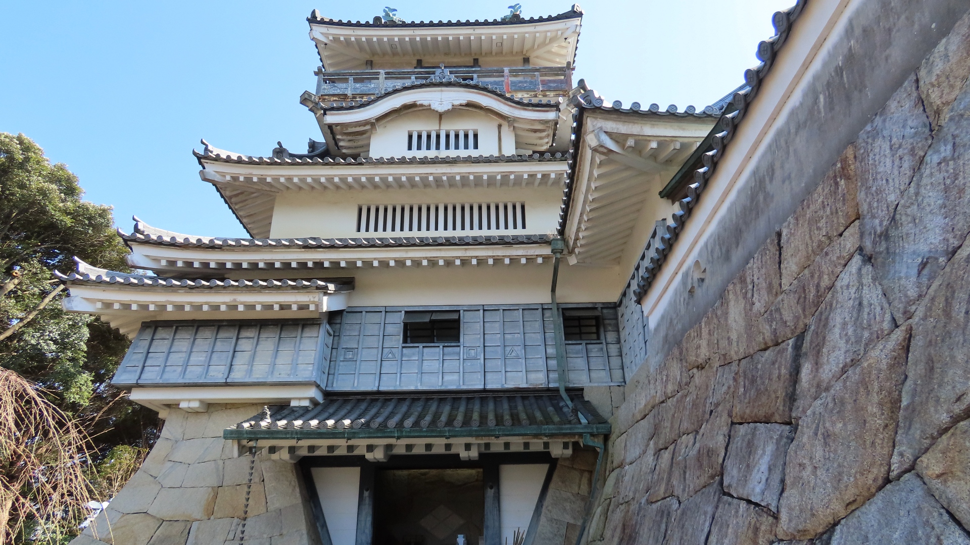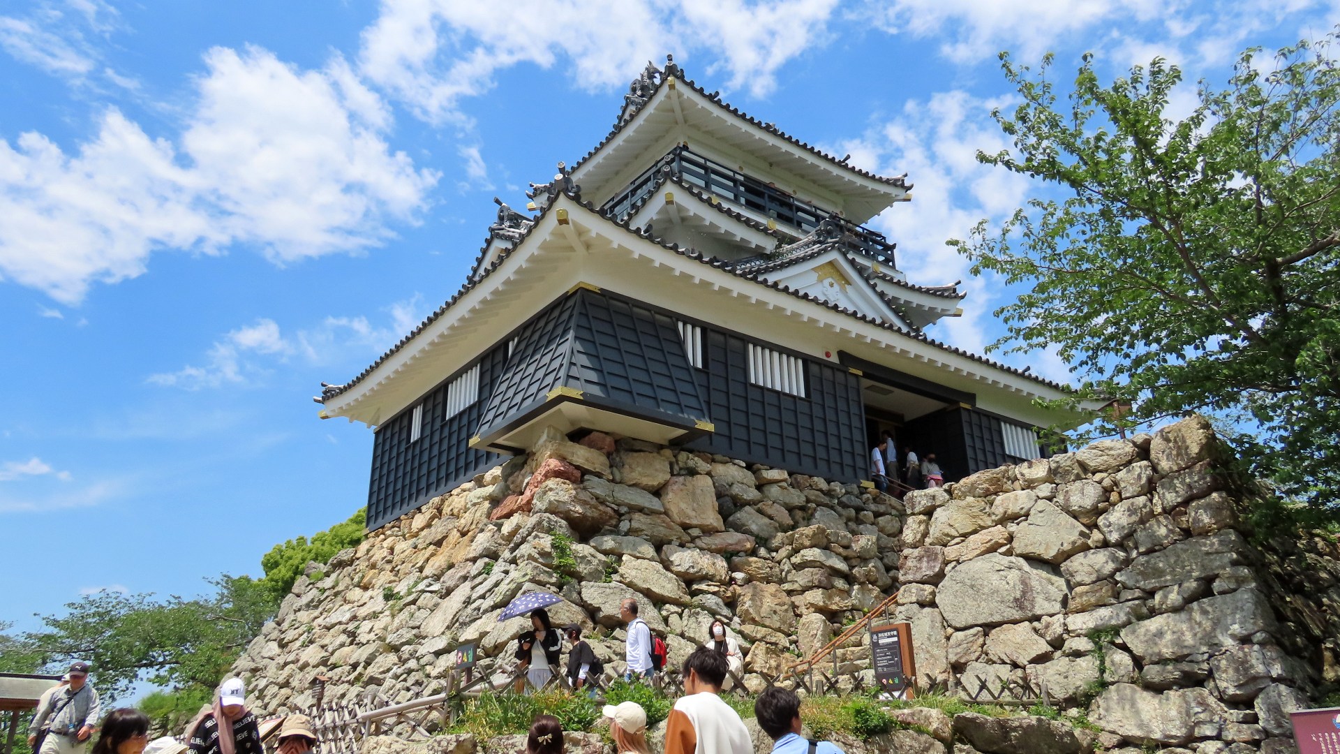 | 京極坂を登ると、本丸と天守へ。天守は四国に残る現存天守の中で最も古い1660年に完成。唐破風や千鳥破風を巧みに配置し白塗壁とあいまって小ぶりながらキレイなお城。天守最上階から瀬戸大橋も眺望でき絶景。 | |||||||