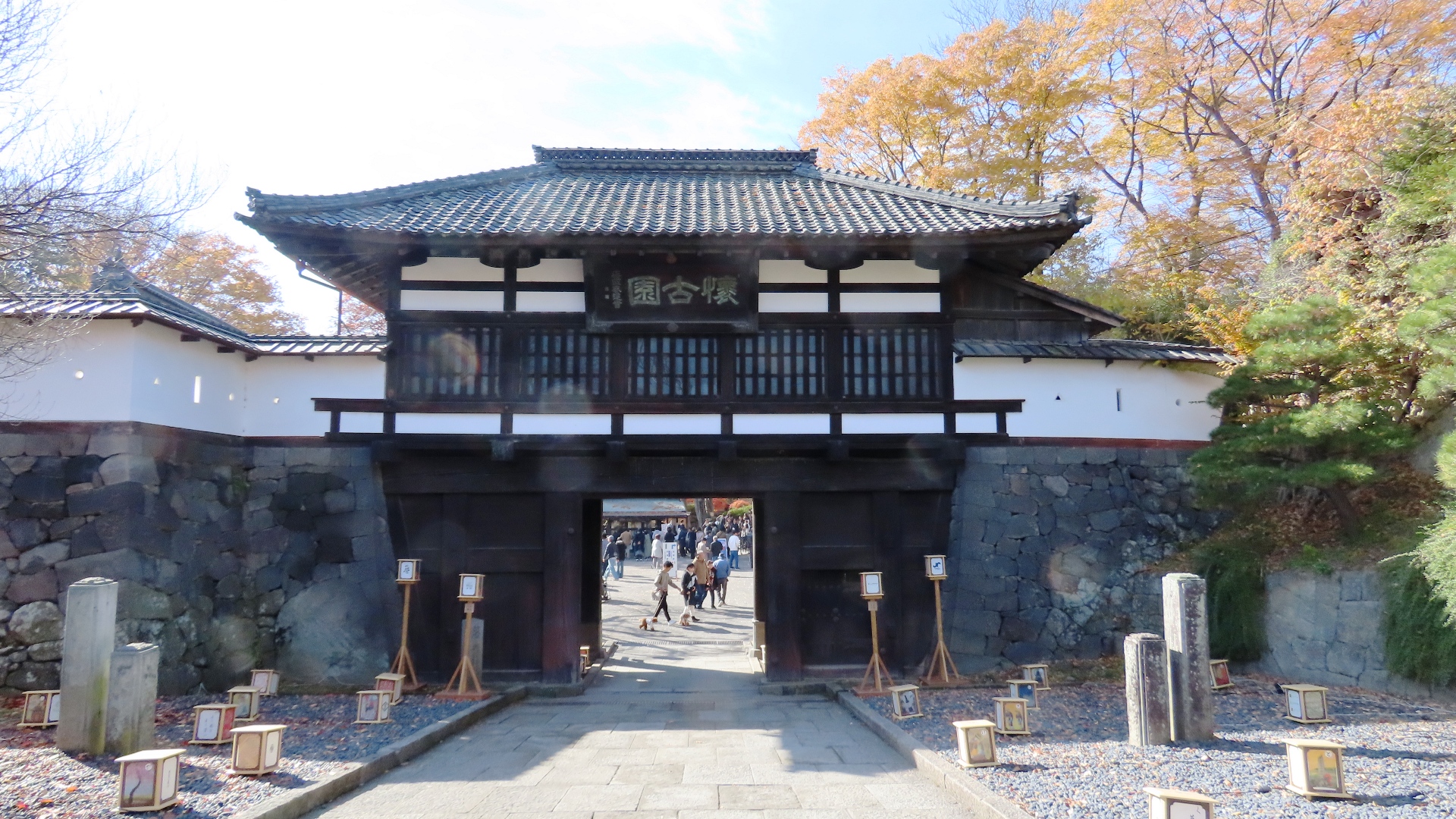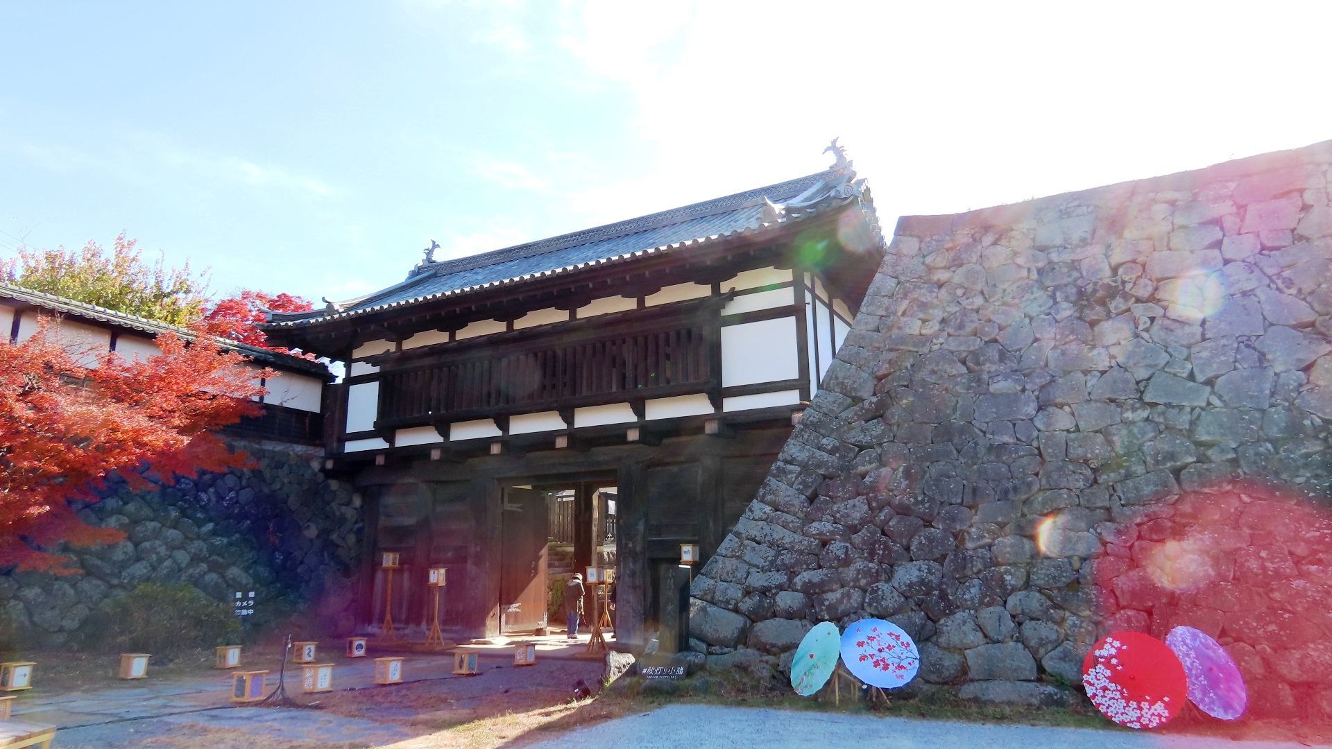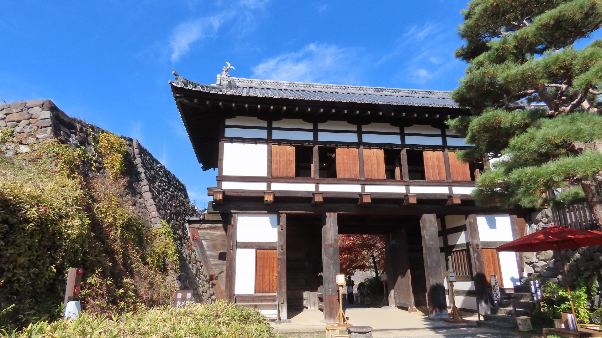 | 1583年頃に真田昌幸によって築城された。1585年の第一次上田合戦と1600年の第二次上田合戦で徳川の大軍を二度にわたって退けたことで、上田城の堅牢さと真田の知略を轟かせた。1874(明治7)年に上田優香邦払い下げられていた、左右の南櫓と北櫓が1943(昭和18)年から6年かけ再移築され、1994(平成6)年に2棟の櫓をつなぐ大手門が復元された。なお西櫓はは解体を免れ現存されている。 | |||||||