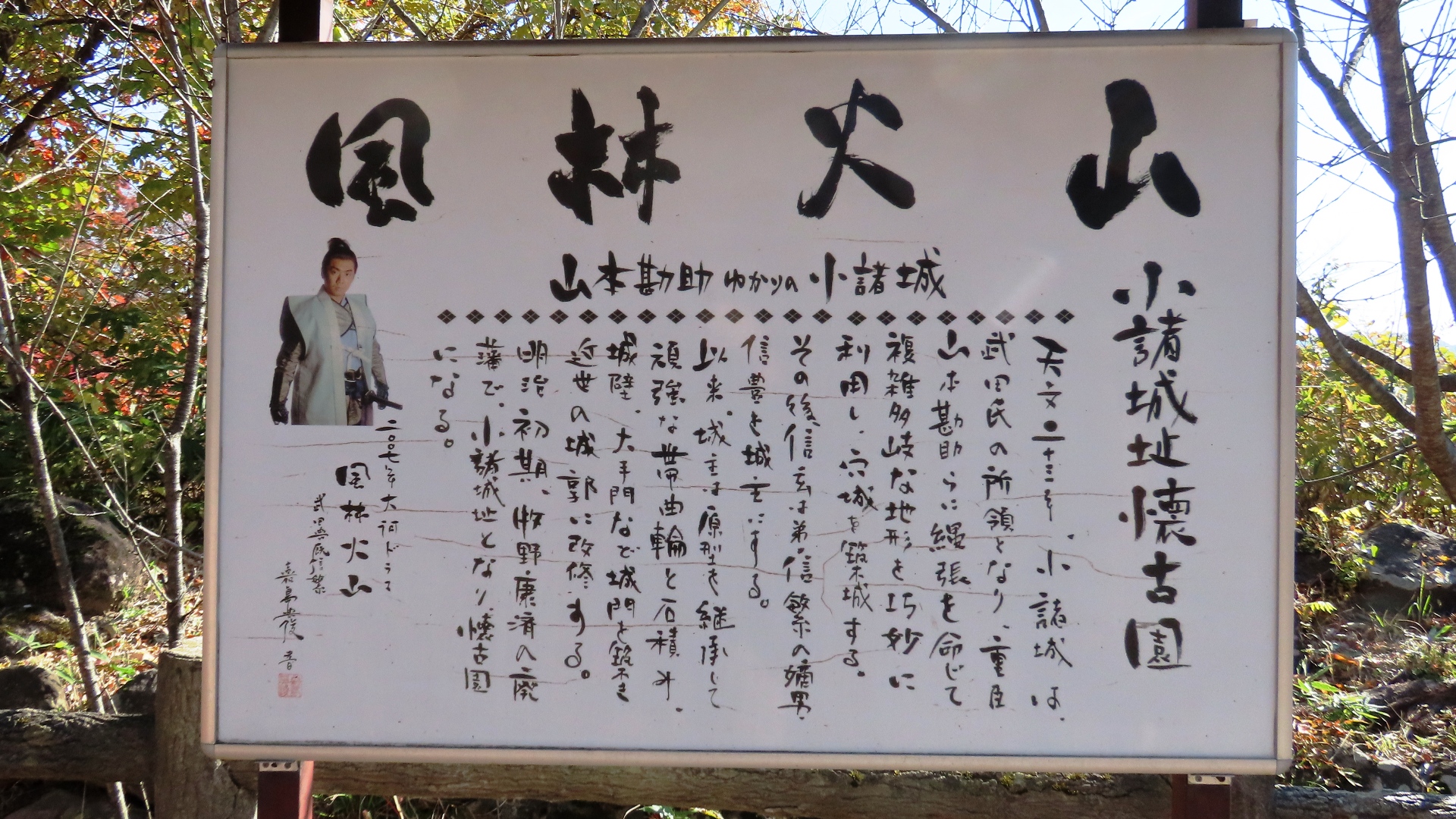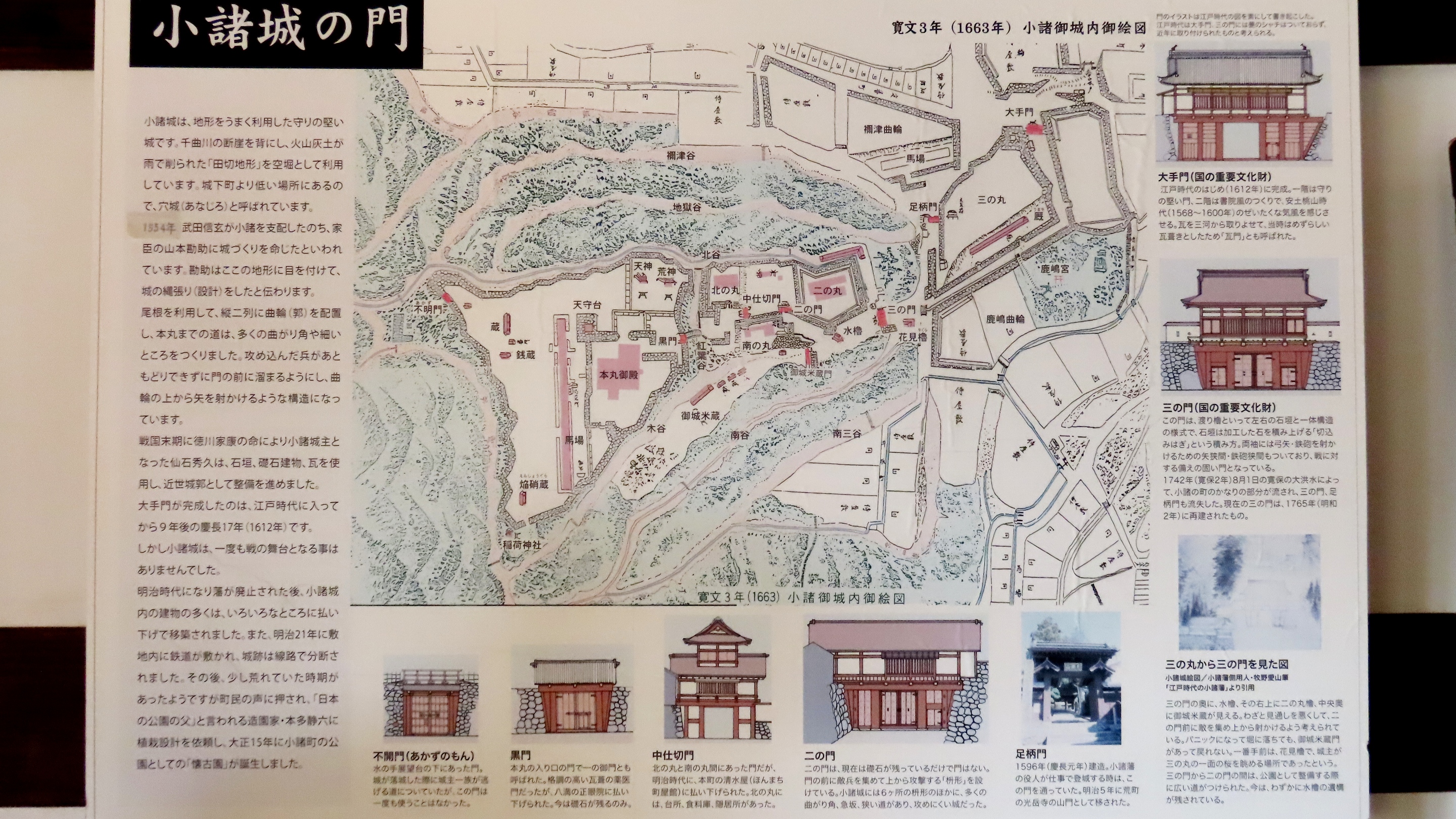 | 戦国時代に武田信玄が縄張りした。案内板 秀吉の小田原攻めで功で千石氏が五万石で入封し近代城郭に改修。 江戸時代に入ってからは領主が幾度となく変わり明治維新を迎えた。三の門より内側は「懐古園」と称している。 |