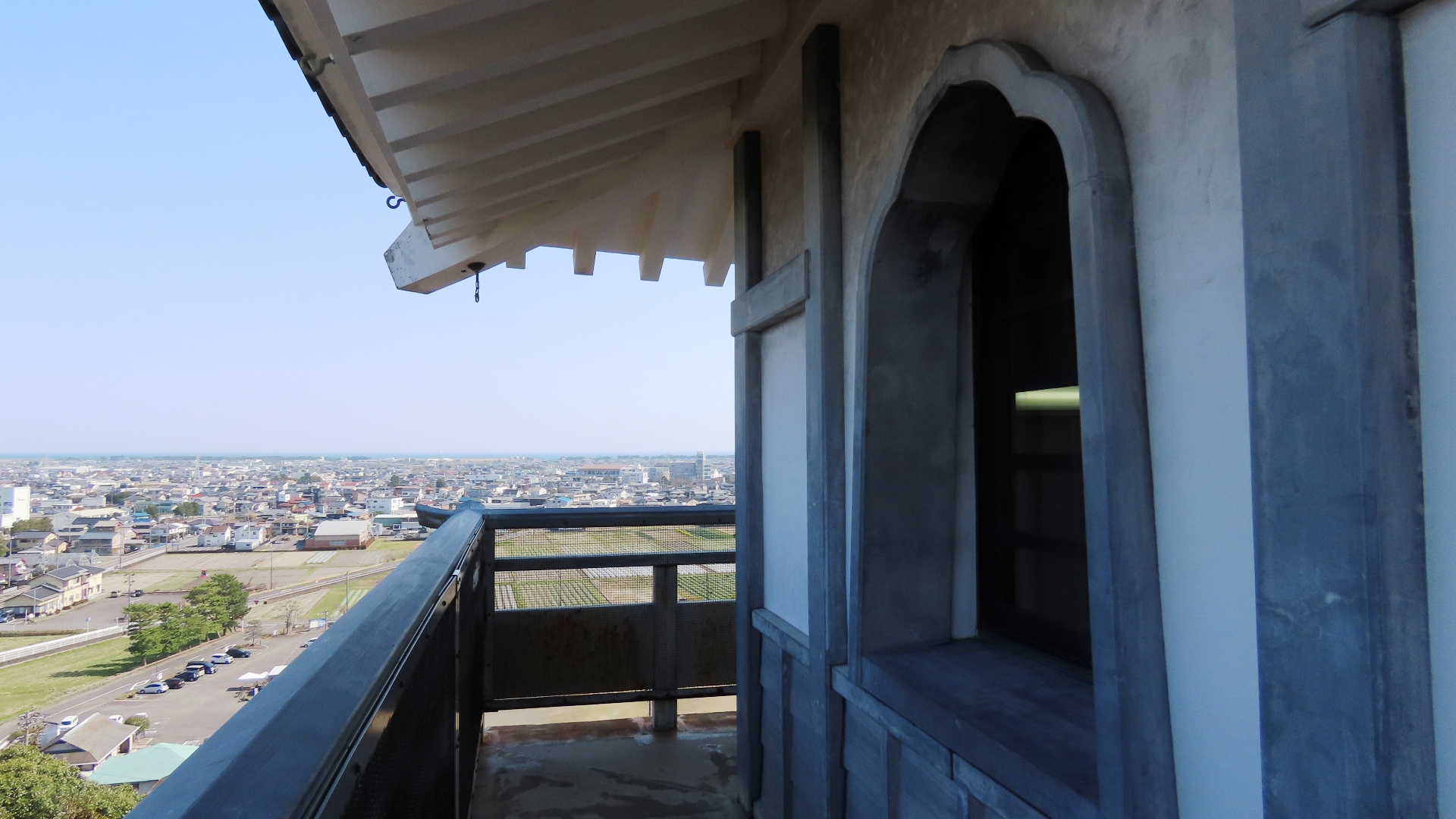 | 明治時代に各種門や石垣・樹木が売り払われ、天守閣のみ残ったらしい。 | 天守の最高階は、回廊付の望楼。 屋根が石(笏谷石:しゃくだにいし)で葺かれているのも特徴。 |