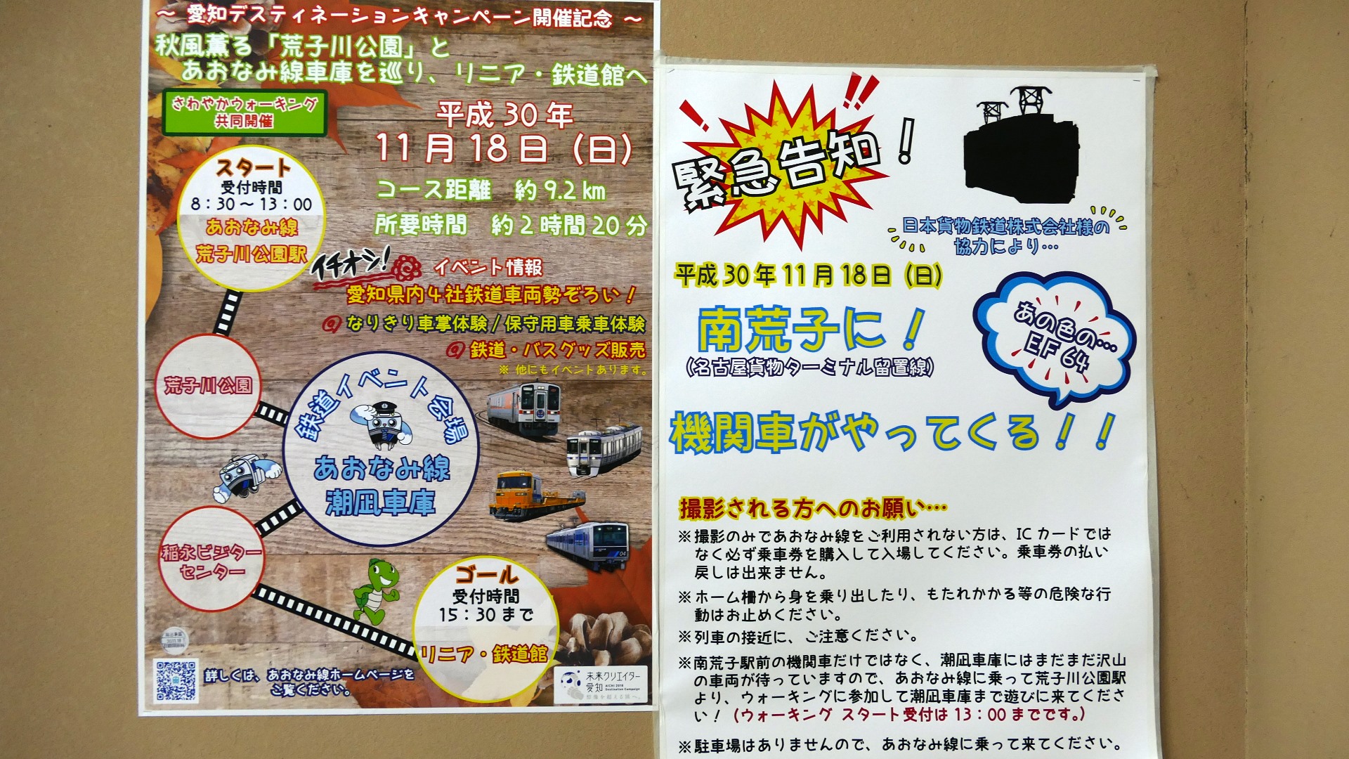| さわやかウォーキング「秋風薫る荒子川公園とあおなみ線車庫巡り、リニア鉄道館へ」の共同開催。点検車両の紹介や、愛知県内鉄道4社車両展示(板1・板2)、レゴランドラッピング電車、EF64国鉄色、ヘッドマーク提出など。 | |||||||