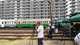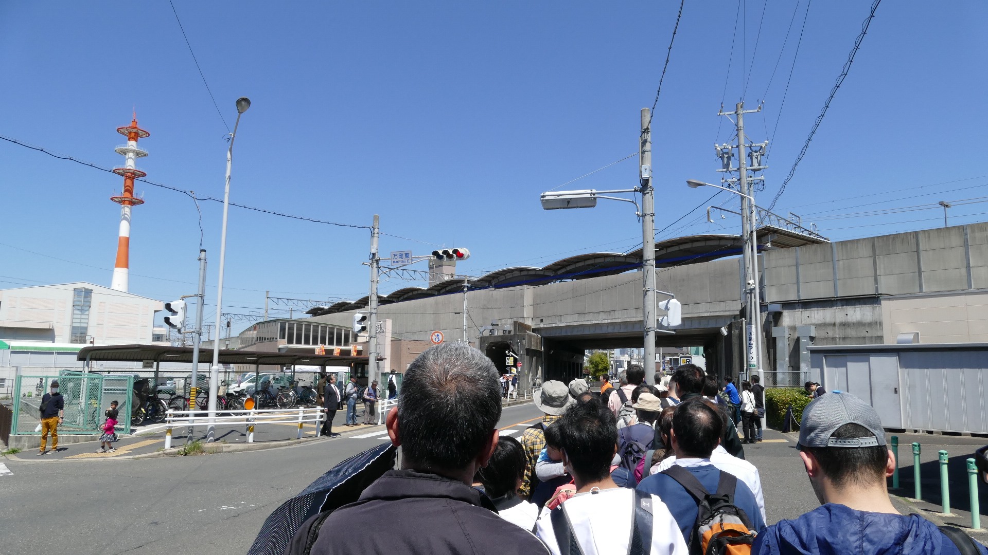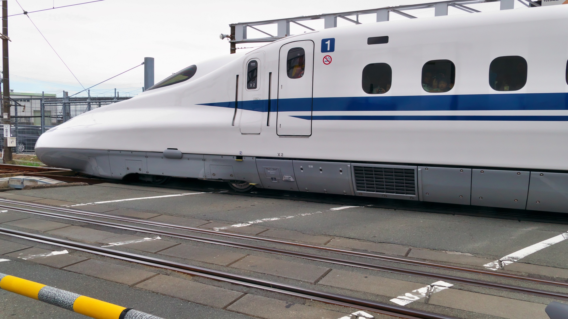 | 今年も「なるほどツアー」団体列車が踏切通過。 新大阪657-京都712-名古屋748(のぞみ294スジ)。受付は東側入口からの新工場前 |
