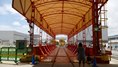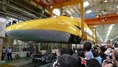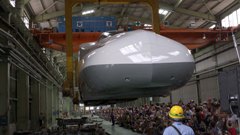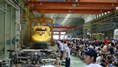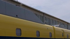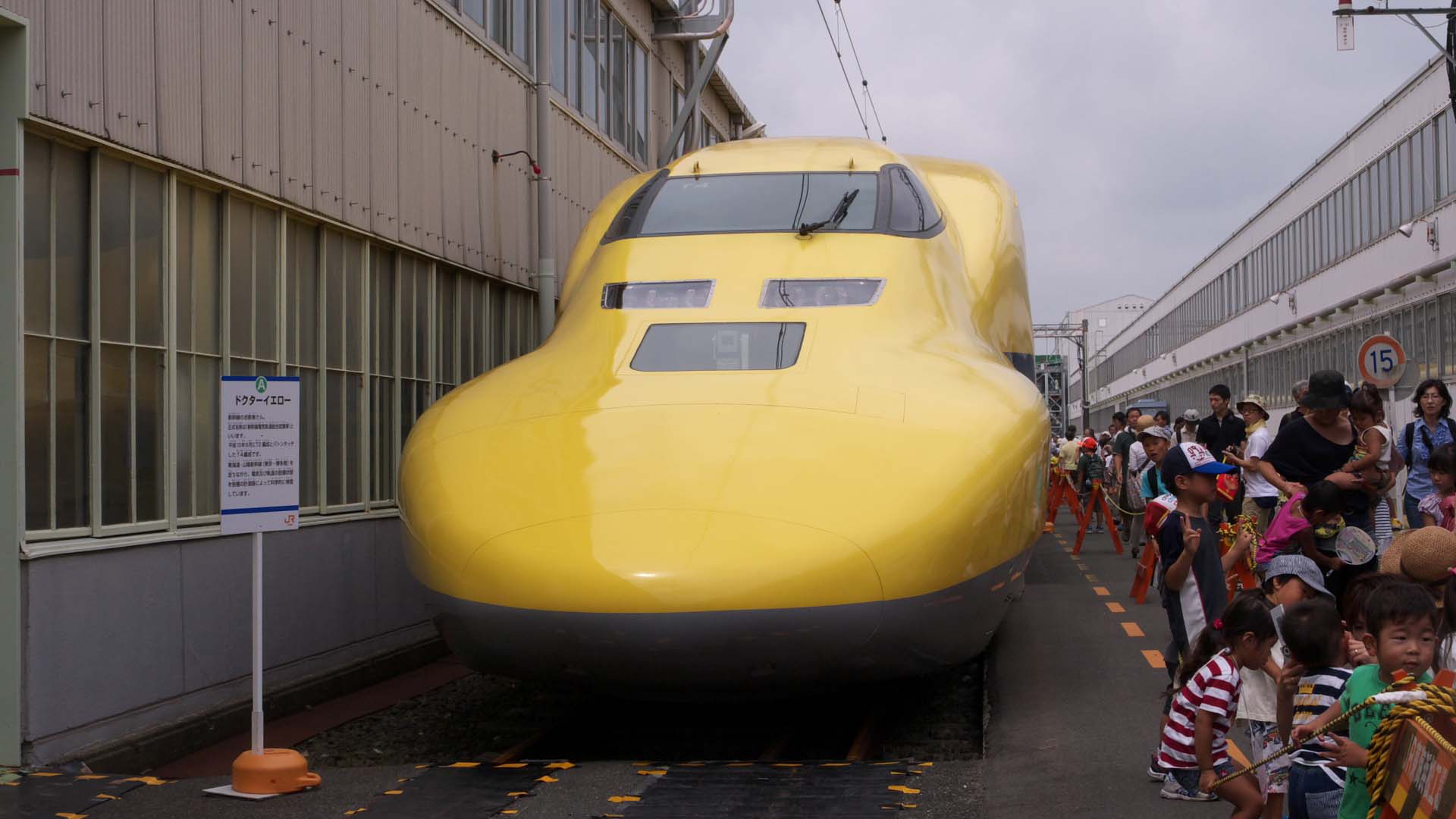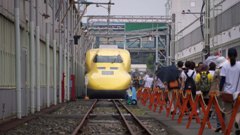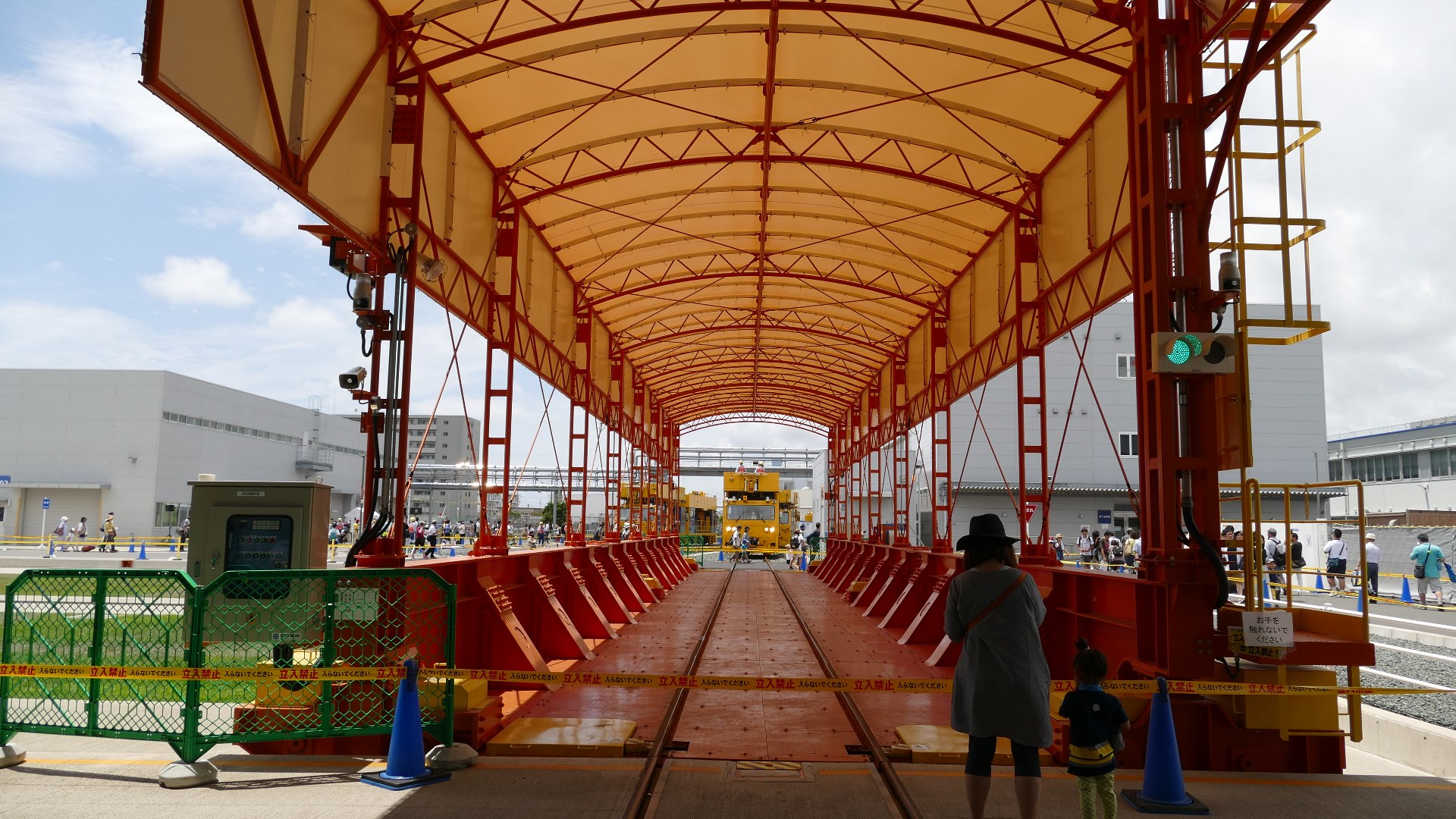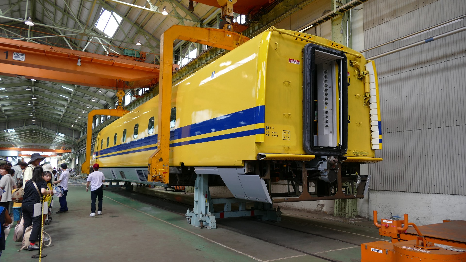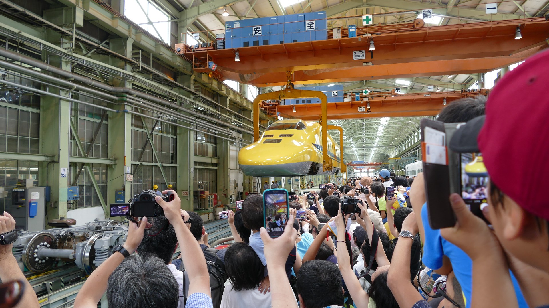 | 今年は「ドクターイエロー」の全般検査が、浜松工場公開イベント開催日と重なり、「車体上げ・載せ」が実演された。全般検査で再塗装され車体はピカピカ。 「出会えると幸せになれる」と言われる「DY」、ただでさえレアな車両が宙に浮く姿が初めて見られるとあって、今回初めて整理券が配られた。 |