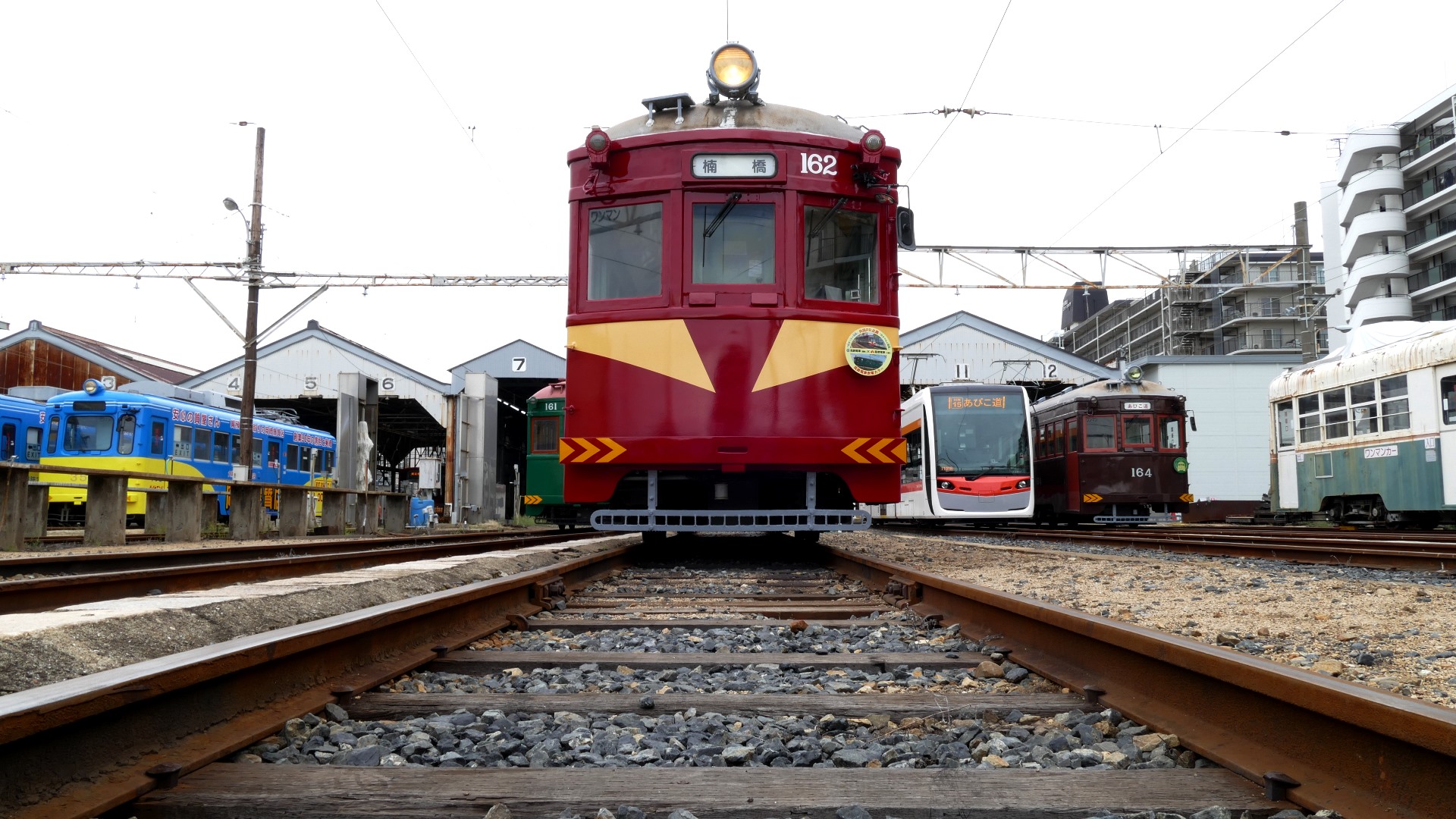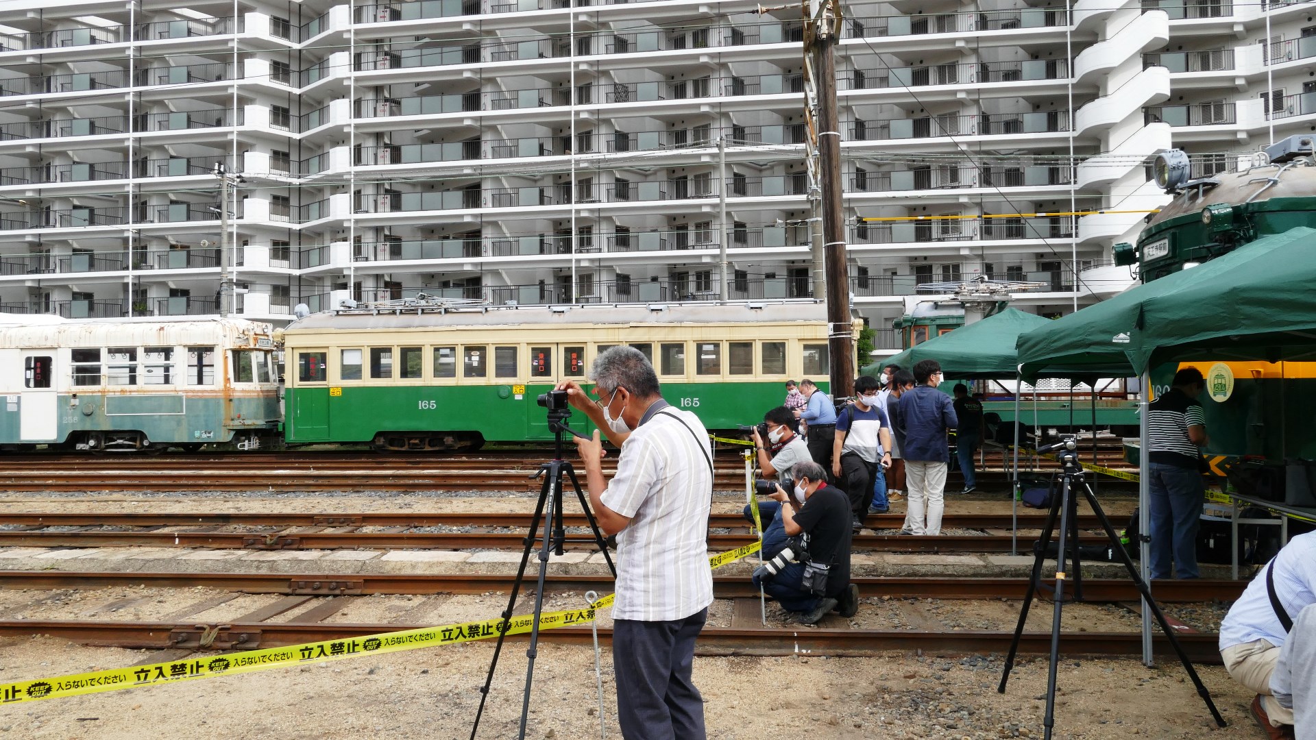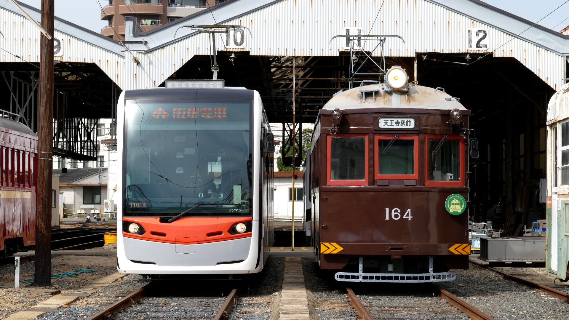 | 貸切電車で移動 | 我孫子道車庫にて撮影会。モ161〜は昭和3年製造で定期列車として運転される日本最古の車両。 モ161の外観塗装は昭和40年代の姿を復元。平成25年新造の「阪堺トラム」1001型も目を引く。 |