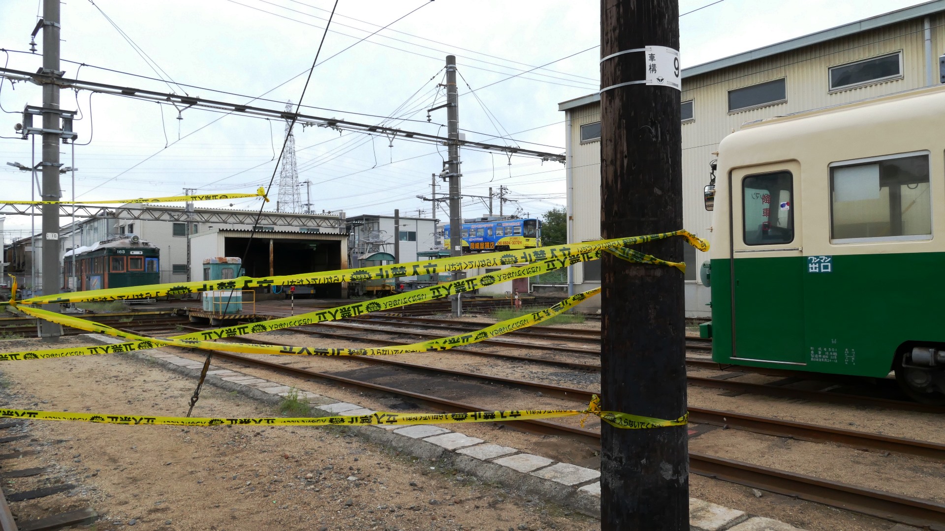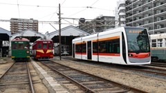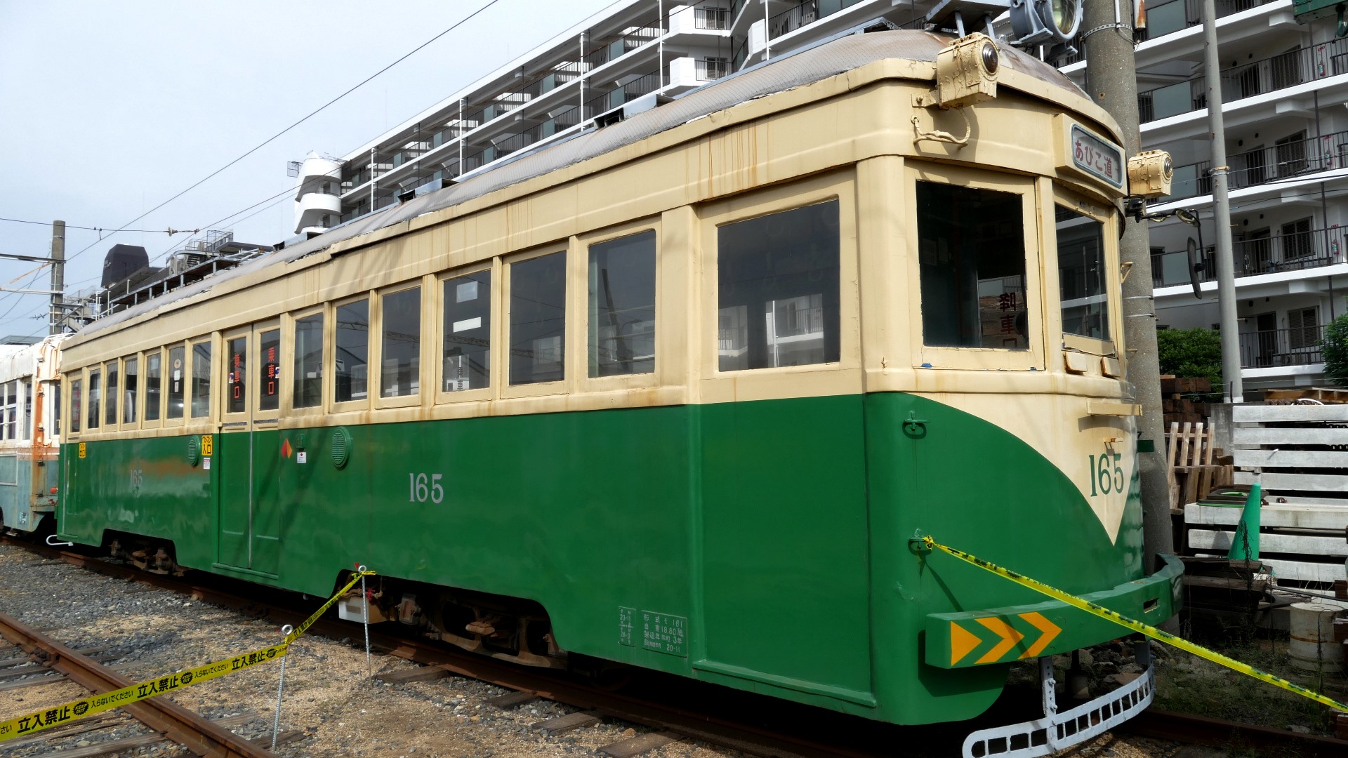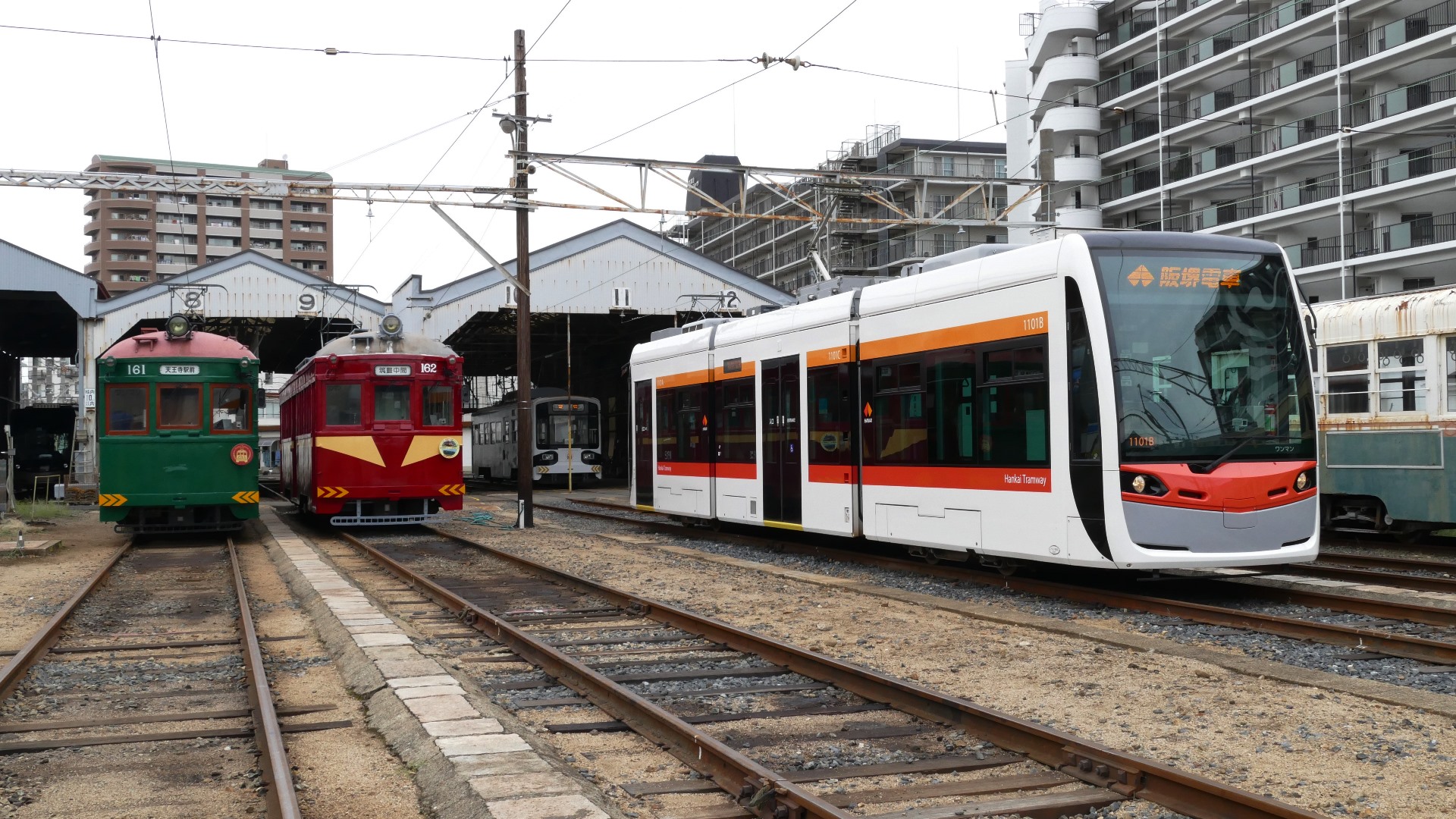 | 貸切電車で移動 | 我孫子道車庫にて撮影会。モ161〜は昭和3年製造で定期列車として運転される日本最古の車両。 モ161の外観塗装は昭和40年代の姿を復元。平成25年新造の「阪堺トラム」1001型も目を引く。 |