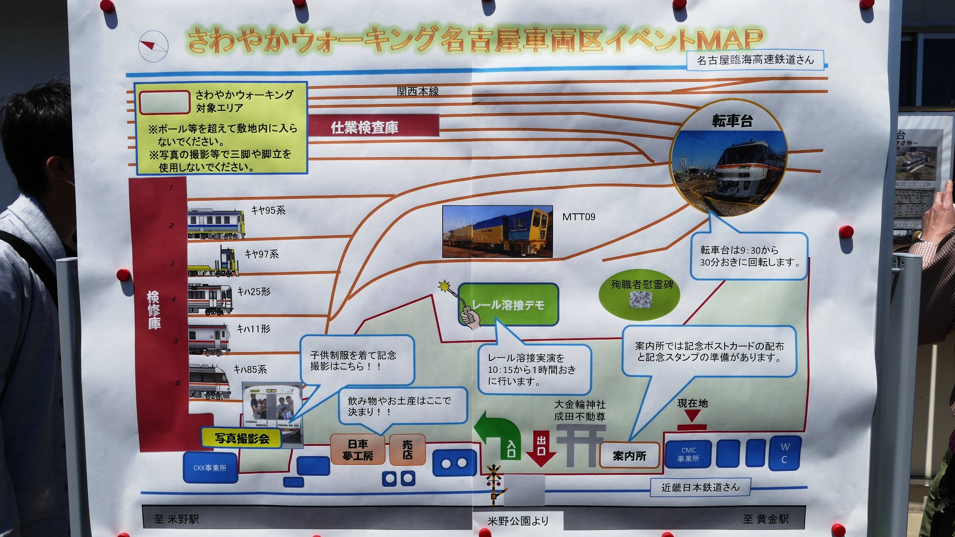 | コース5.2Kmの中盤あたりに、メイン企画の「名古屋車両区」公開がある。 | 検修庫から「顔出し」 | 名古屋車両区では、キハ85。キハ11、キハ25、キヤ97、キヤ95、キハ75を扱っている。 子供写真撮影会、鉄道神社(大金輪神社・成田不動尊)、 さわやかウォーキング「あゆむ君」と後ろのボード、マルタイMTT09。 |