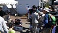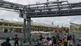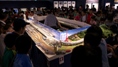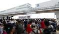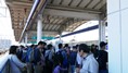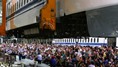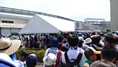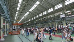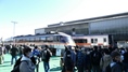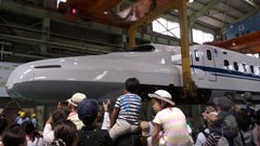 | 整備中の新幹線。 | N700系の車体上げ・乗せ作業実演。 メインイベントだけあって、スゴイ人。 |
