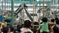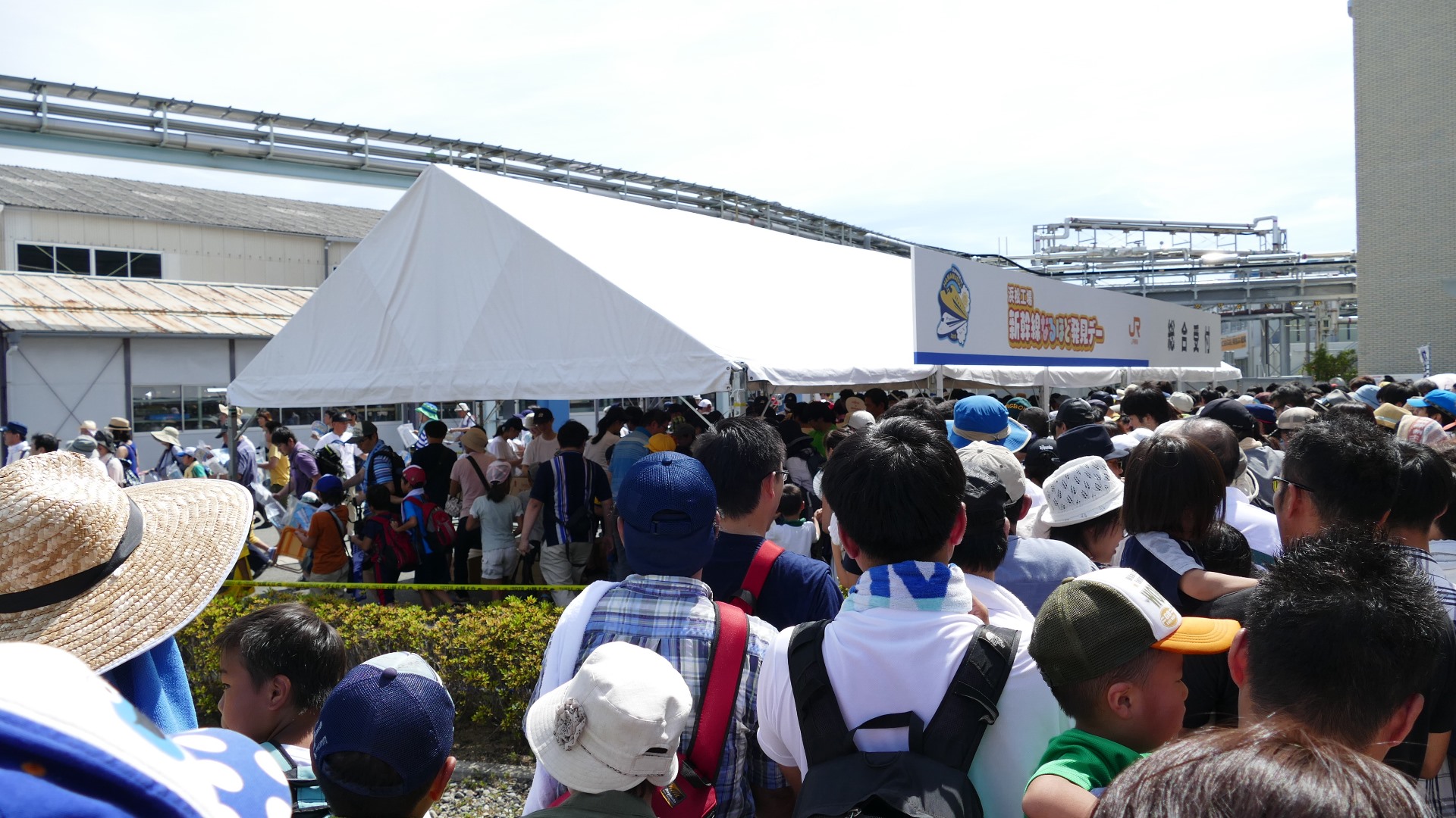 ちびっこ限定、記念撮影の様子。 | 工場の中。とても広いです。 おみやげ売り場の前は人盛り。 |