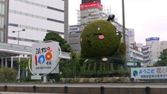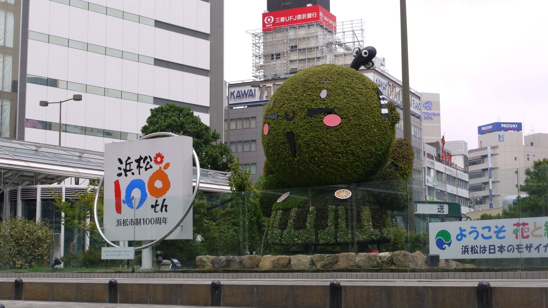 浜松駅前には、市制100周年を記念して、 マスコット家康くん。うなぎのちょんまげが チャームポイントらしい。 |
