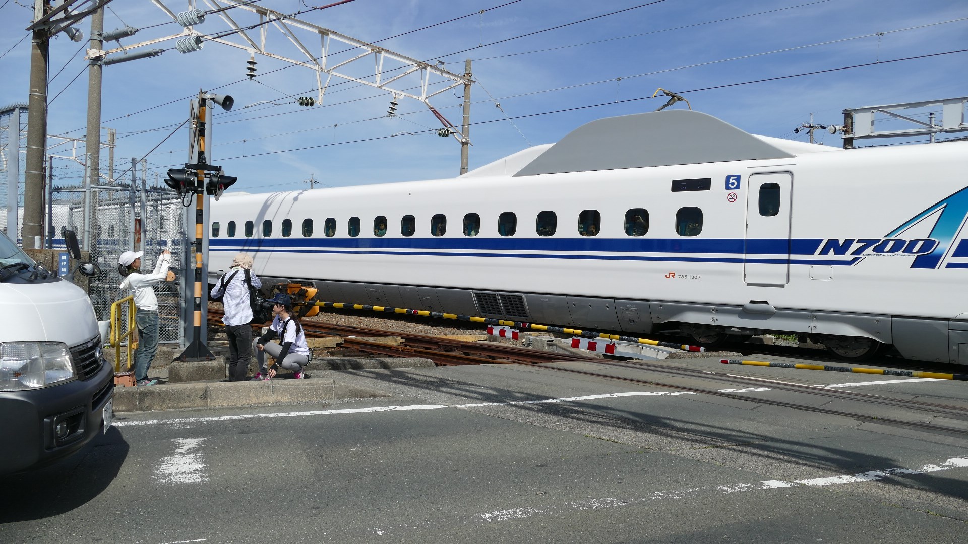 | 名古屋始発6:46のこだま630に乗って、浜松へ。三河安城でのぞみ202通過退避。 | 報道陣も詰めかける中、8:51乗客を乗せた真新しいN700Aが踏切をゆっくり通過。 | ||||||