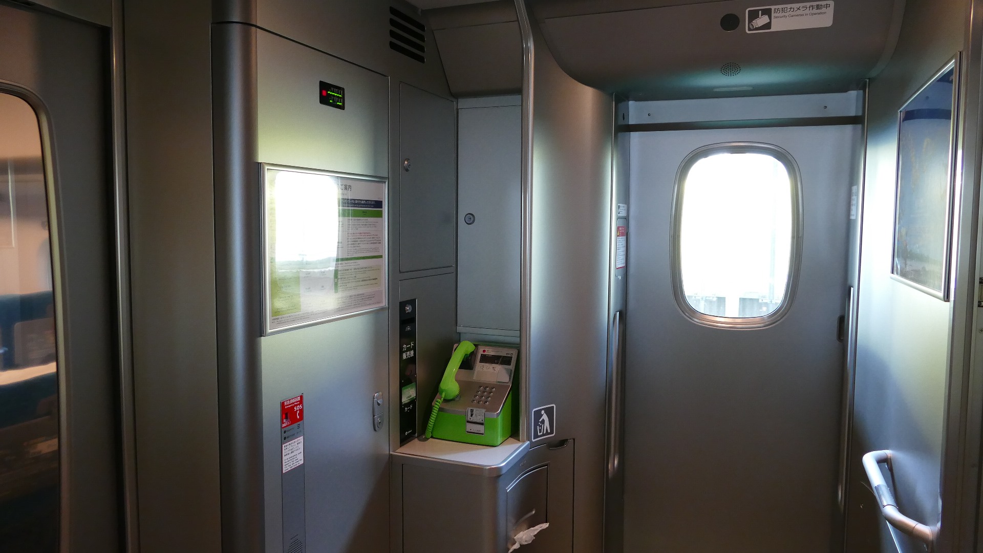 | 10号車グリーン車、11号車には多目的室があり、利用頻度が少ないだろう「公衆電話」も設置されているがカードを購入しないと使えないみたい。 | 静電アンテナの役割 空調の説明ボード |