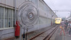熱中症予防のため、あちらこちらに ミスト発生つきの大型扇風機が設置されていた。 |