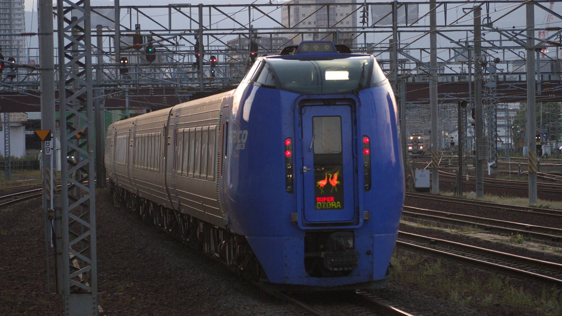 | 特急 スーパーおおぞら (キハ283系) キハ281系の発展形として1997年から営業運転を開始。札幌-釧路で1日7往復・最速3時間36分で運転されているが、鹿などと衝突事故で遅延が多い。 キハ281系と同様、制御付き自然振り子式で従来の振り子式にに比べ快適になった。キハ261との相違は前面の愛称表示のLED化とライト周りの変更ぐらいか? |