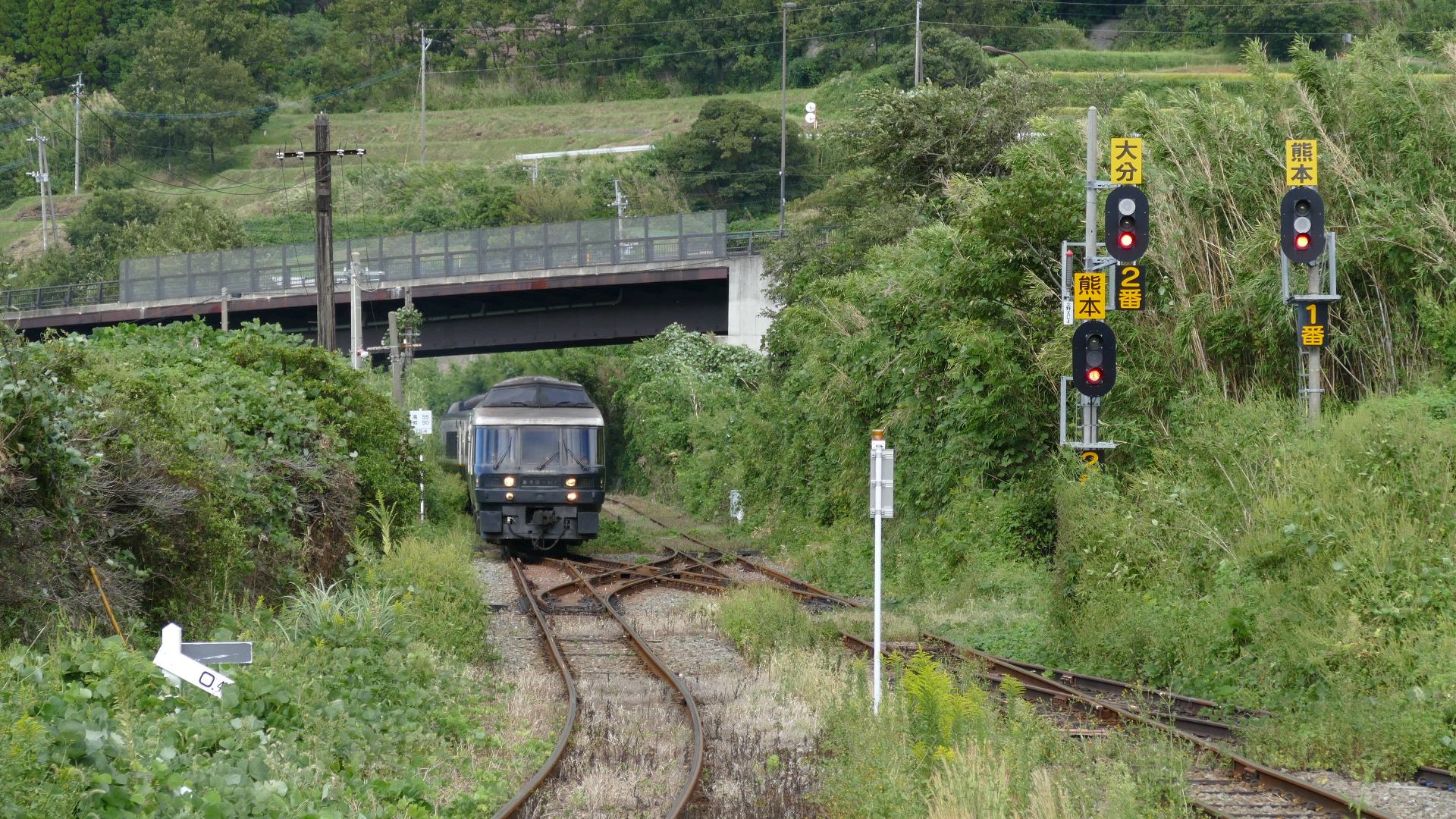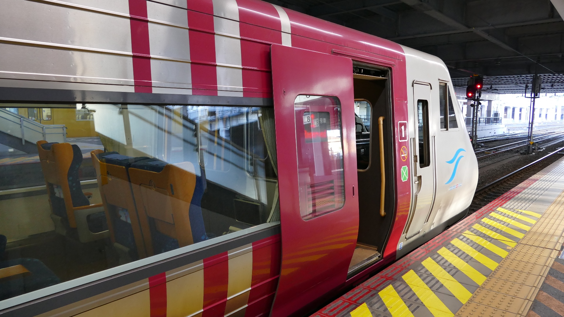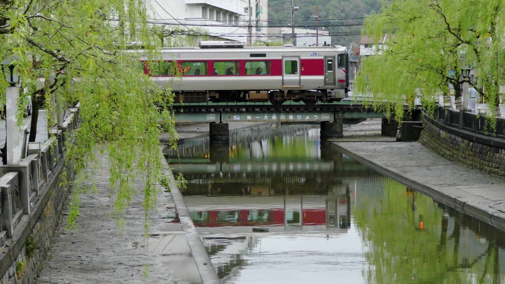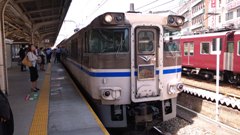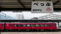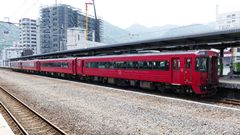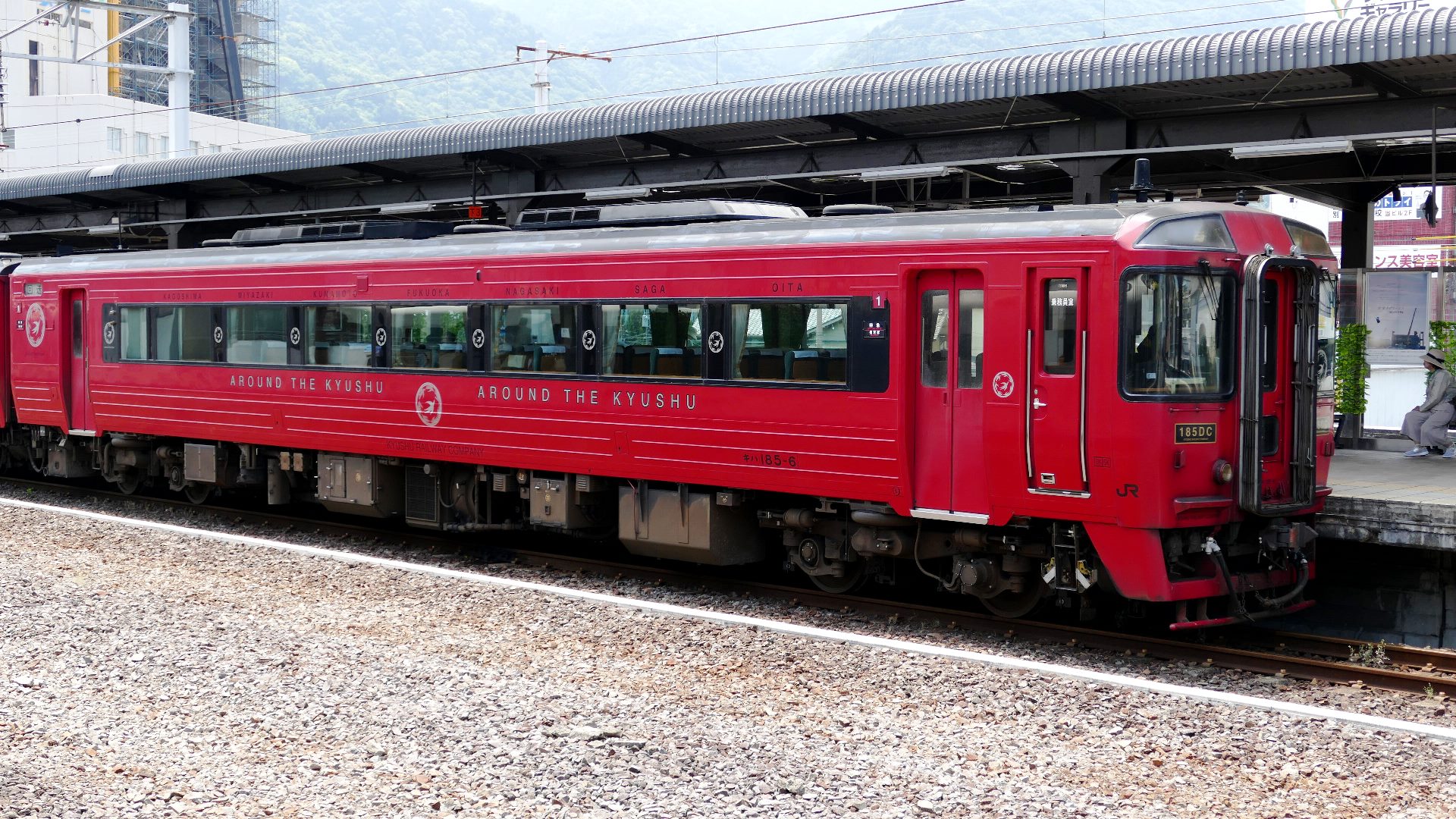 | 特急 九州横断特急 (キハ185系) 本来の運行区間は熊本-別府であるが、2016年4月の地震の影響で豊肥本線の一部区間が不通となり現在は阿蘇-別府で運行。 キハ185系は国鉄末期にJR四国向けに登場。ステンレス車体が特徴。JR四国は高速化に対応するため2000系導入にあたり、余剰となったキハ185系をJR九州へ譲渡した。 特急「九州横断特急」という不思議な名前を付けJR九州らしくステンレス部まで真っ赤に染まる車両となった。またJR特急初のワンマン列車でもある。最高速度は110Km/h。 |