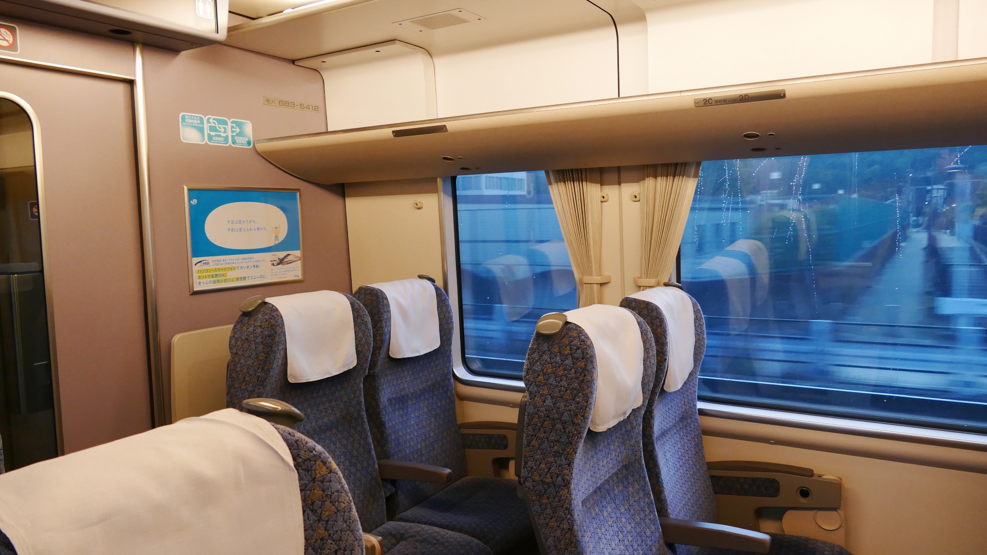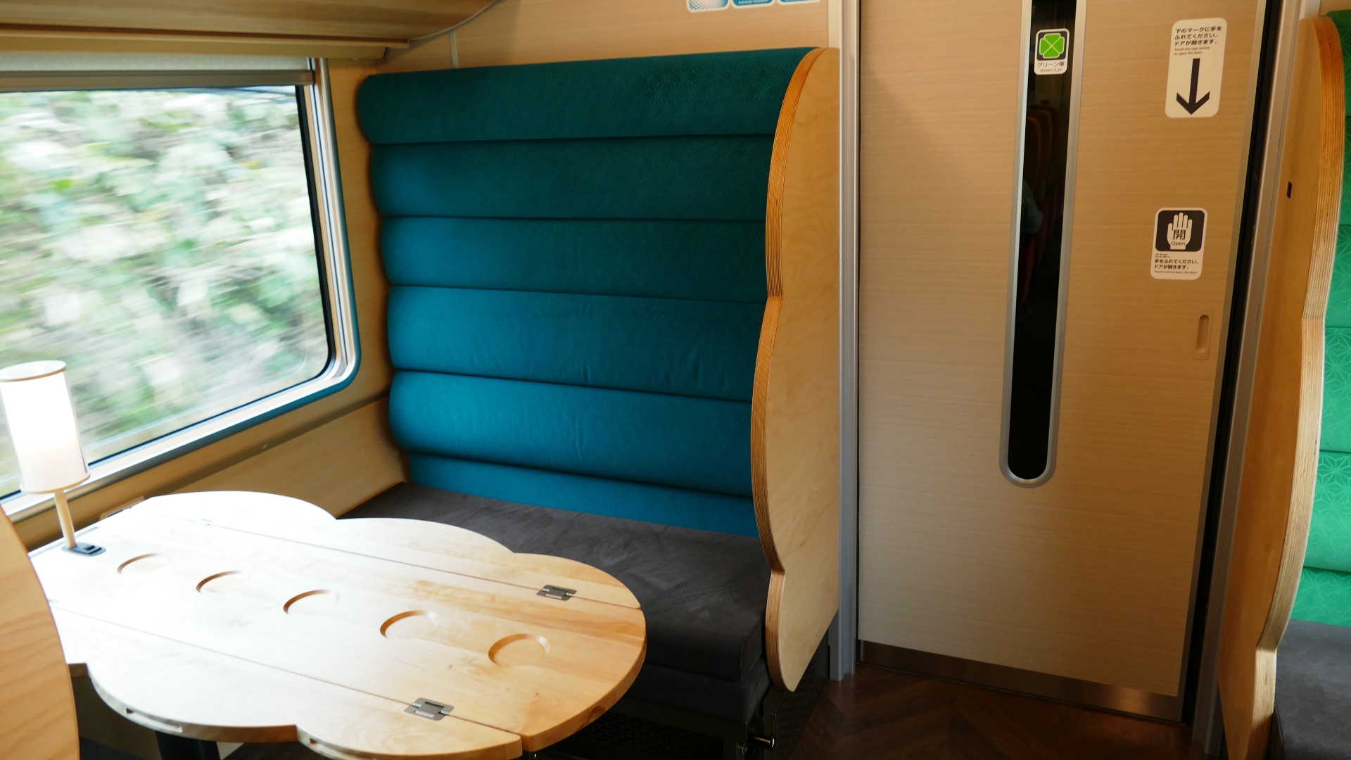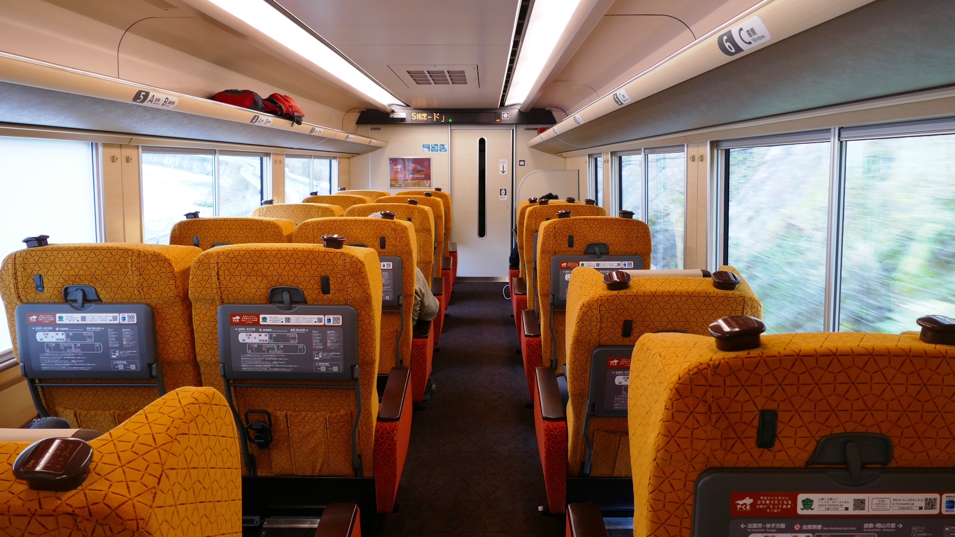 2階部分がグリーン席。1階部分は普通車だが、2+1の席配列・6列で個室のような雰囲気。人気席となっている。 | 3号車と4号車は2階フロアレベルでのみ移動可能。 | ||||