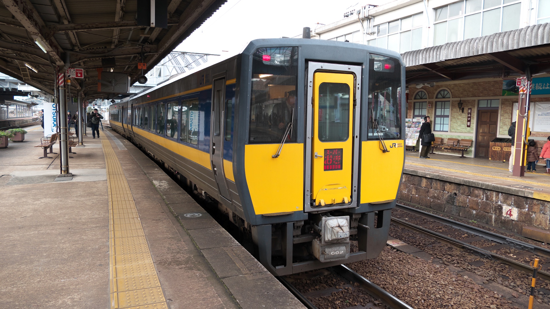 885系 白いソニック 小倉駅-別府駅 モスラの幼虫顔。高級感溢れている。 |