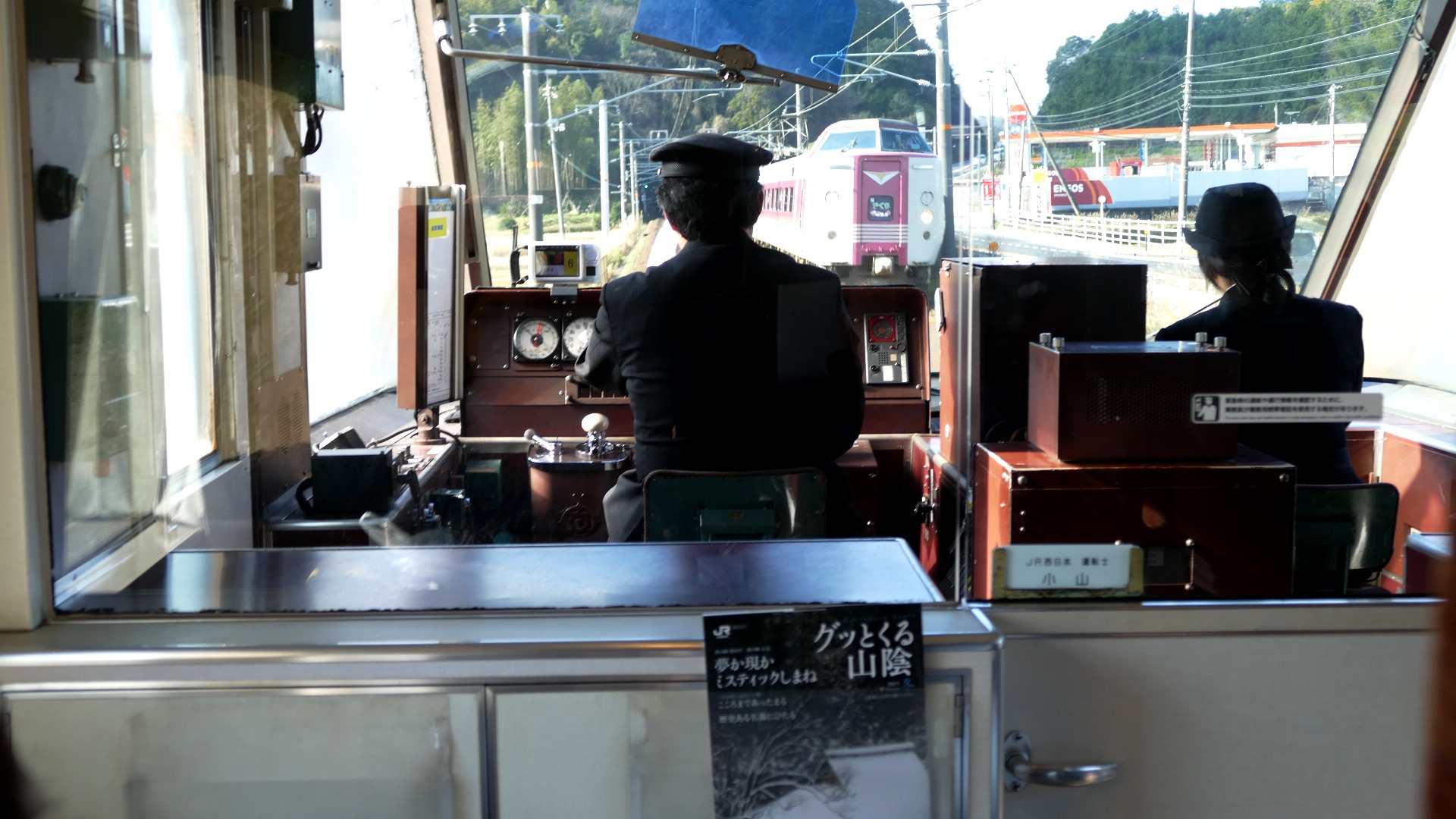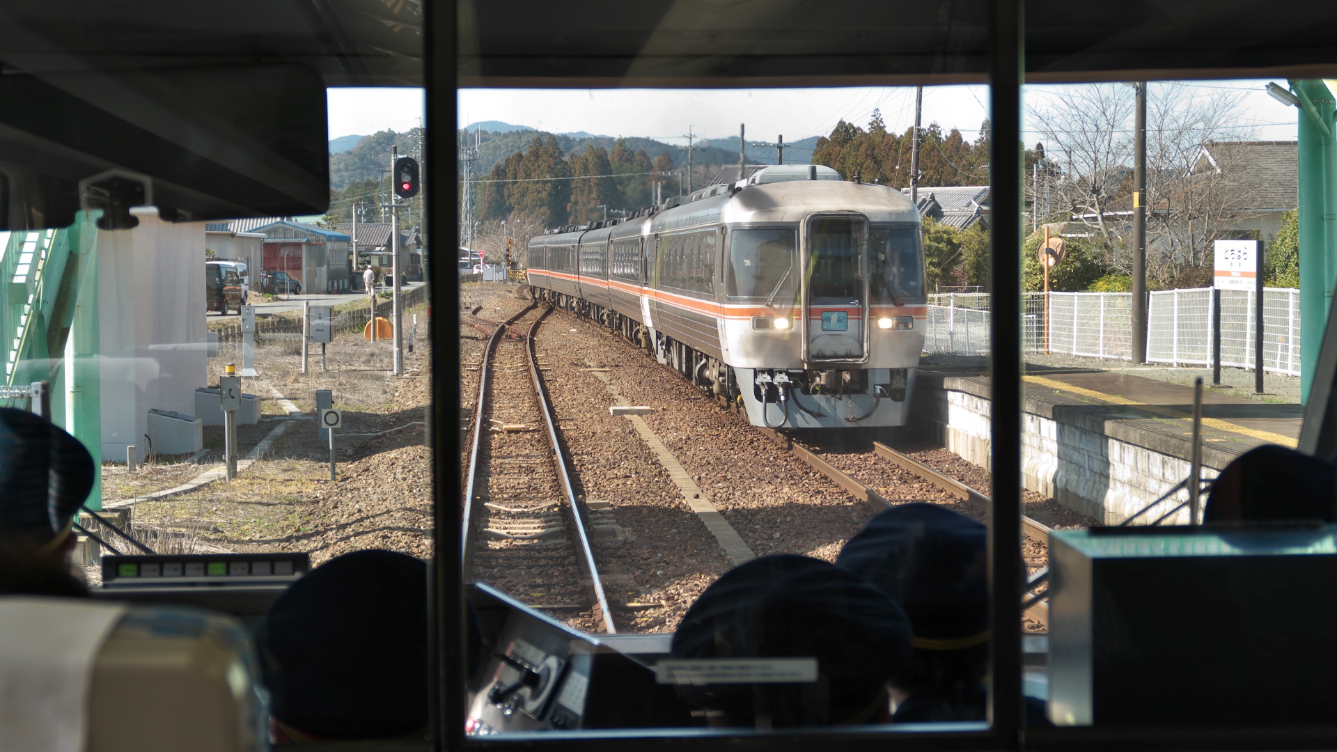 紀伊勝浦-新宮はJR西日本管内で僅か17分の任務。新宮駅で車掌に交代。 | 栃原駅で下り南紀5号と列車交換 運転訓練中なのか5名運船室に在席 |