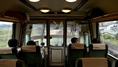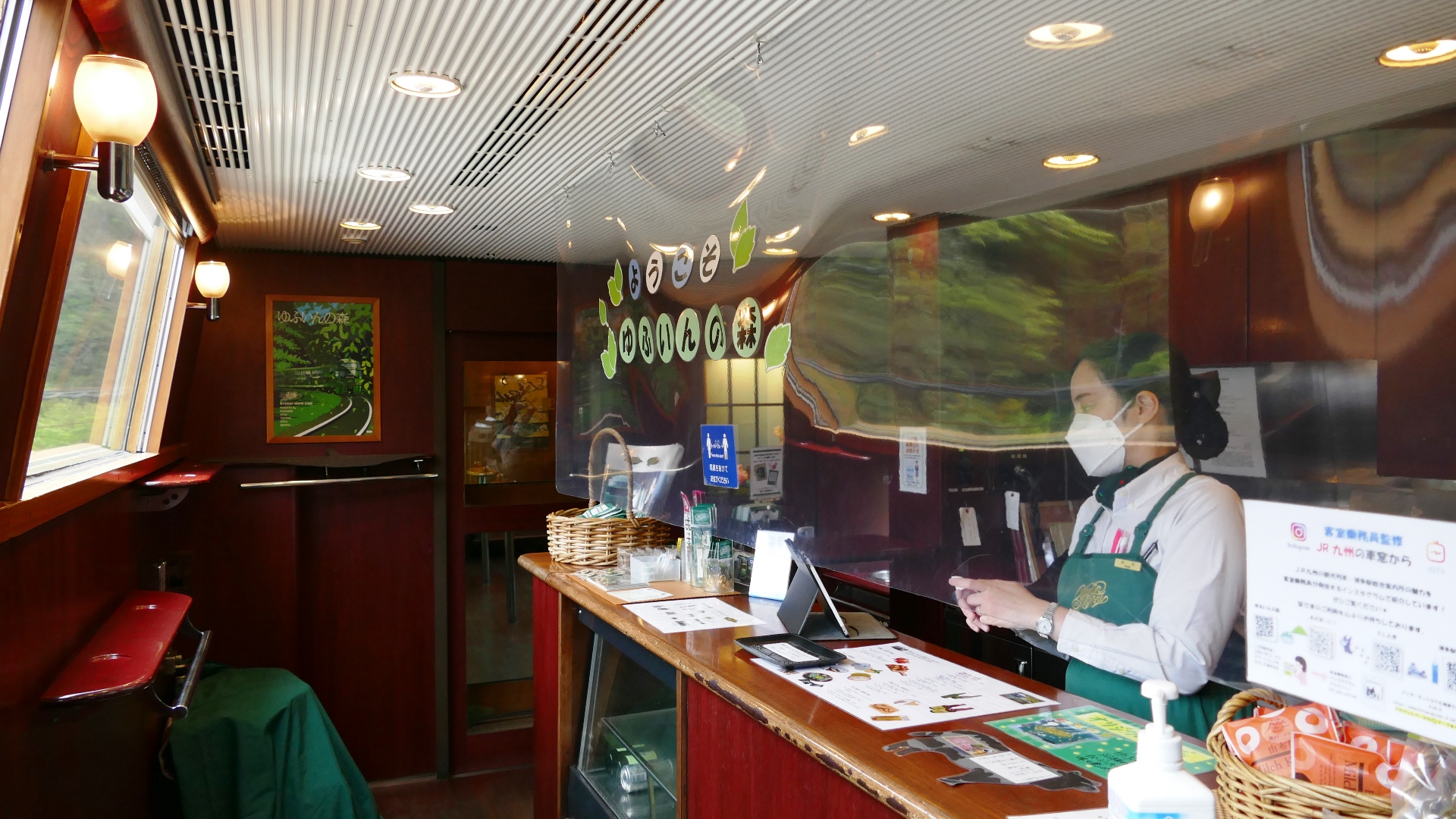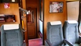 「Kitaguni Express」のエンブレム 普通車の車内はボックスシート |