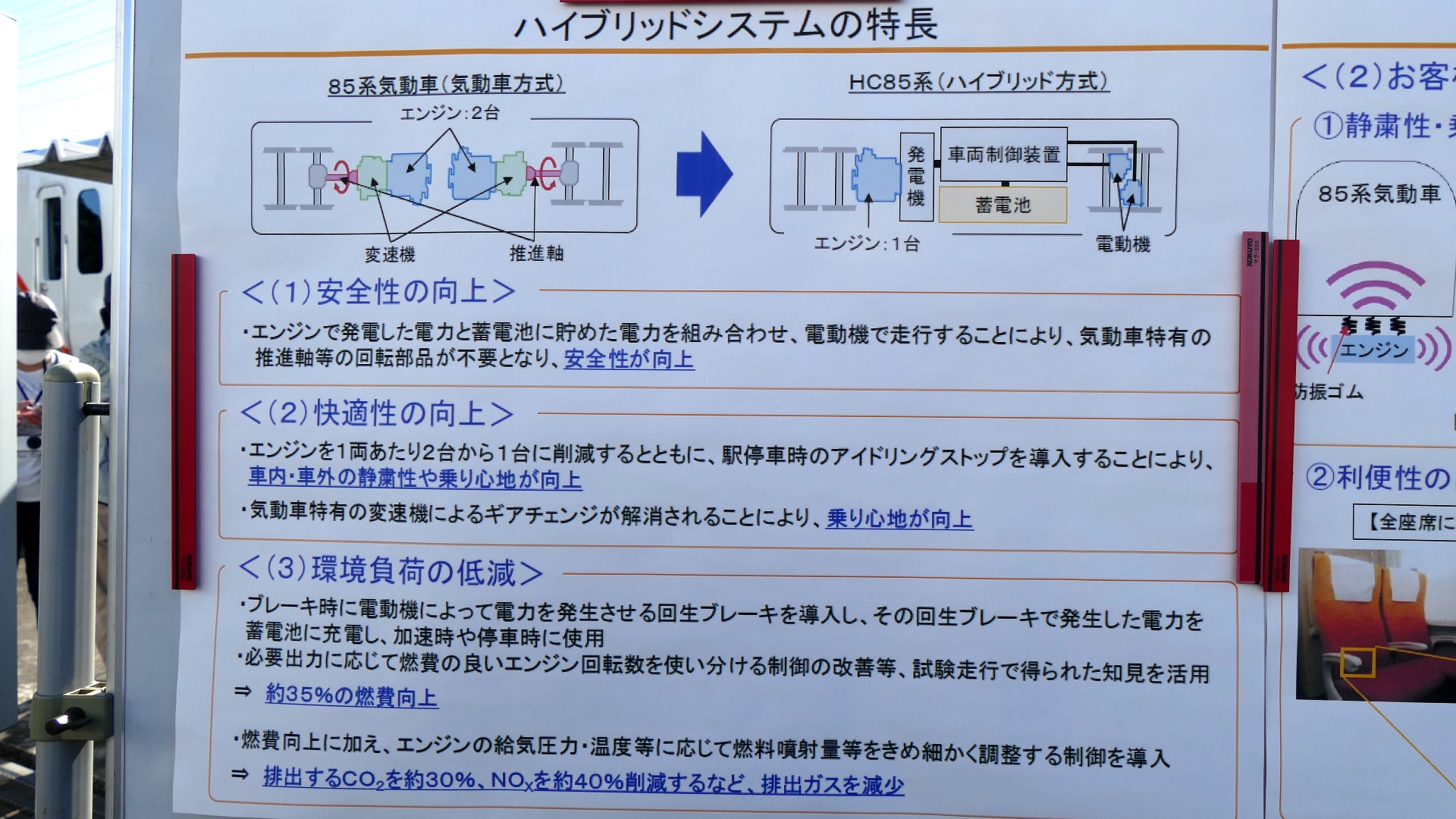 | 特急ひだ (HC85系) 2019年12月から試験走行を繰り返し、2022年から2023年にかけてキハ85系を置き換えるべく導入される予定。 JR東海として初のハイブリッド方式で、国内初の特急型車両として設計。車両形式は「モハ85」。最高速度は120Km/h。 |