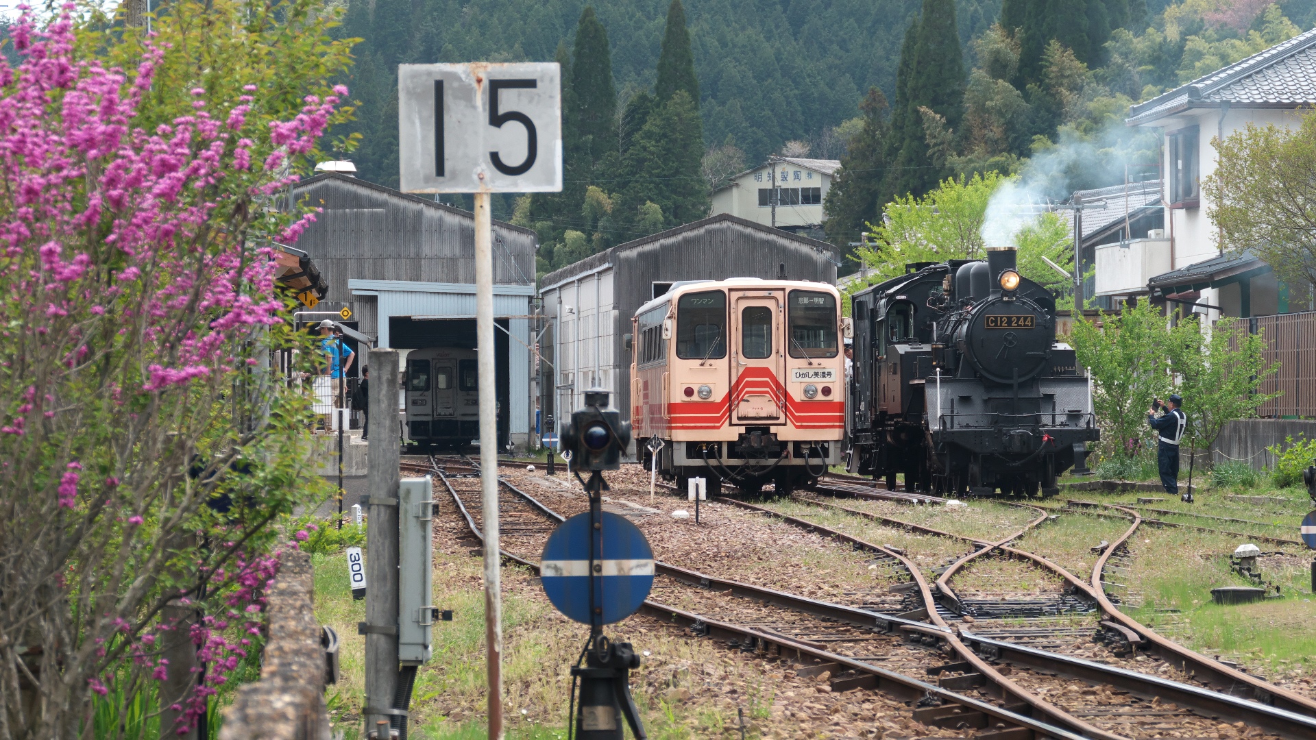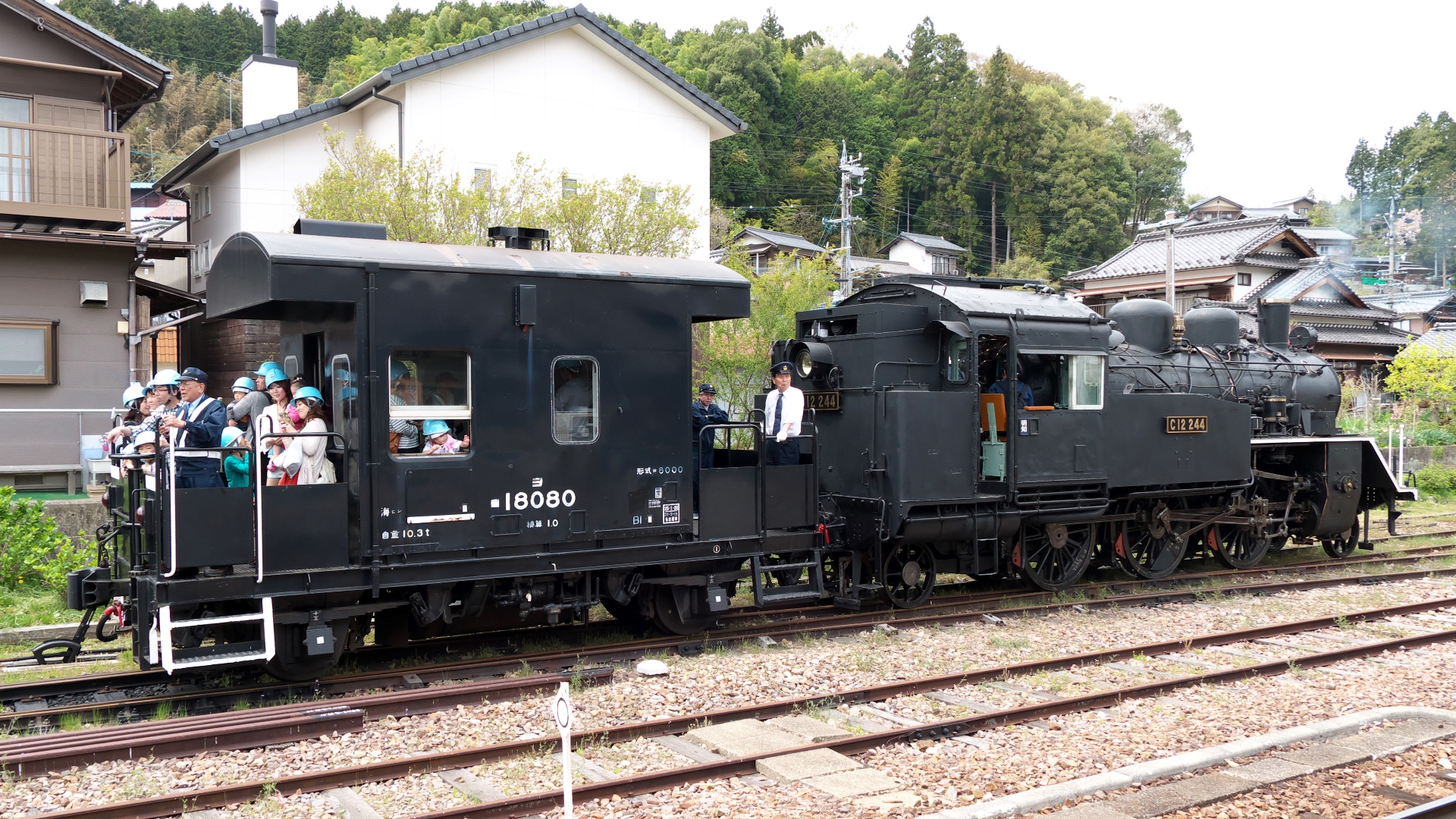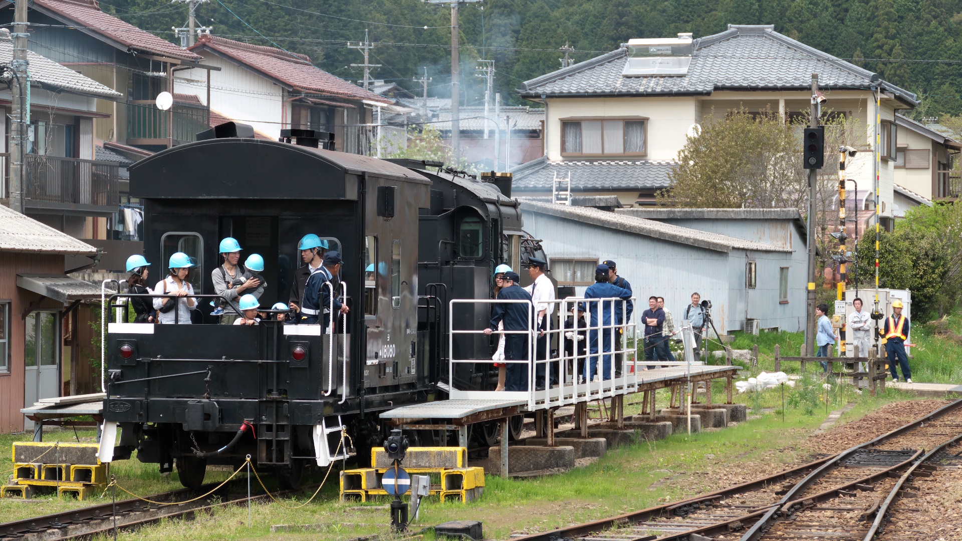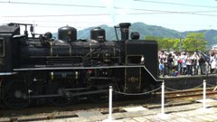 | イベントとして車掌車や運転助手席へSL乗車体験ができる。走行は、明智駅構内の車庫から仮設ホームまで約120mを時速7キロで往復する楽しそうなイベントである。本格復活の前段階として空気圧縮機による走行だったが、煙も吐き出す演出もされた。本来の姿で復活走行させるには初期費用約6億円、年間維持費が約9000万円が必要だとか。 | |||||||