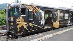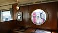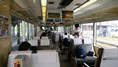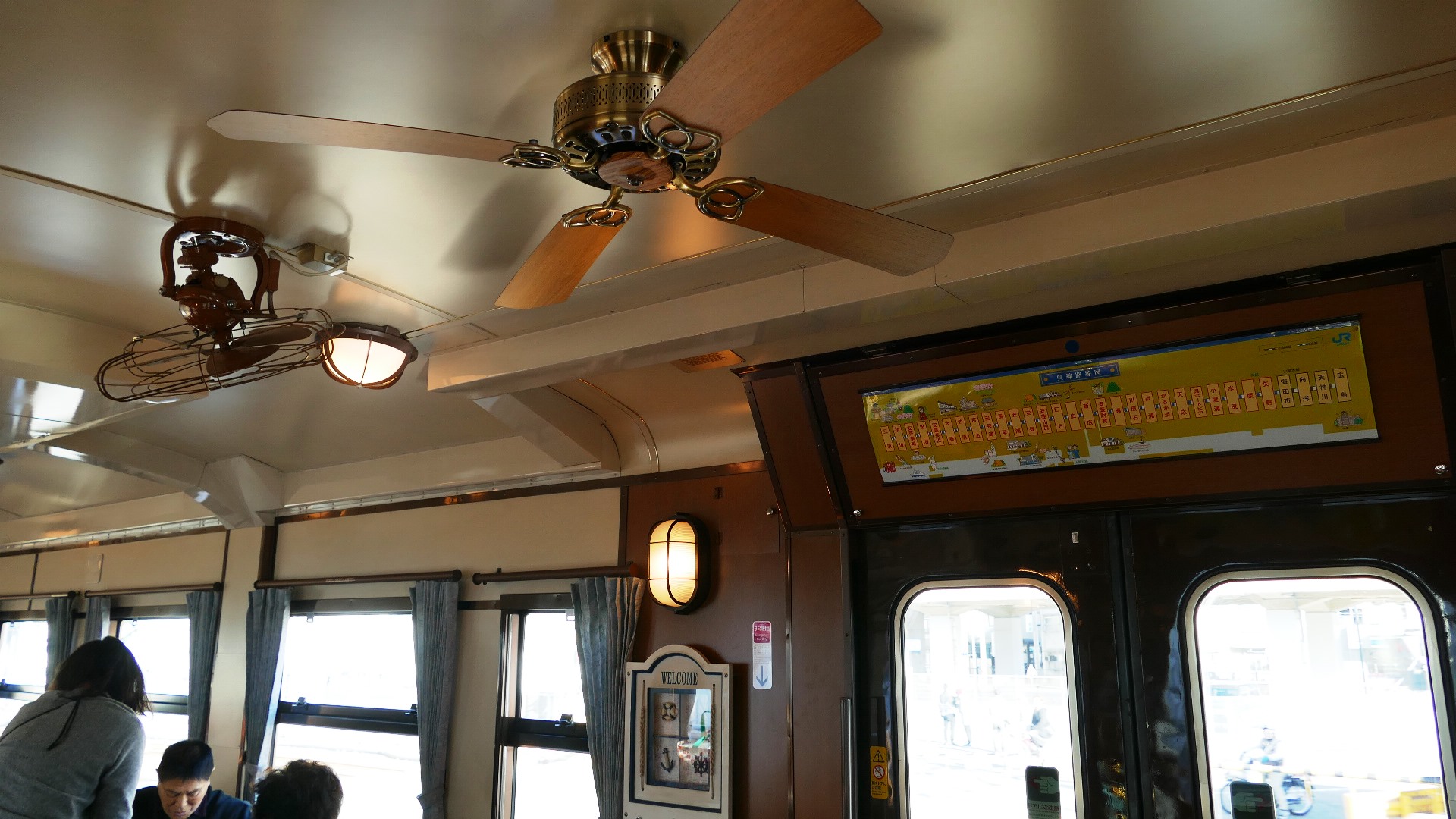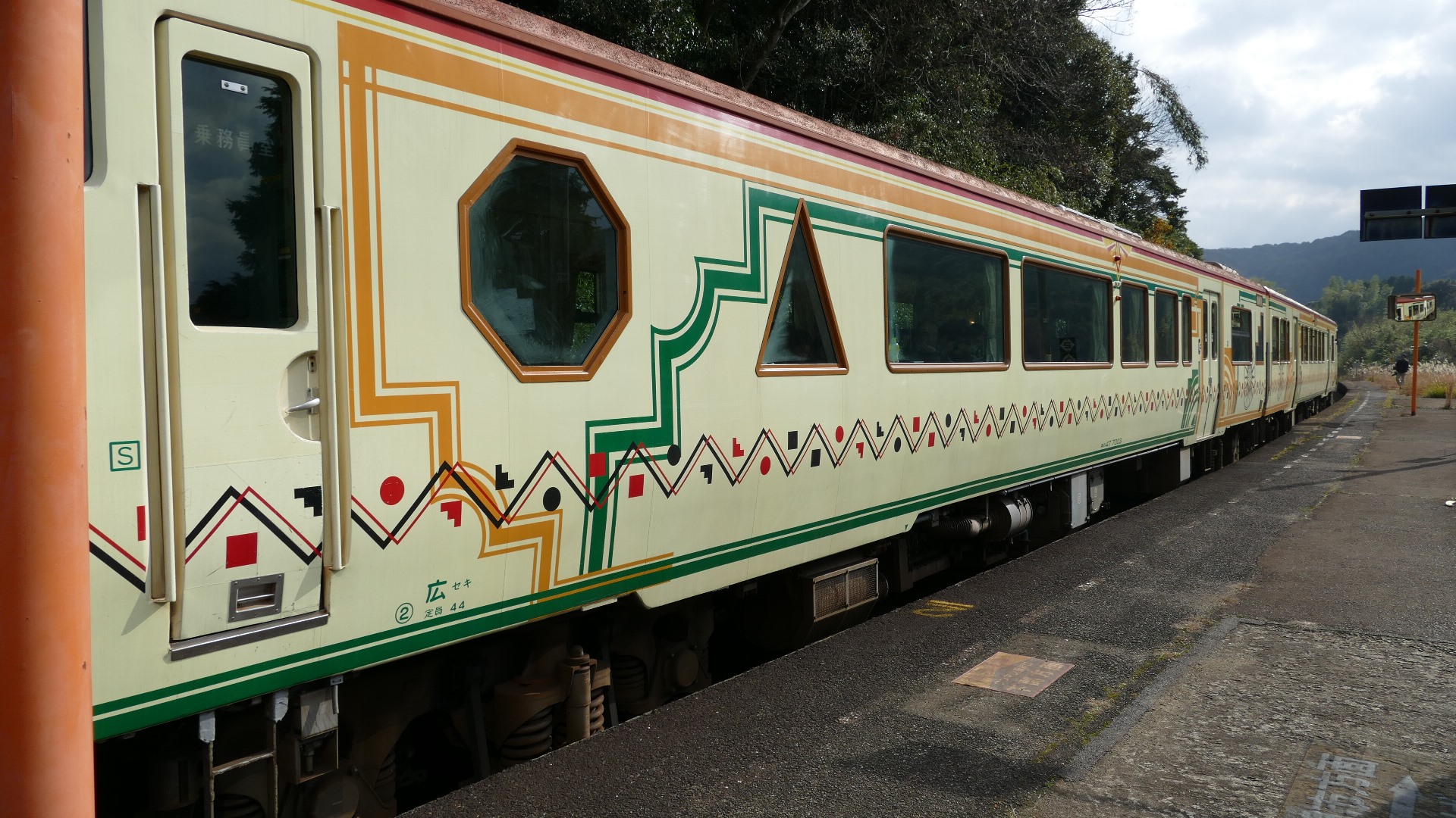 | 出発を待つ。 広島駅 | キハ47型2両編成、1号車指定席7001、2号車自由席7002 内装も客船をイメージしている。 |
