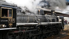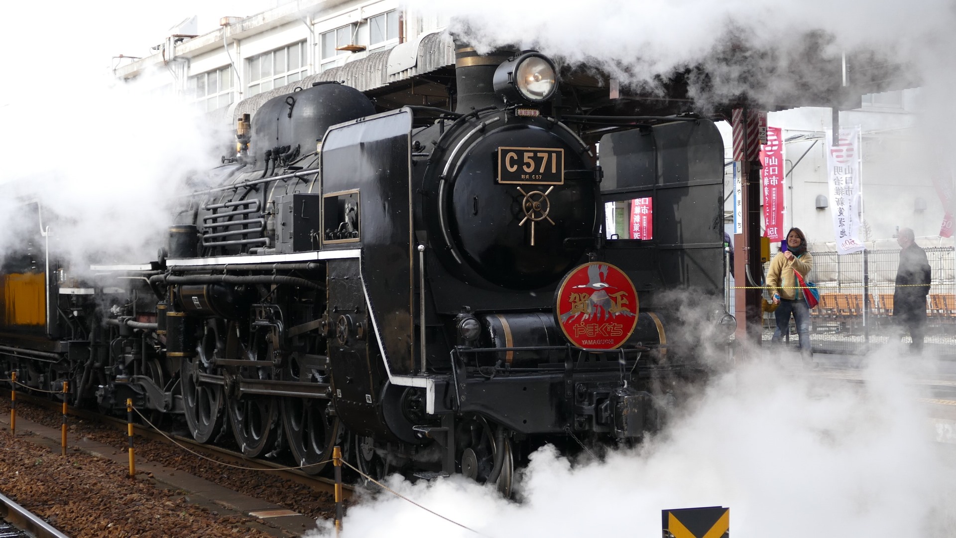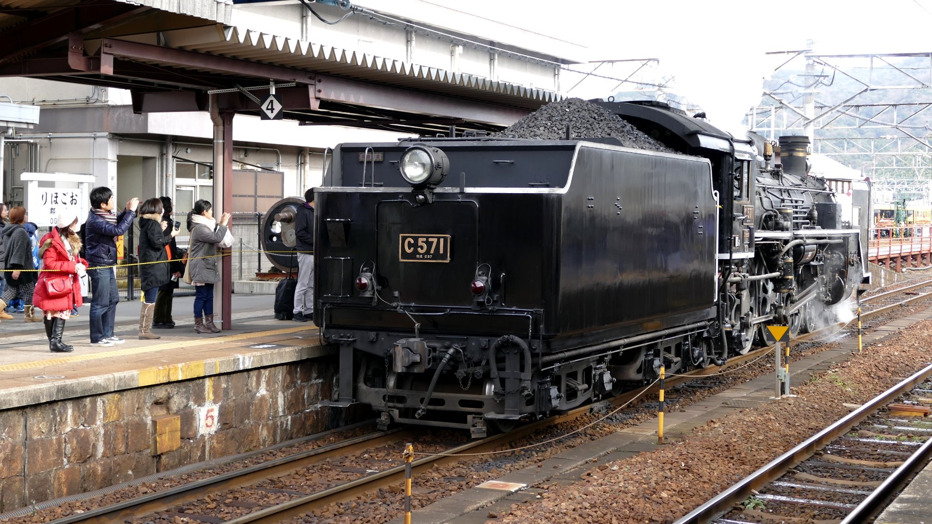 続いて「C571」入線 | 「C57」は「貴婦人」と呼ばれている。またファンからは「シゴナナ」とも呼ばれている。 | 「賀正」ヘッドマーク | ||||