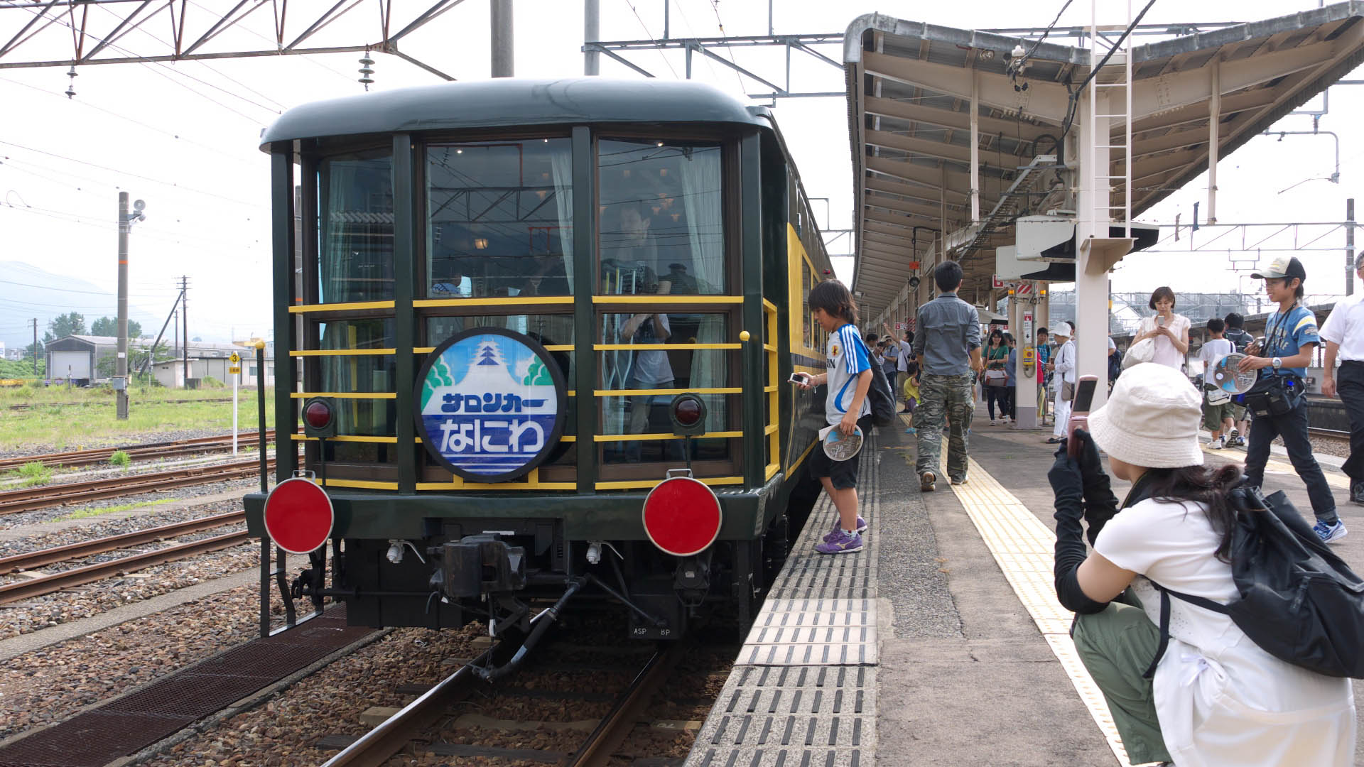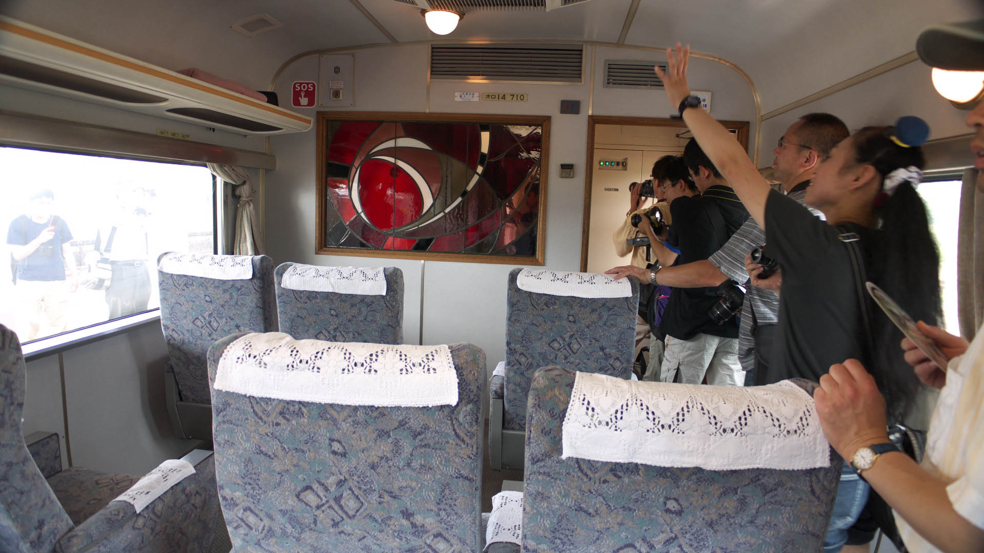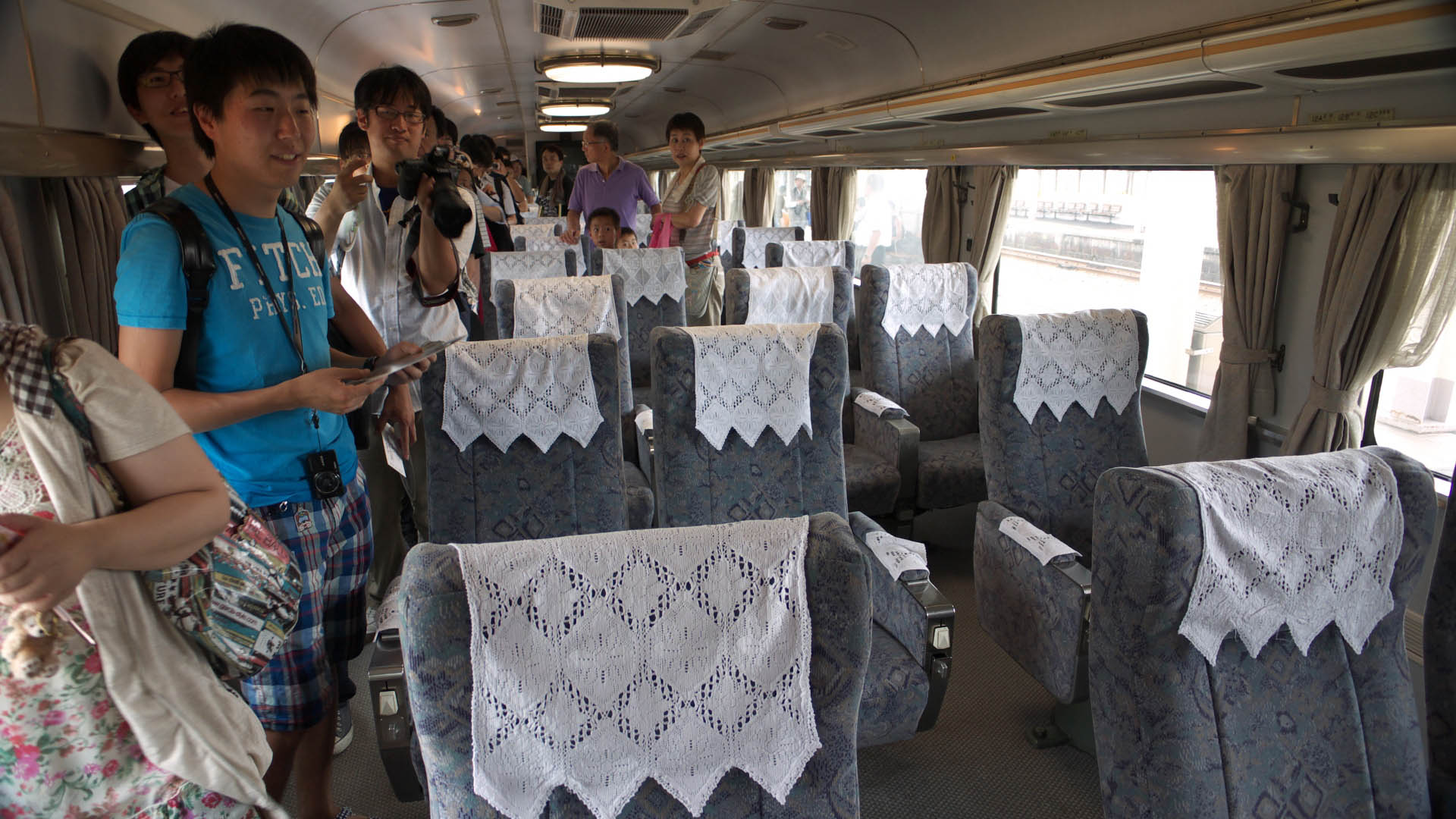 | 敦賀駅にて無料配布された入場券 | サロンカーなにわ(オロ14)の座席は、2+1・1+2と変則配列。 ここもビックリするような人出だった。一般社会人は休みを取って来ているんだろうか? |