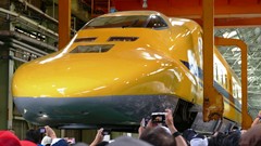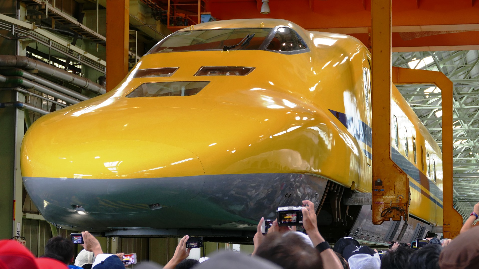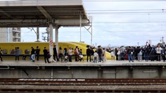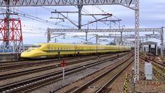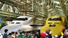 | ドクターイエロー(東海道・山陽新幹線電気軌道総合試験車) 923形 2000年に登場したJR東海所有のT4編成(2025年引退)と、2005年に登場したJR西日本所有のT5編成(2027年引退予定)がある。 両先頭車に監視用カメラを備え、1号車に電力・信号・通信、4号車に軌道関係、また7号車は添乗員用に50席を設置している。 |
