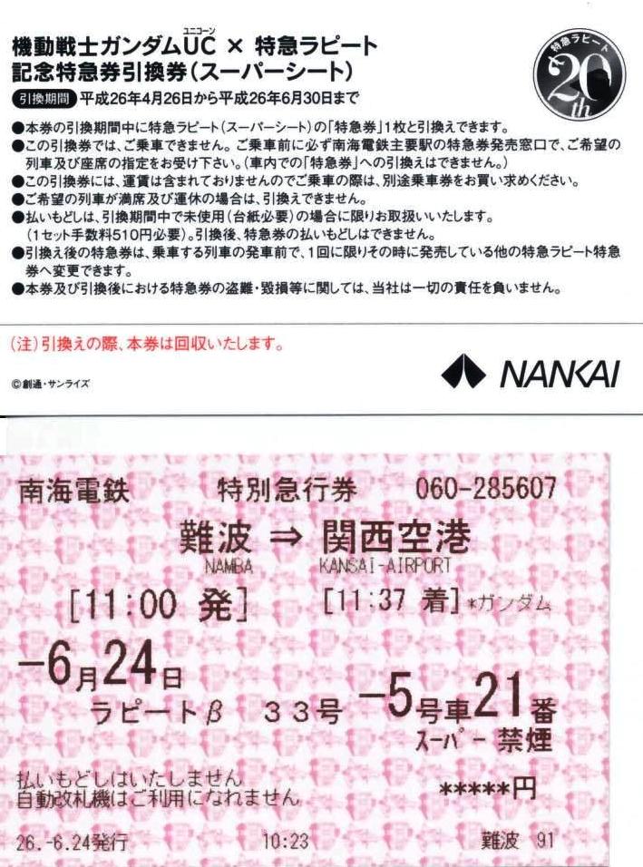 記念特急券引換券(スーパーシート) | 引換券とラピートβ33号指定席券 引換券は引換え時に回収されるとあるが、もらえた。 |