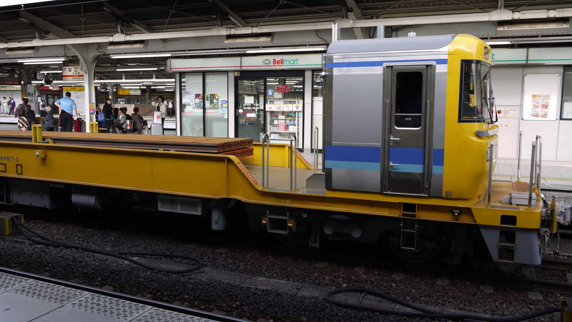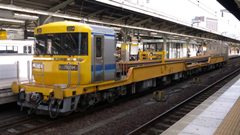 | 25m定尺レール運搬用 キヤ97系 2008年(平成20年)に登場。JR東海が保有する事業用気動車。 空車時の最高速度は110km/h、レール運搬時は95km/hである。最大レール積載量は、25mレール×46本。 |