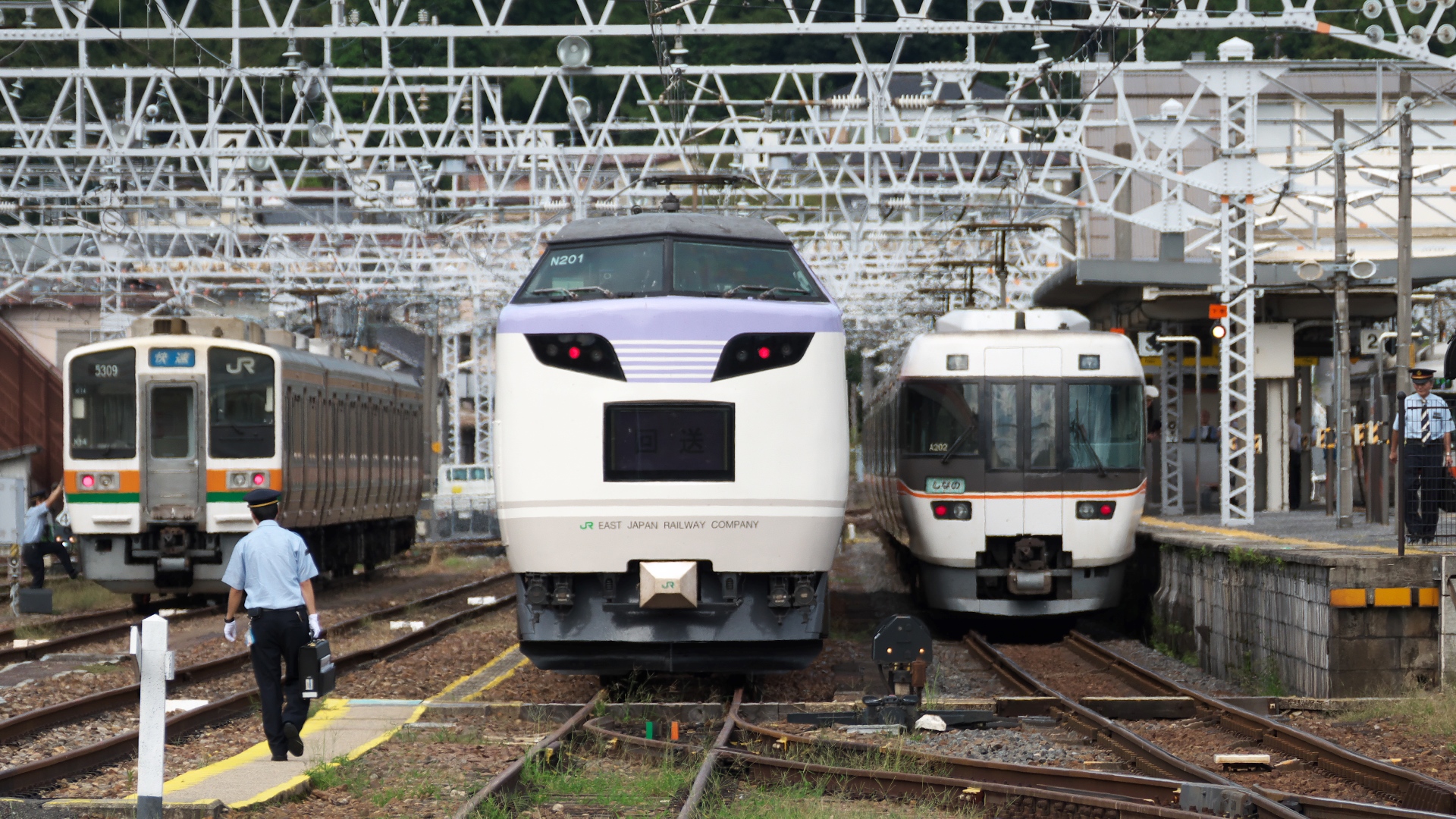 穂高駅では27分停車。 特急しなのが追い越していく |