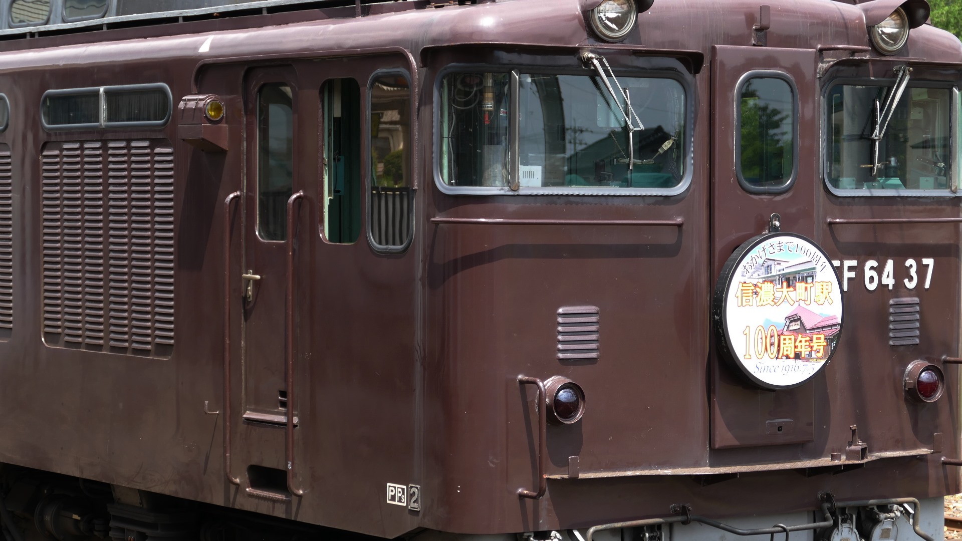 信濃大町に停留 戻りは信濃大町1447-松本1640 戻りの先頭は「EF64 37」 100周年号のヘッドマーク付き |