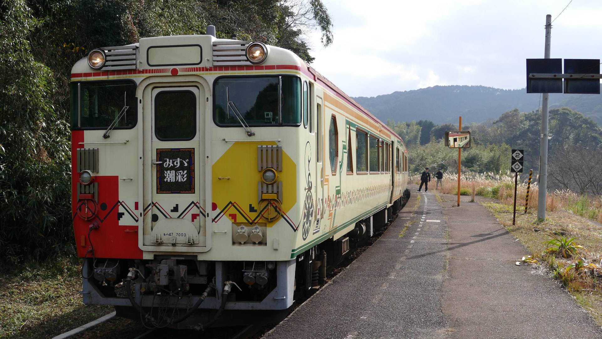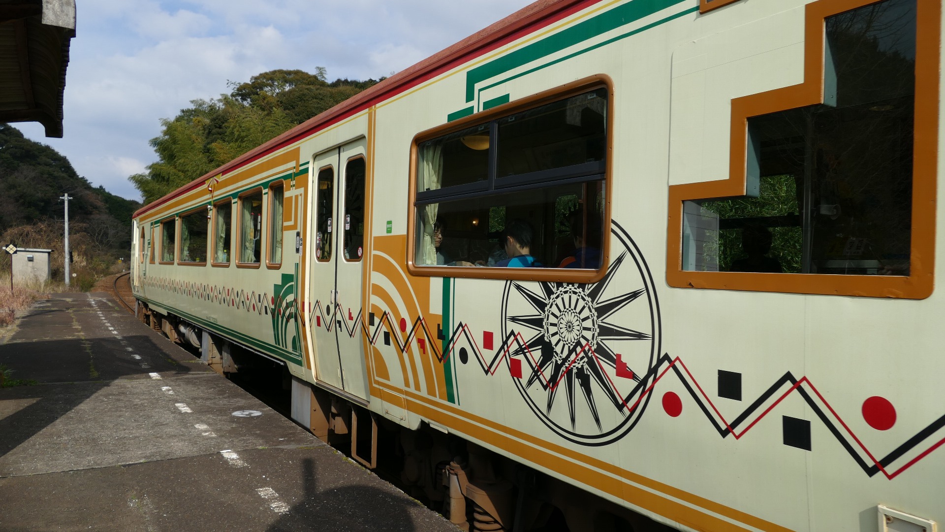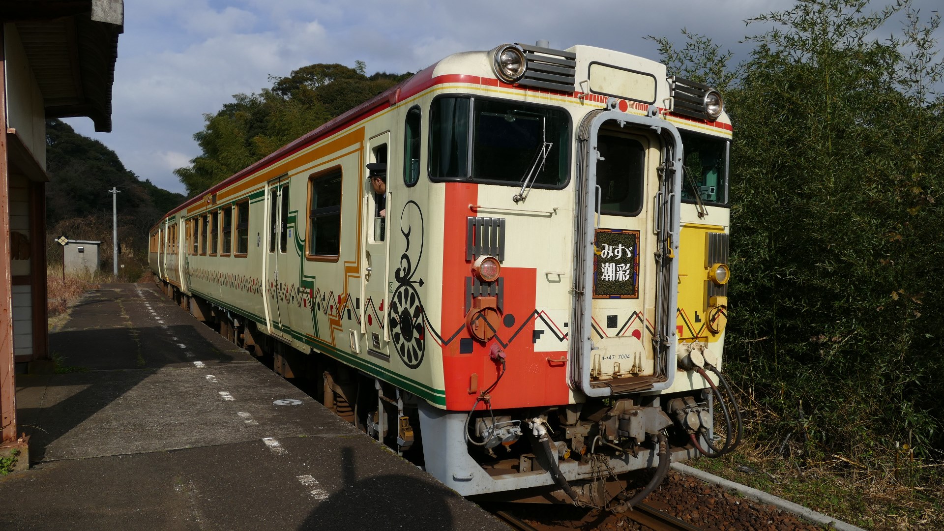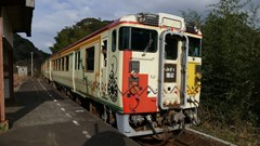 | キハ47をアールデコ調に統一したレトロな列車「みすゞ潮彩」。新下関→下関を発って玄界灘から日本海の雄大な自然の中を進み、みすゞのふる里、仙崎へ向かう。 「みすゞ潮彩」は 平成29年1月29日(日)をもって 運行を終了。 特牛駅 |