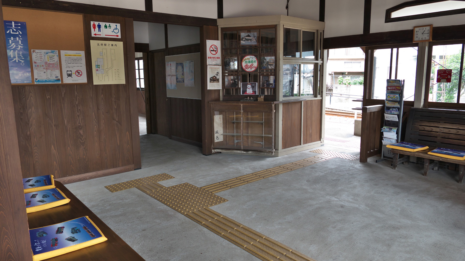 | 北府駅の待合室。 福鉄クッションやこの駅がソフトバンクCMロケ地だと書かれている。 |