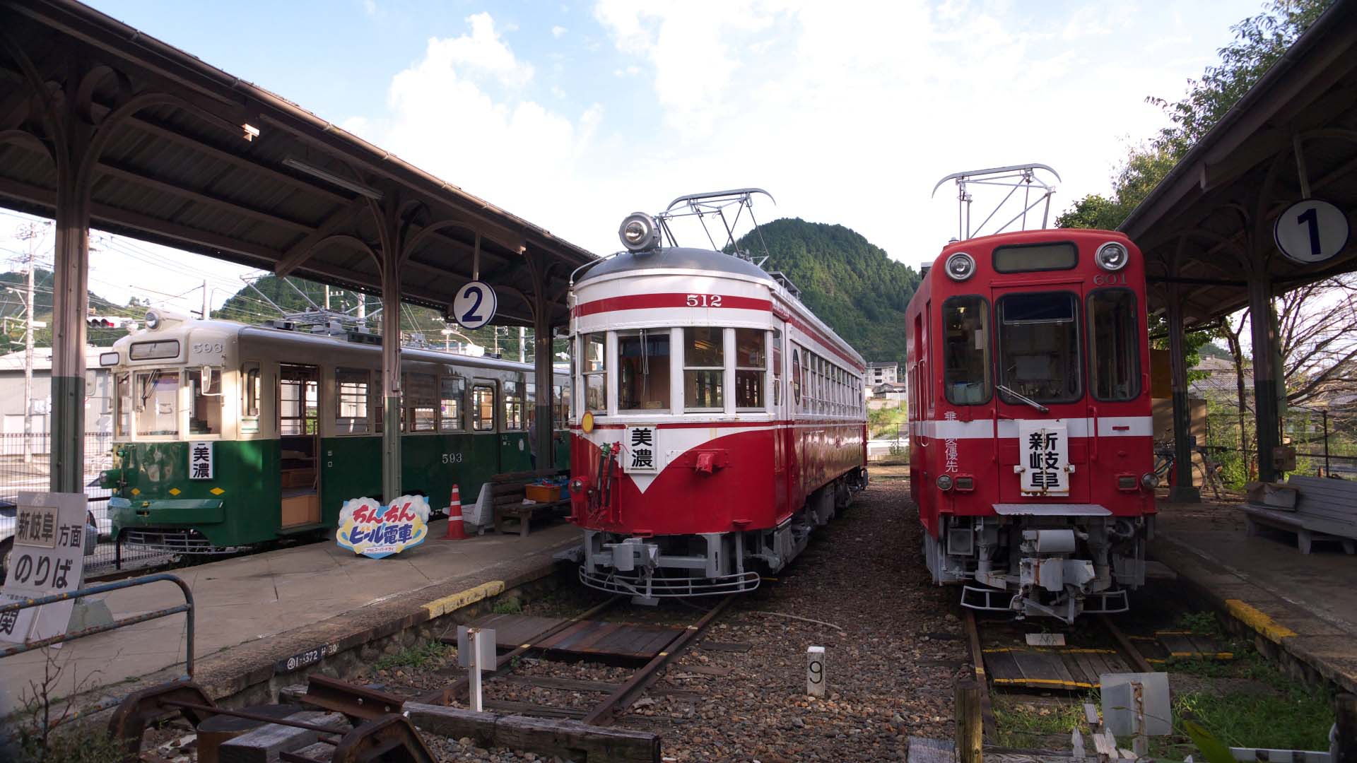 | 旧名鉄 美濃駅 駅舎 | 懐かしい600V線区の電車たち 右から、モ601・モ512・モ593形 |