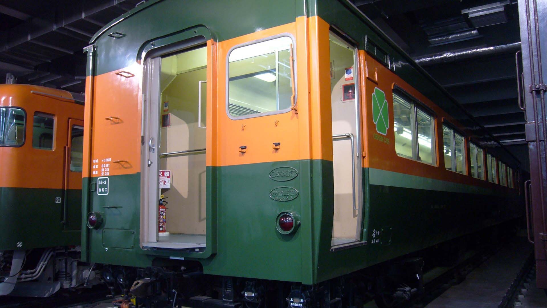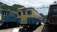| 屋外展示の117系 車内にはセパレートエアコンがあり室外機は意外な所に。車内では飲食も可能。 |