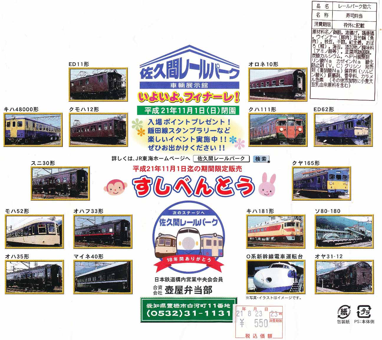 | 佐久間レールパーク 2009.9.23 飯田線中部天竜駅構内にあり、平成21(2009)年11月1日(日)をもって閉園した。展示車両は「リニア・鉄道館」へリニューアル展示されている。 「佐久間レールパークフィナーレ」はこちら |