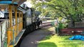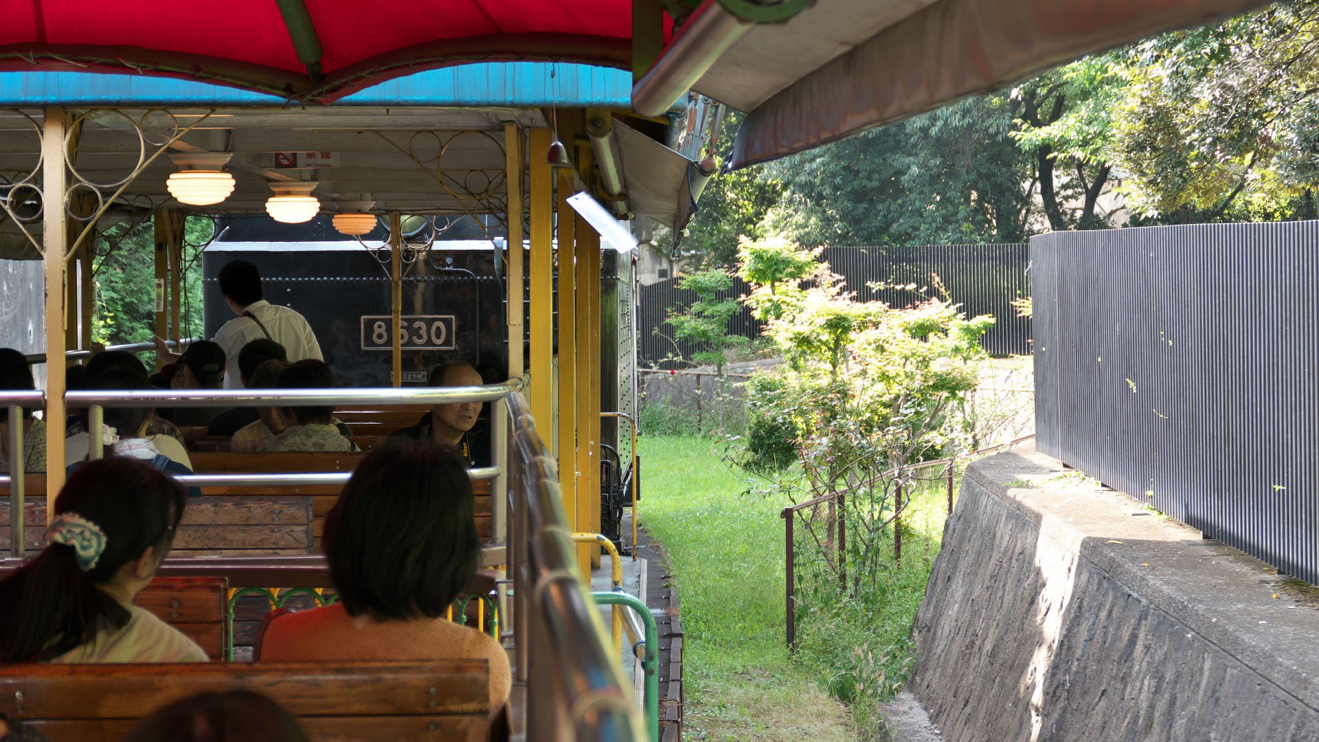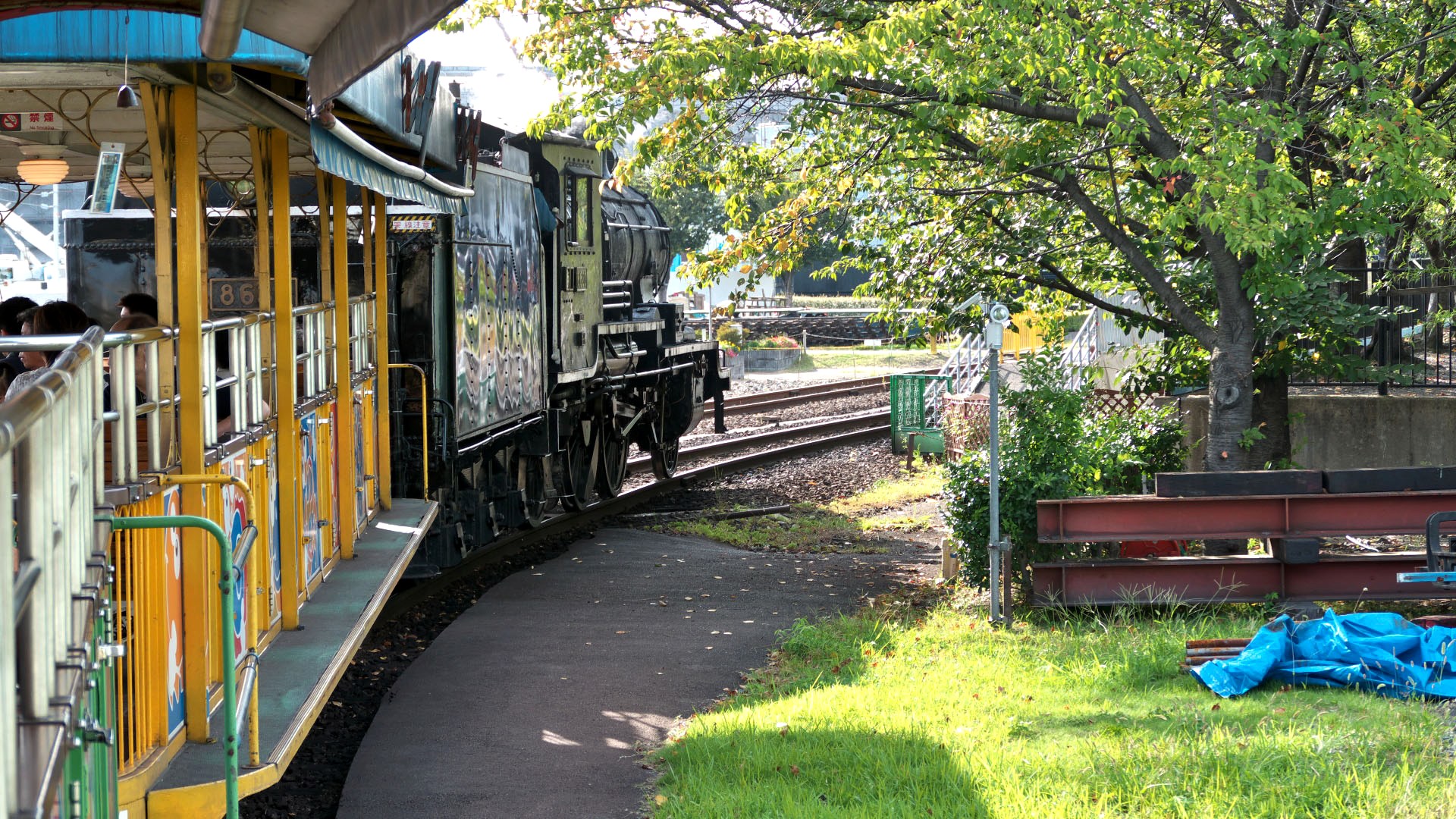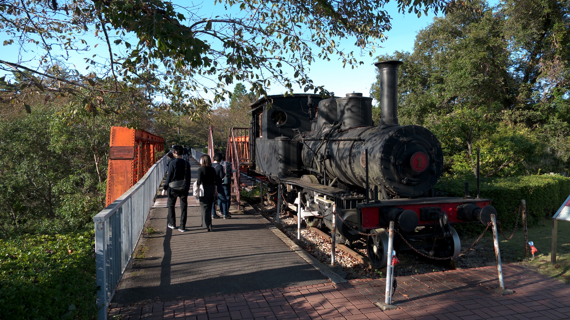 | 蒸気機関車 (案内板) 12号(明治7年英製)と9号(明治45年米製)の2両が存在。動態保存されている日本一古い蒸気機関車。 園内の800mの路線(2駅)を5分かけて運行されている。2019年1月には初の女性機関士が誕生している。 |