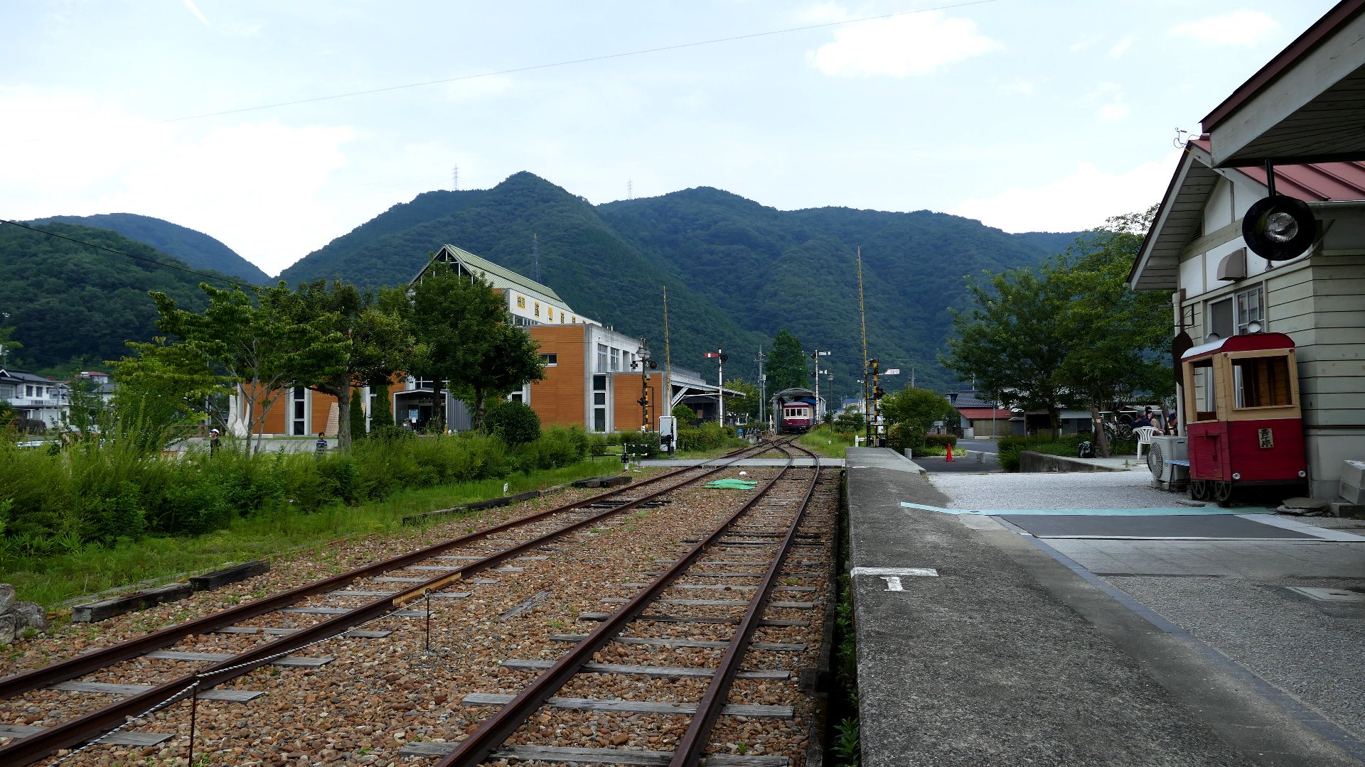 2.3番線の島式ホームと2番線の線路 | 線路の端になぜか台車が一つ。 | 駅舎2階から見た風景。 | ||||