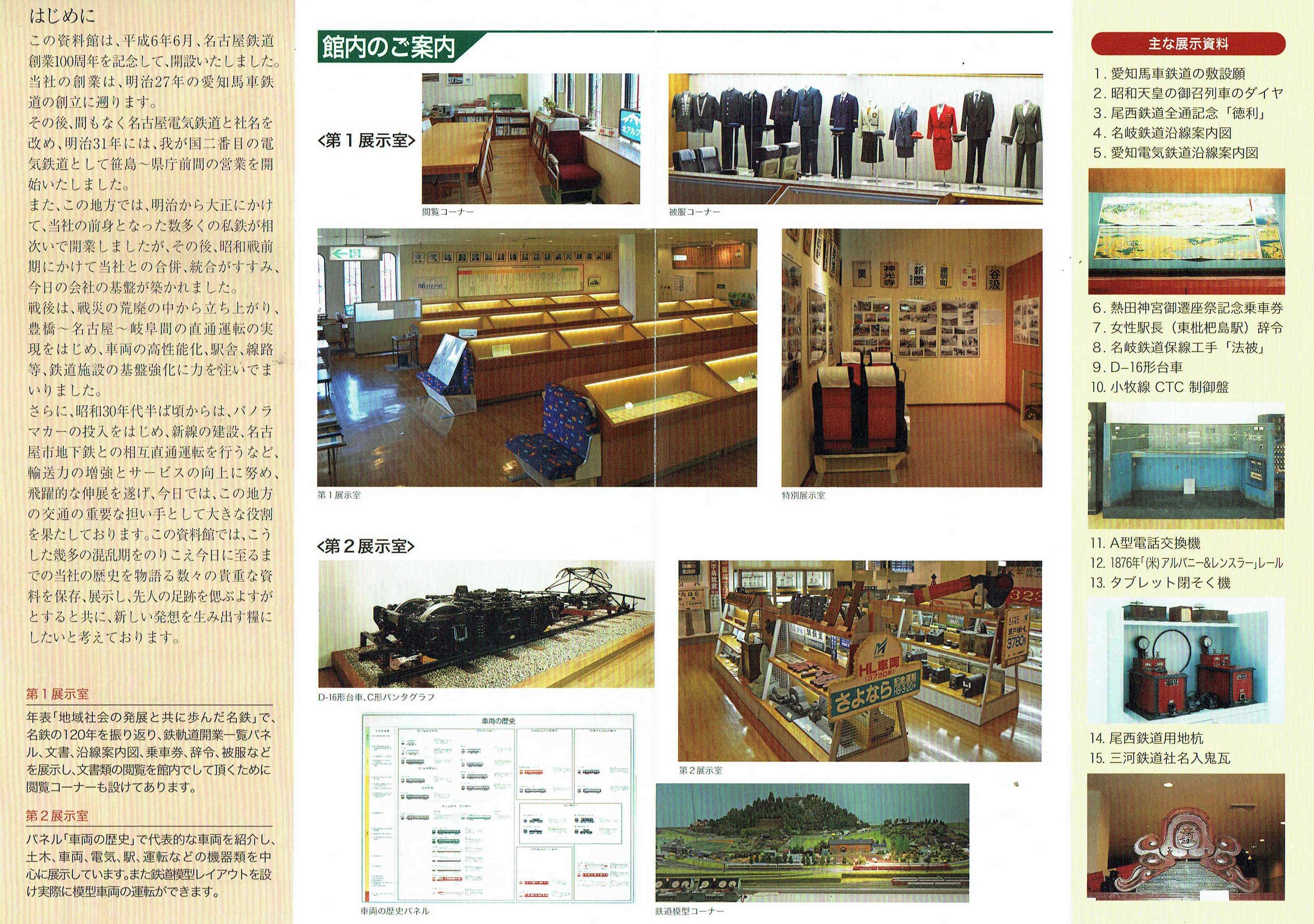 | 名鉄資料館 2017.6.6 名鉄創業100周年を記念し、1994(平成6)年に名鉄教育センター敷地内に開館したが、2020(令和2)年12月25日に 施設の老朽化を理由に閉館した。展示物は名鉄グランドホテル客室内や名鉄倉庫に保管されている。 |