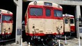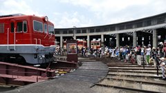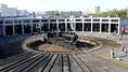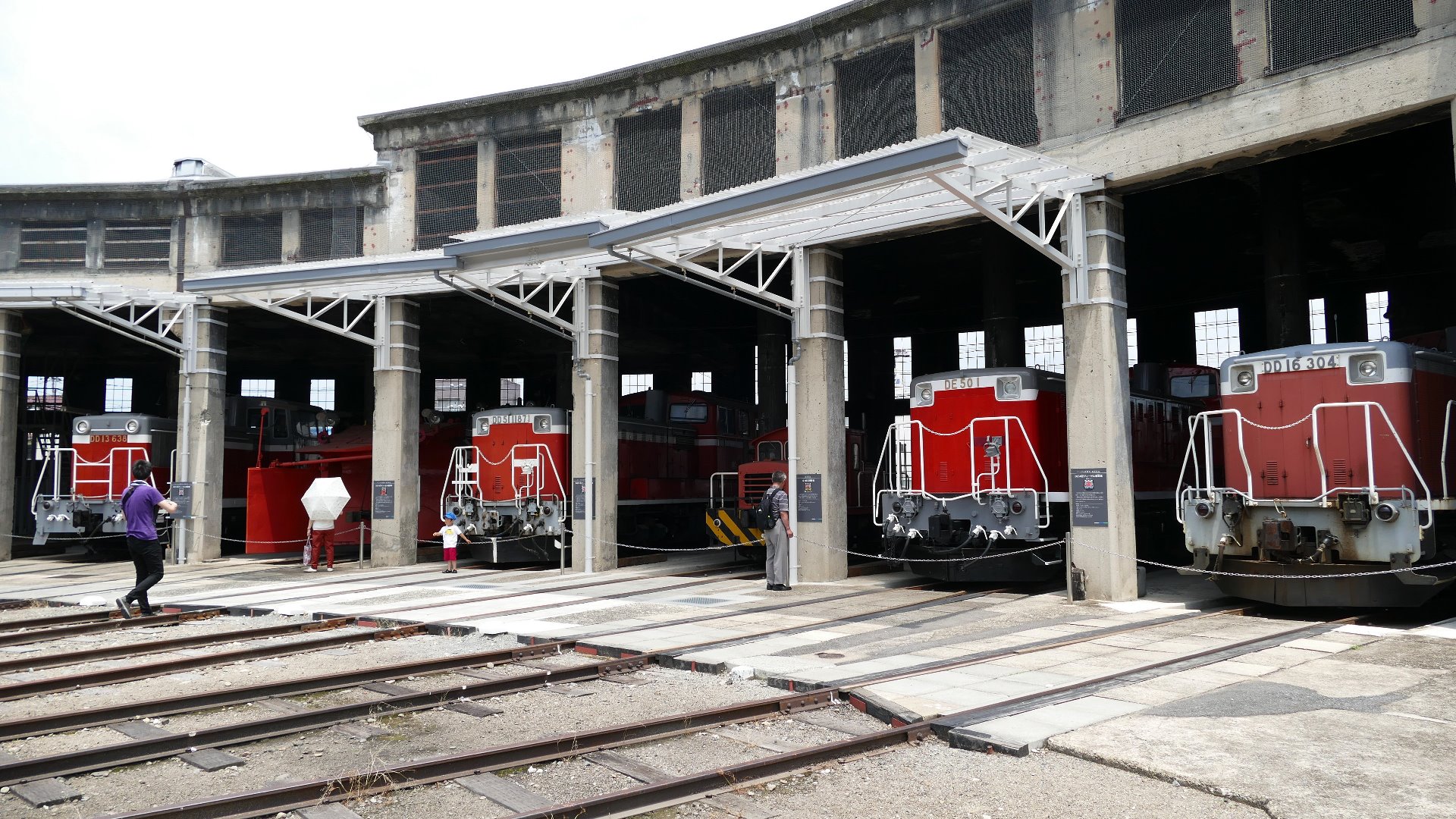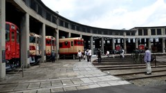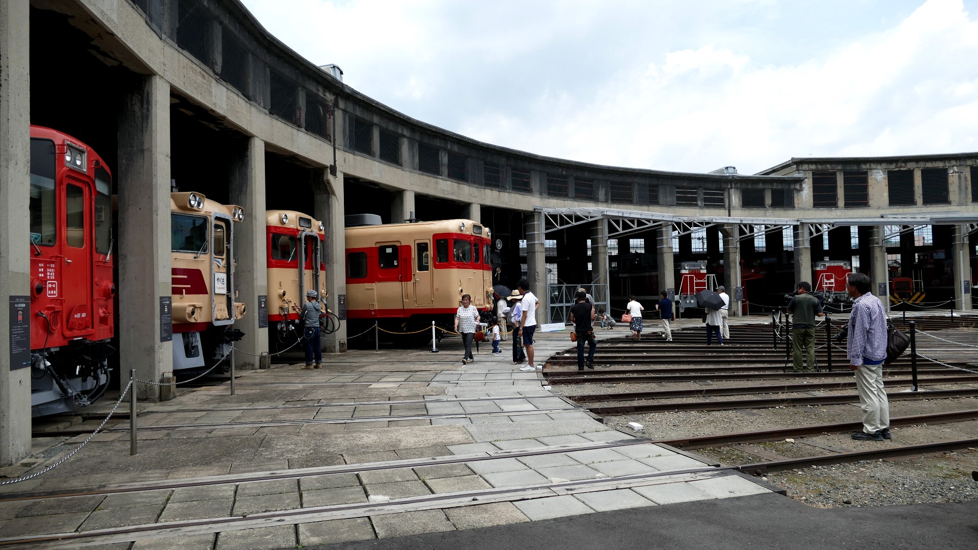 旧津山扇形機関車庫の静態保存内燃動車 1936年に鉄筋コンクリート造りで、梅小路に次ぐ現存二番目の規模である。 |