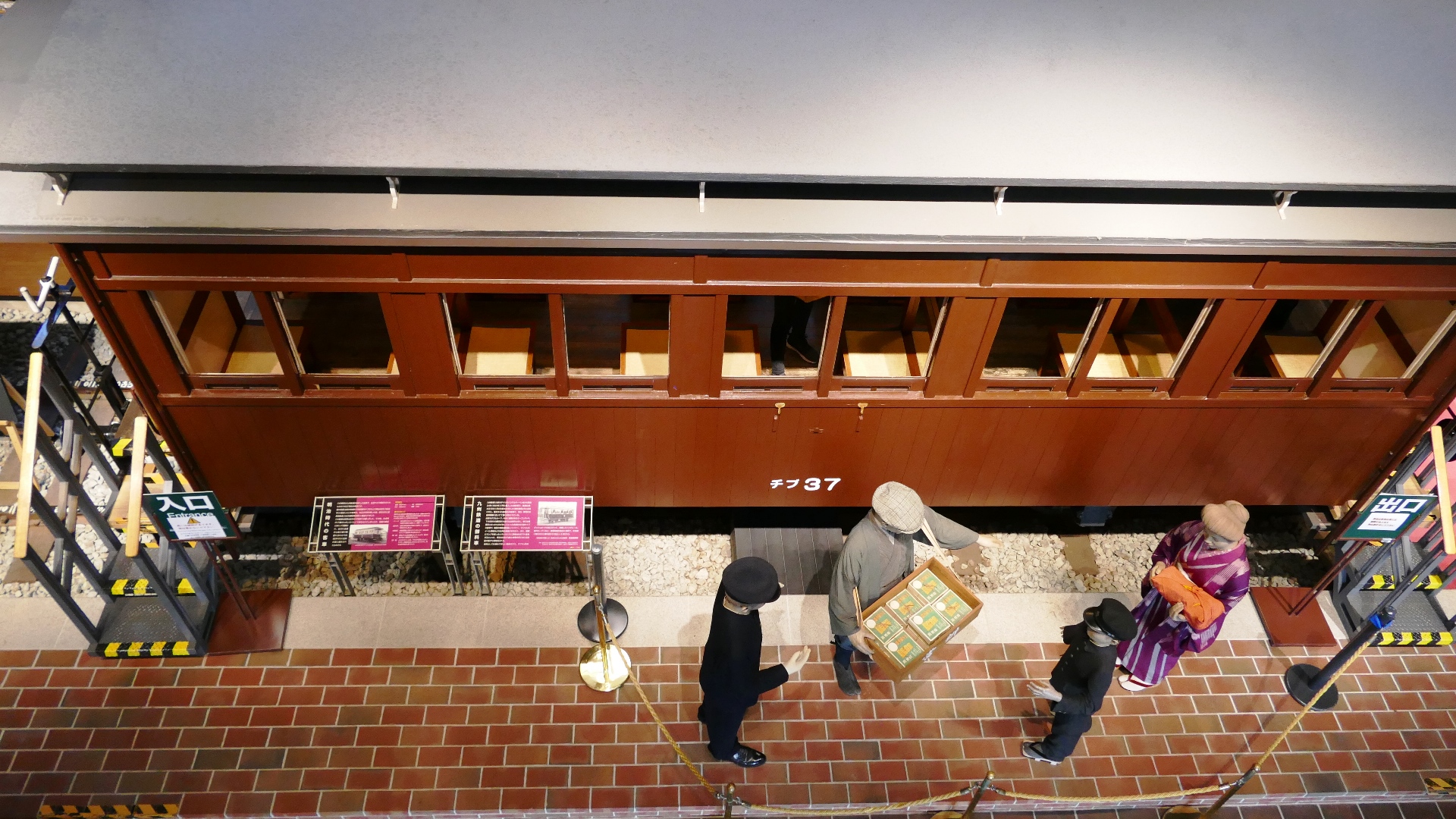 クハ86形と左奥は中間車モハ80形 ホームも旧京都駅を再現? 車内は土日の晴れの日のみ公開らしい |