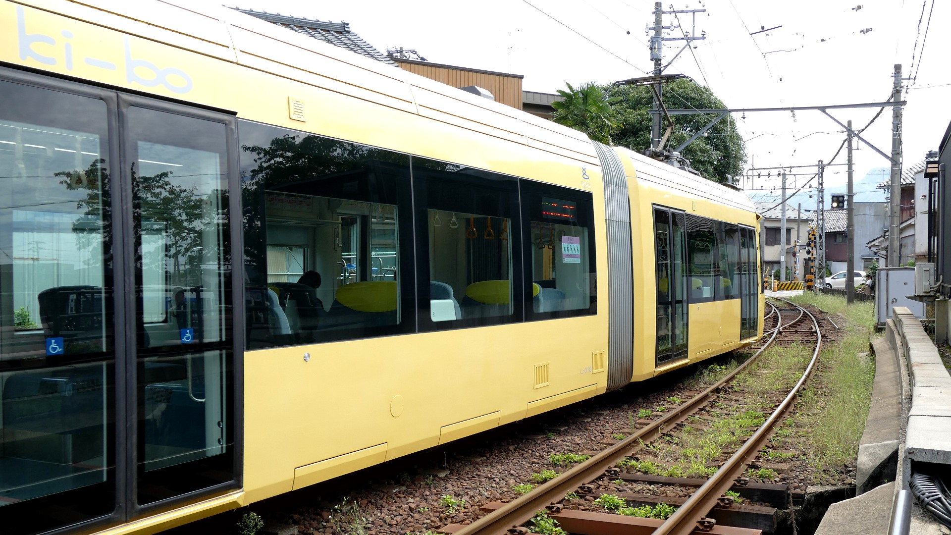 | L形(愛称:ki−bo) 2016(平成28)年3月から福井鉄道福武線(営繕武生)〜越前鉄道三国芦原線(鷲塚針原)の相互直通運転を開始したことに伴い えちぜん鉄道が導入したLRV(超低床車両)。先に導入された福井鉄道F1000形が3車体連接車に対し、L形は2車体連接車。 |