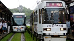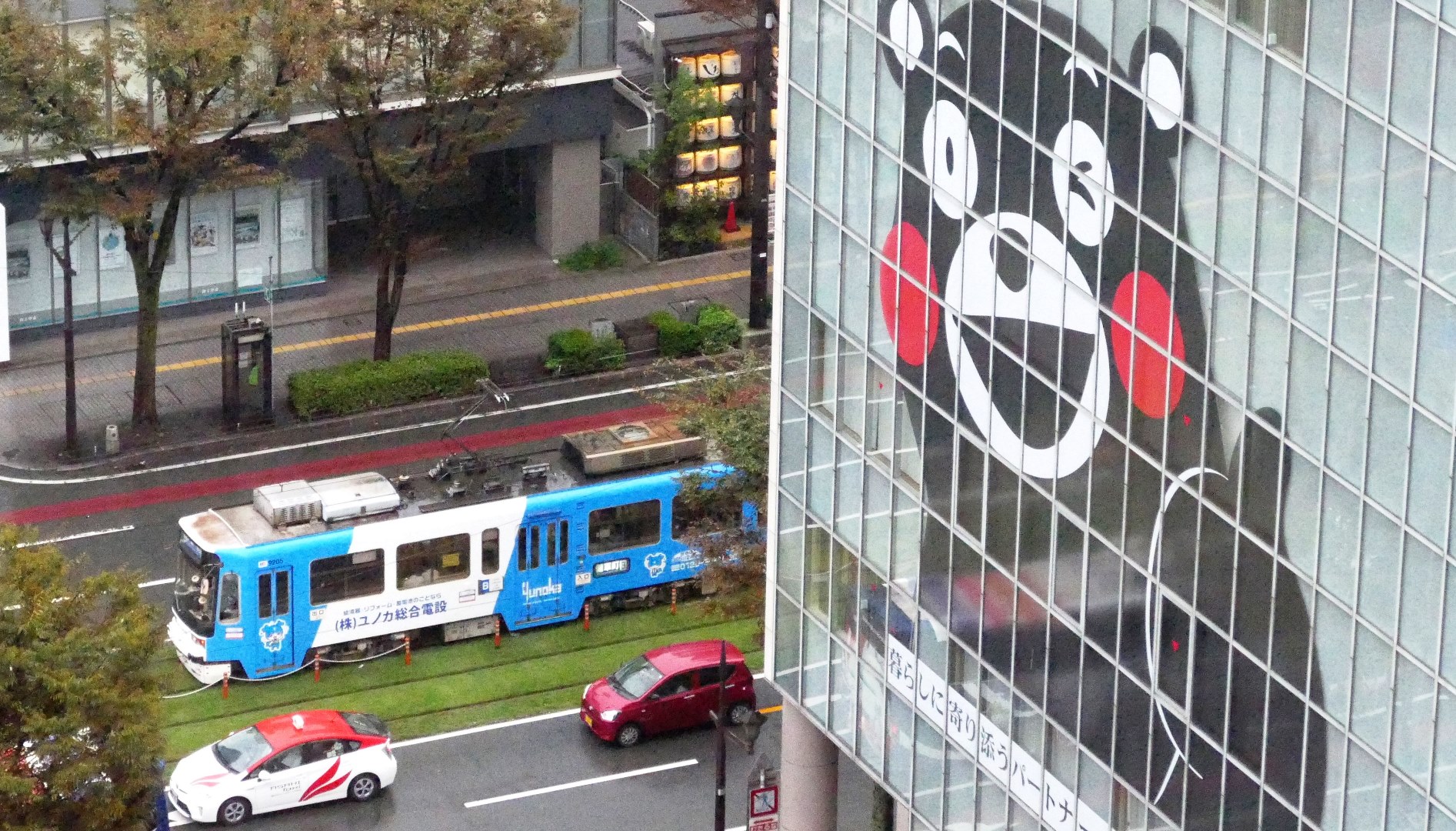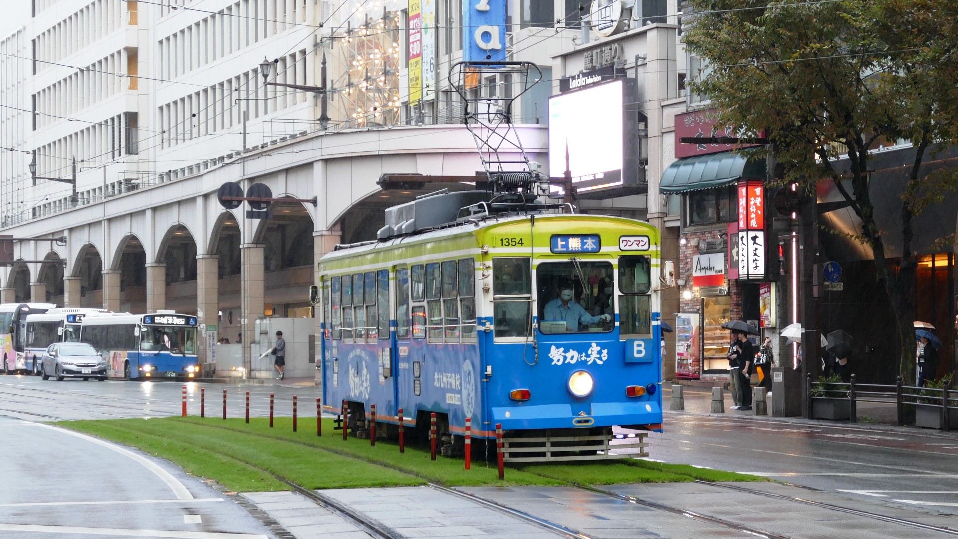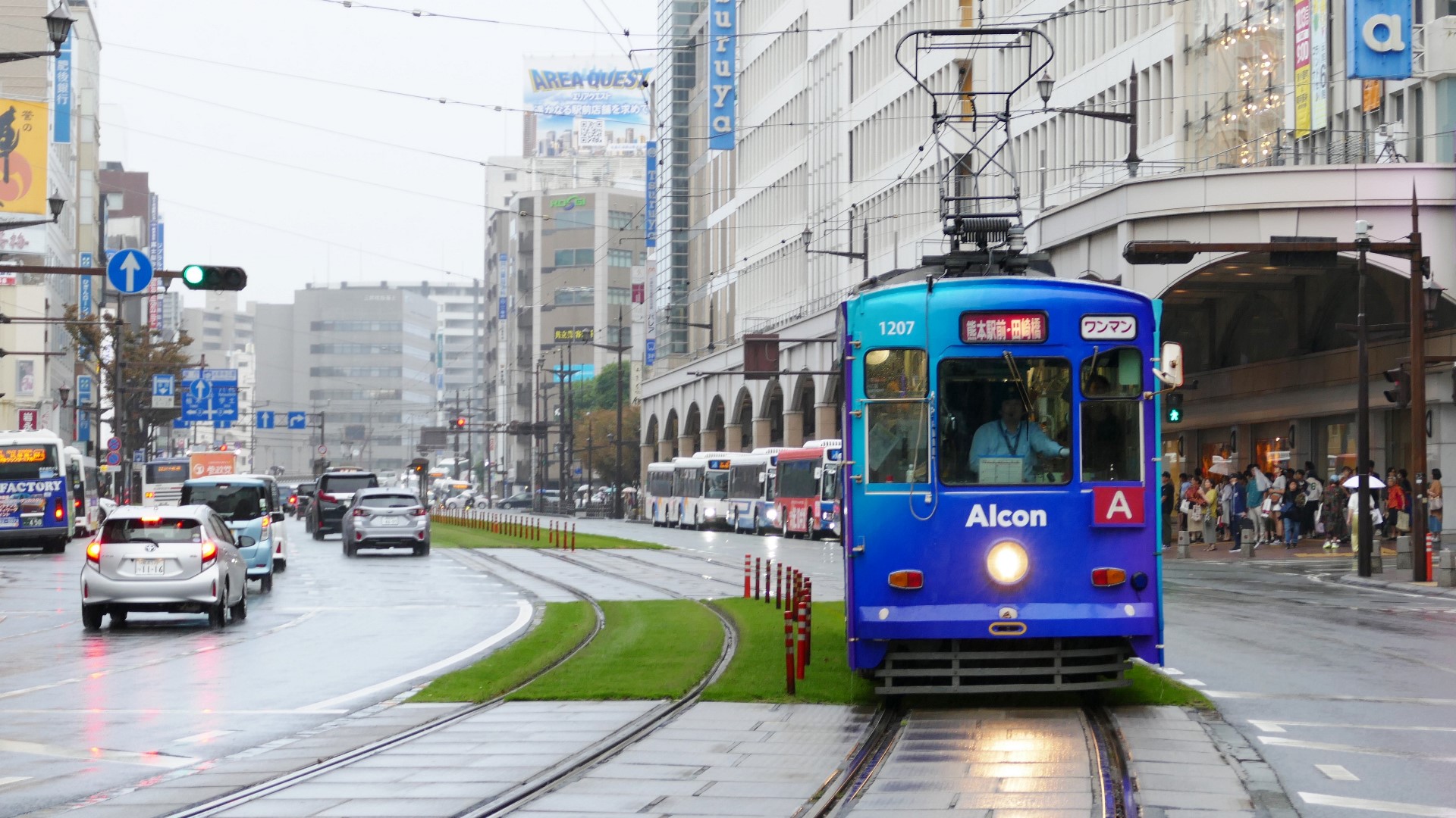 | 熊本市電 路線数5本・運行は2系統、一部専用軌道もある。直流600v・全線標準軌複線。均一運賃 2025(令和7)年に上下分離方式が導入され、車両管理や運行管理を担っていた熊本市交通局は廃止されることになった。 2024.10 |