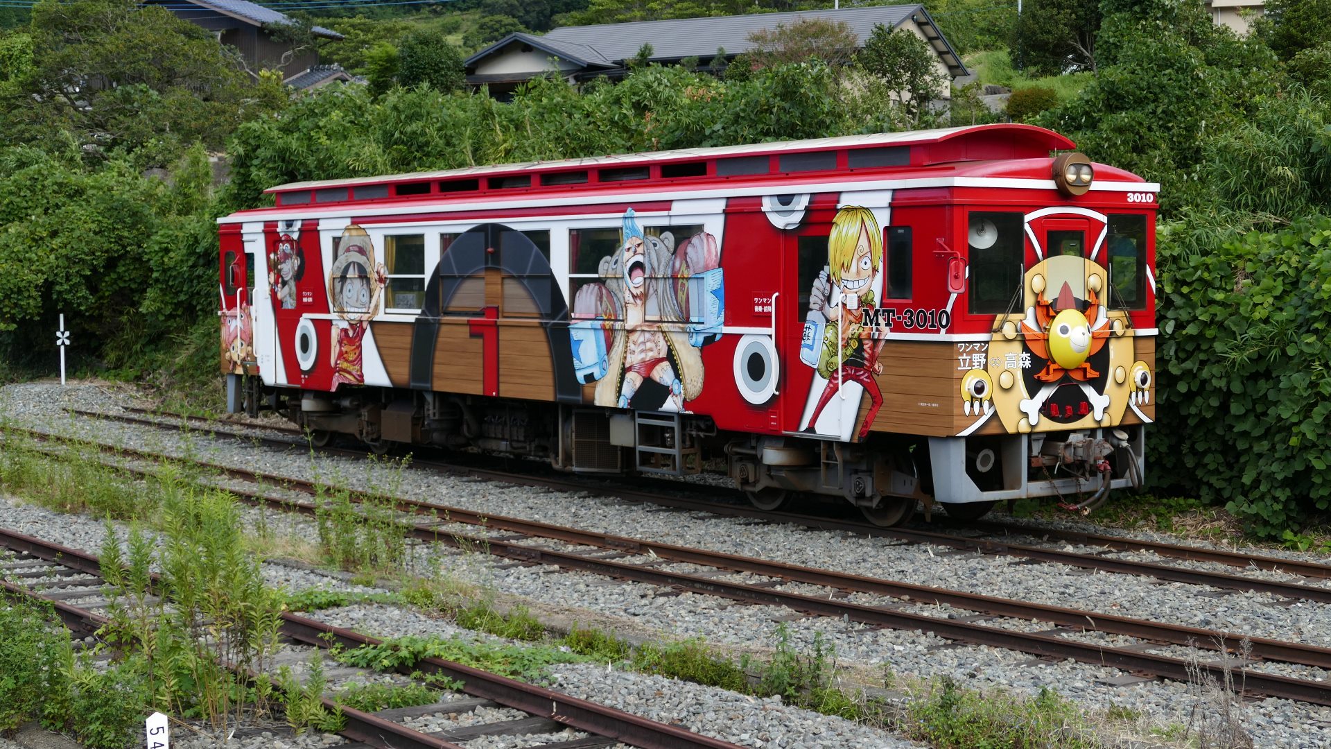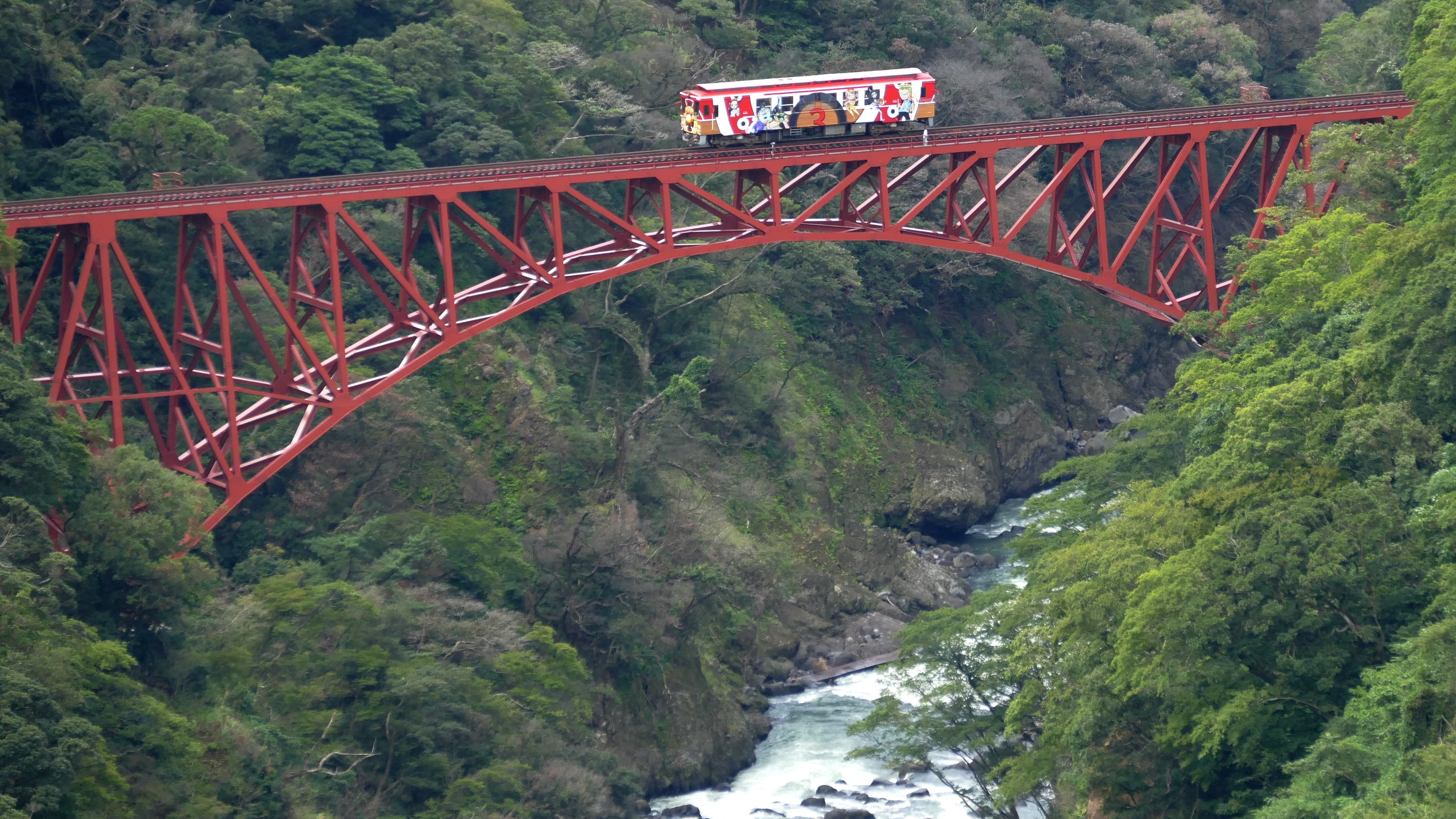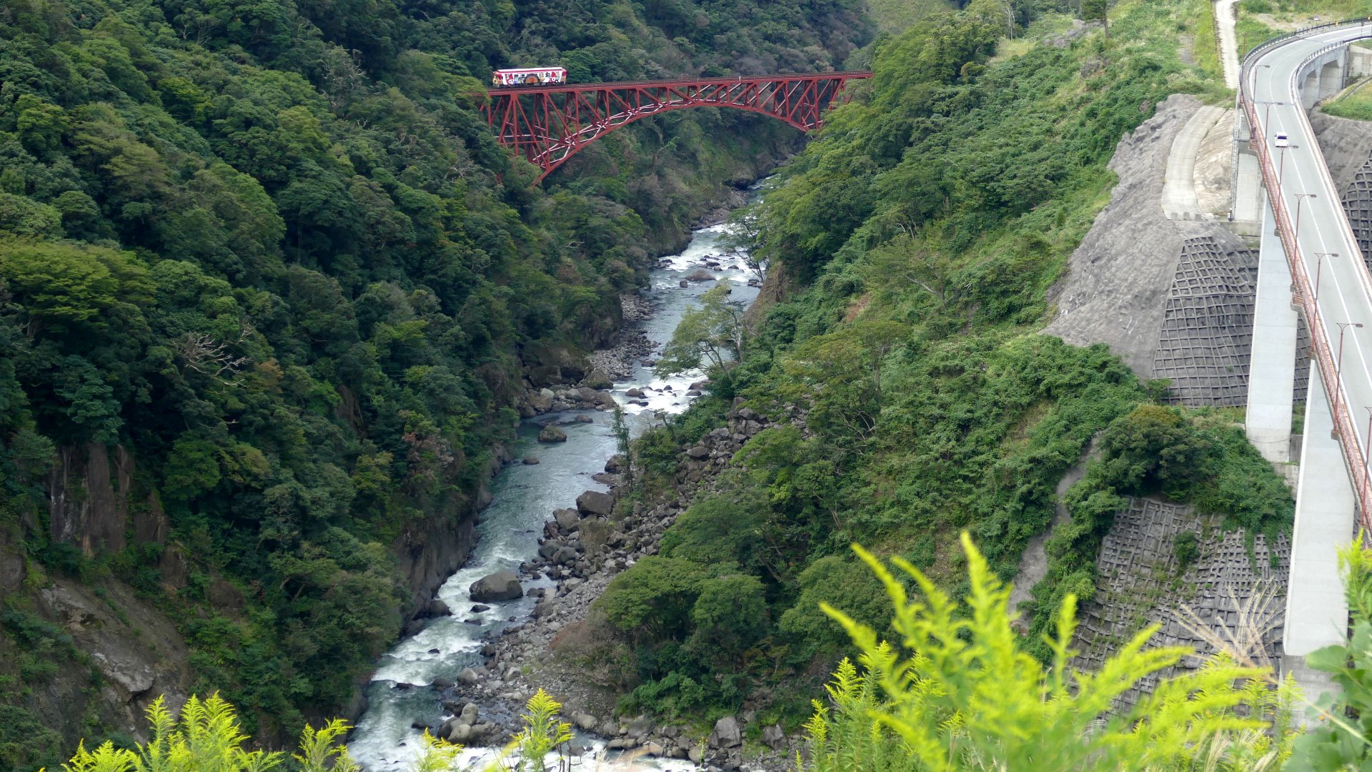 | 第一白川橋梁は川から線路まで約60mで高千穂橋梁に次ぐ高さであった。2016年4月の熊本地震から約40奥円を費やして2023年7月に架け替え復旧した。 長陽大橋展望所より | 立野鉄橋は震災での補修と補強を経て、土木遺産として復活した。 | 漫画[ONE PIECE]サニー号トレイン 立野駅構内にて |