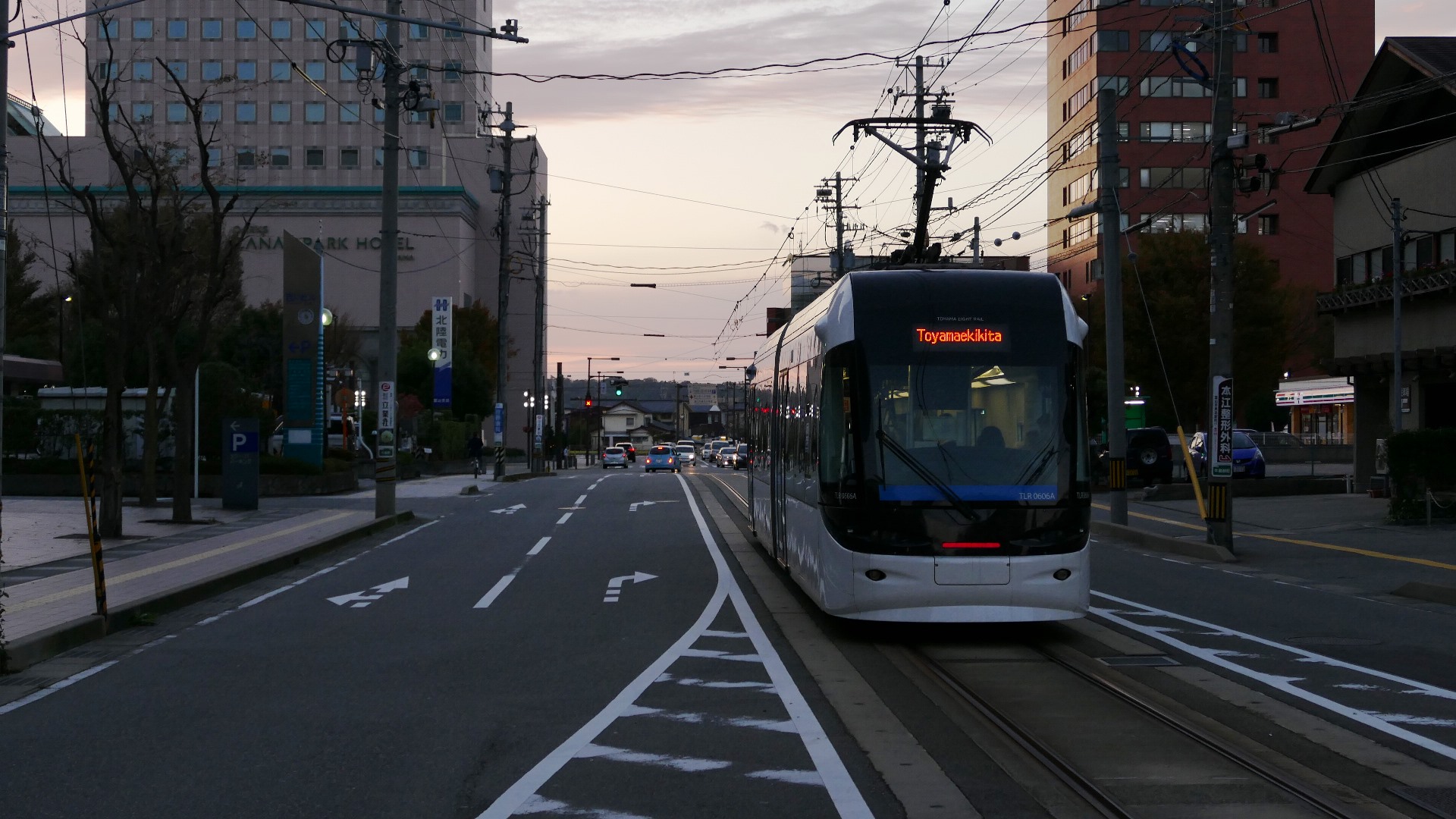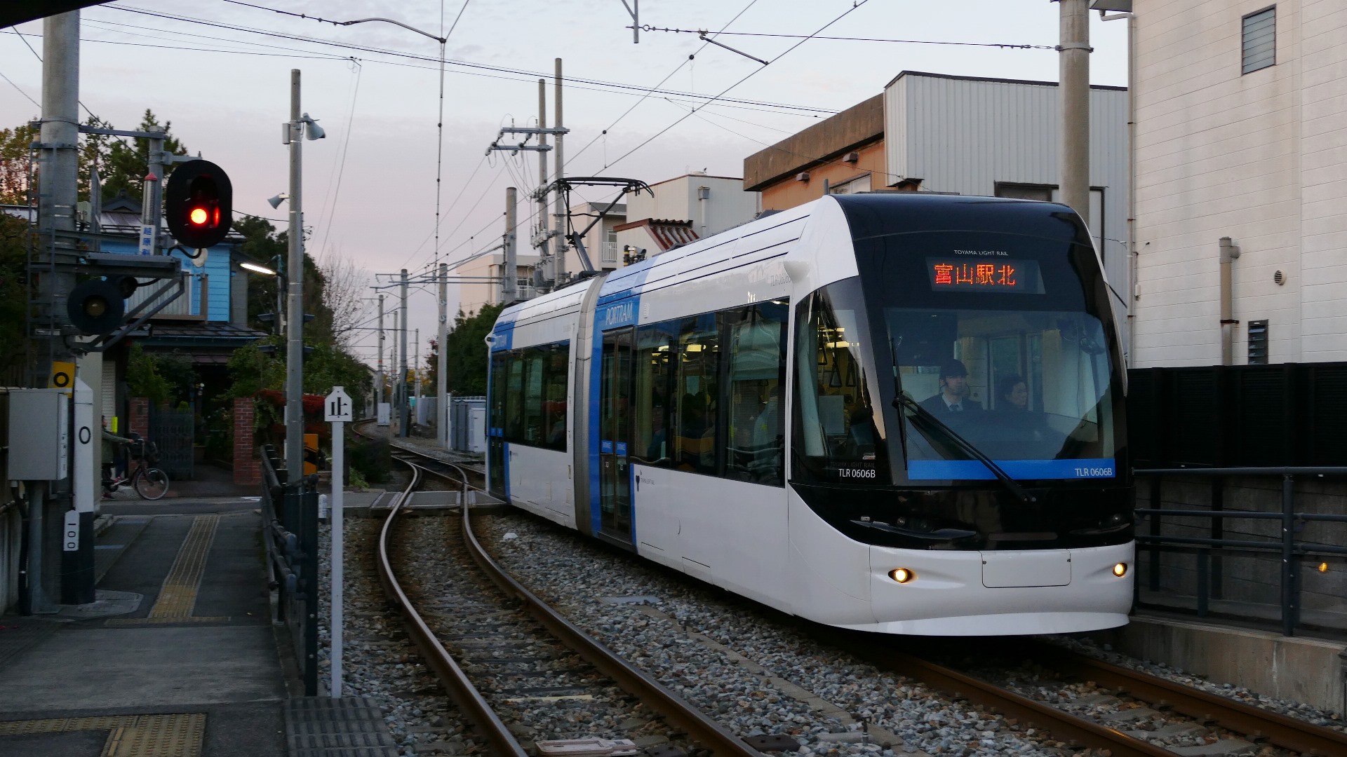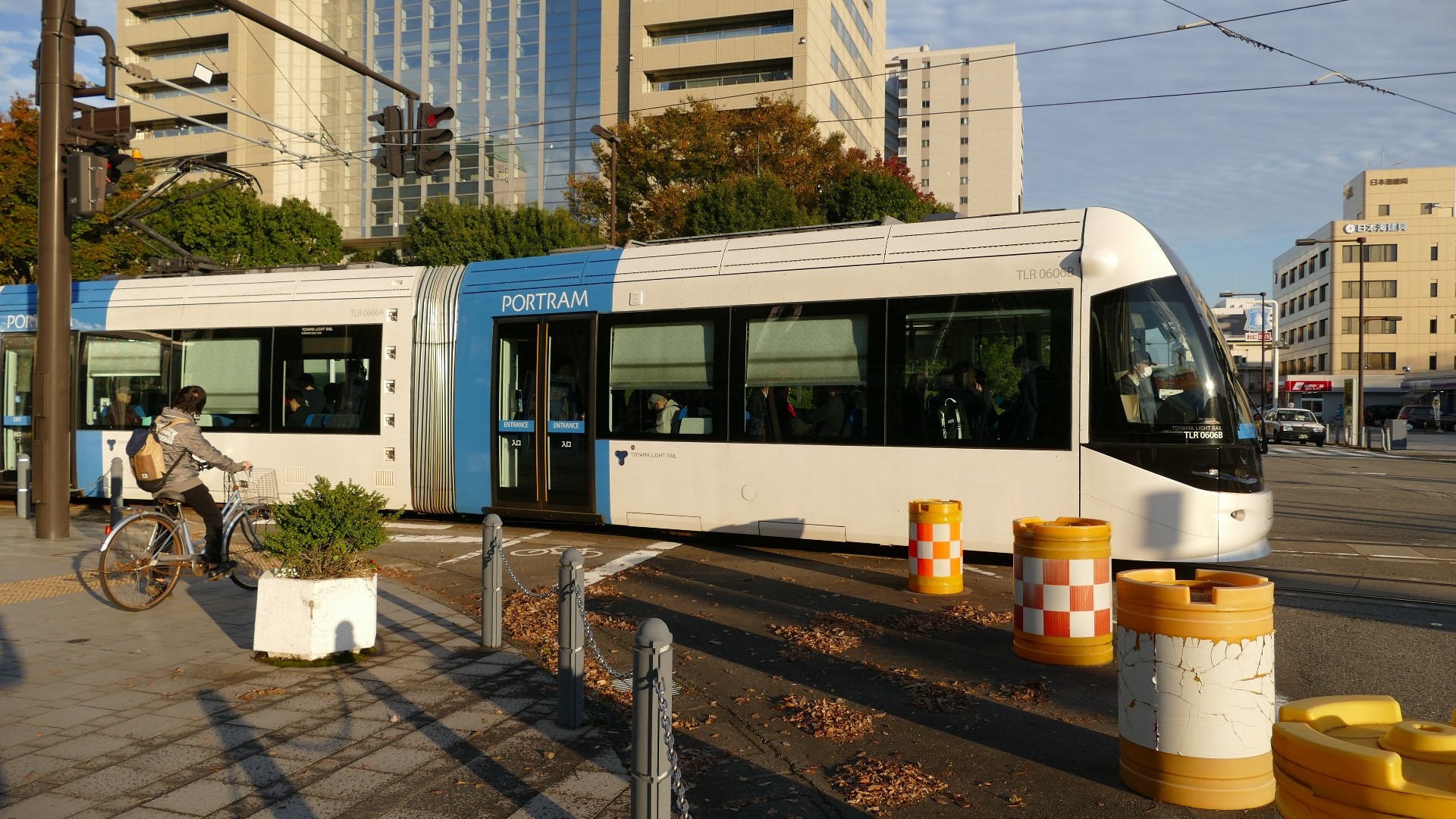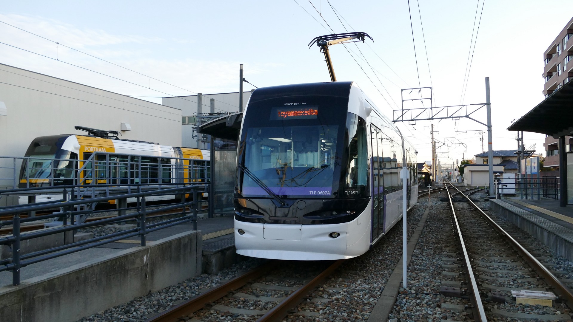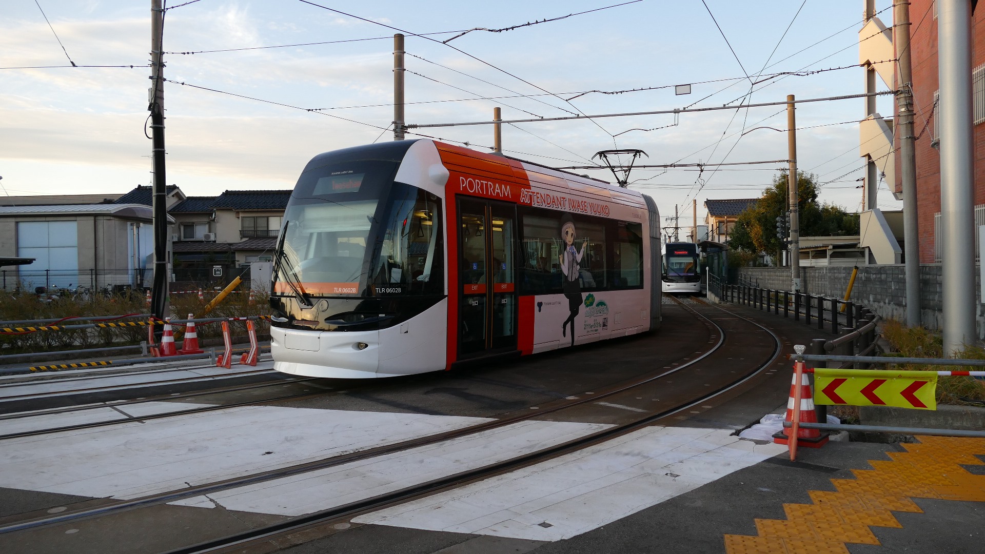 | 富山ライトレール JR富山港を引き継ぎ、路面電車(ライトレール)化して第三セクター方式で運営している。 富山駅北〜奥田中学校までを併用軌道、岩瀬浜までを専用軌道。車両は新潟トランシス製造のTRL0600形で7編成導入された。「ポートラム」という愛称は、港(port)と路面電車(tram)を組み合わせた造語。2017.11.1 |