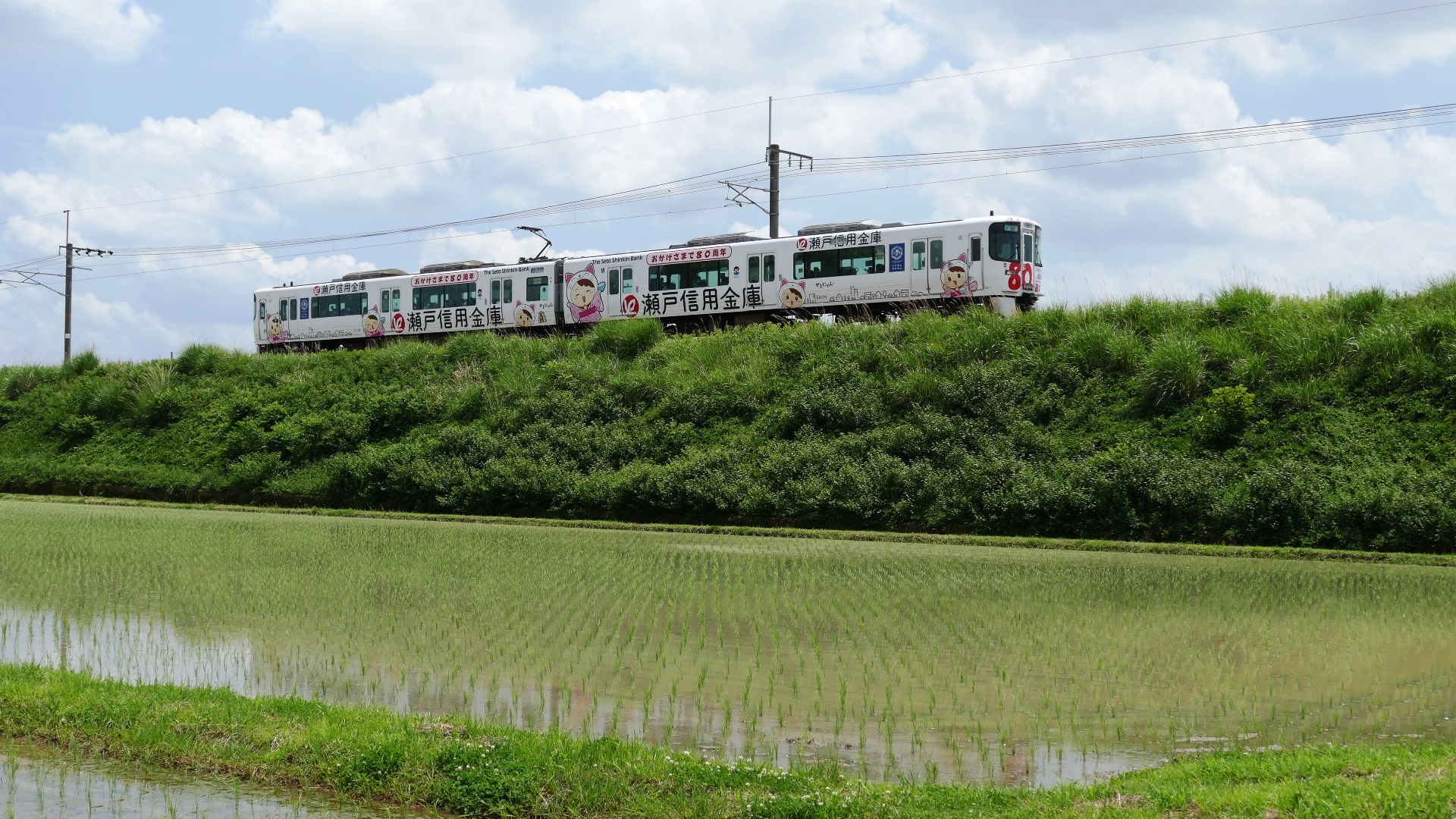 瀬戸市-瀬戸口 団体イベント列車 緑色帯の2パンタ車両4両編成 |