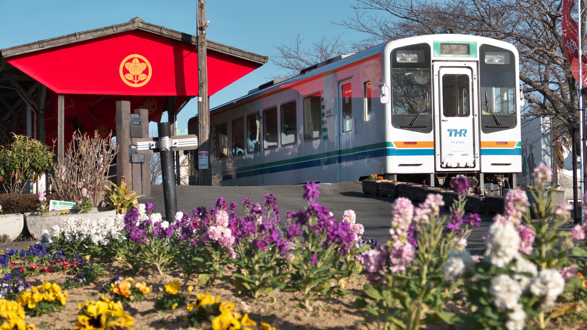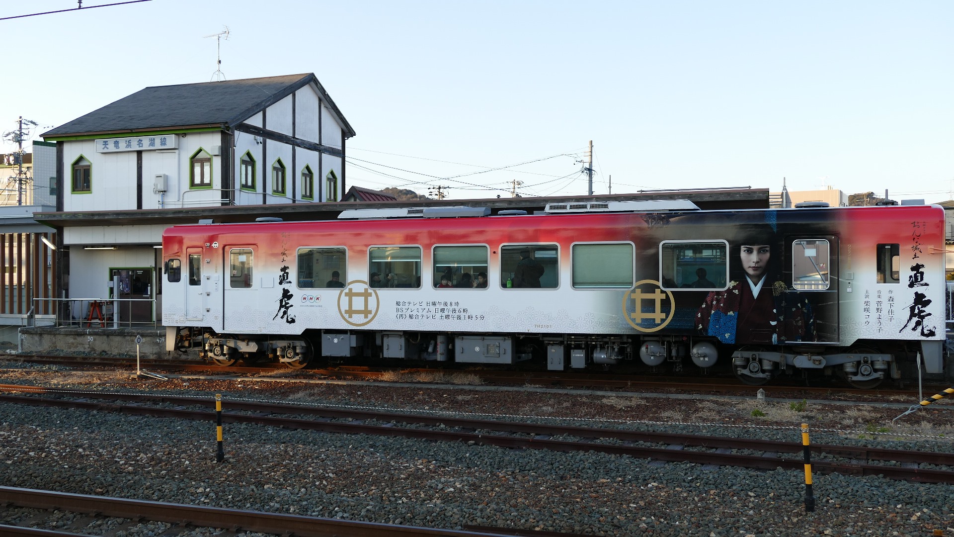 NHK大河ドラマ「おんな城主 直虎」で町興し。「丸に橘」紋が映える気賀駅。 | 上段左:気賀駅。 大河ラッピング列車 三ケ日駅で交換停車中と新所原駅でのスナップ 2017.2.19 |